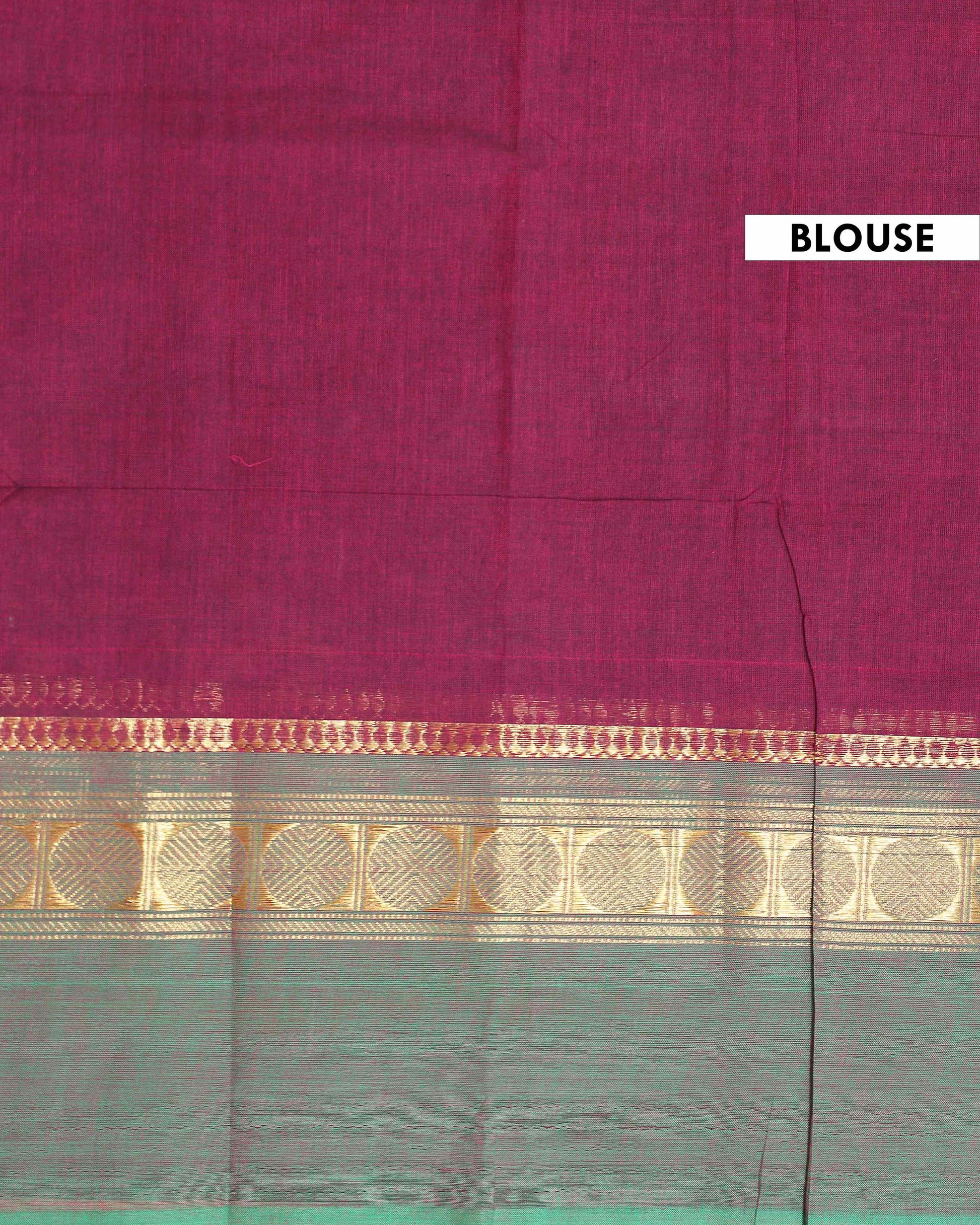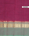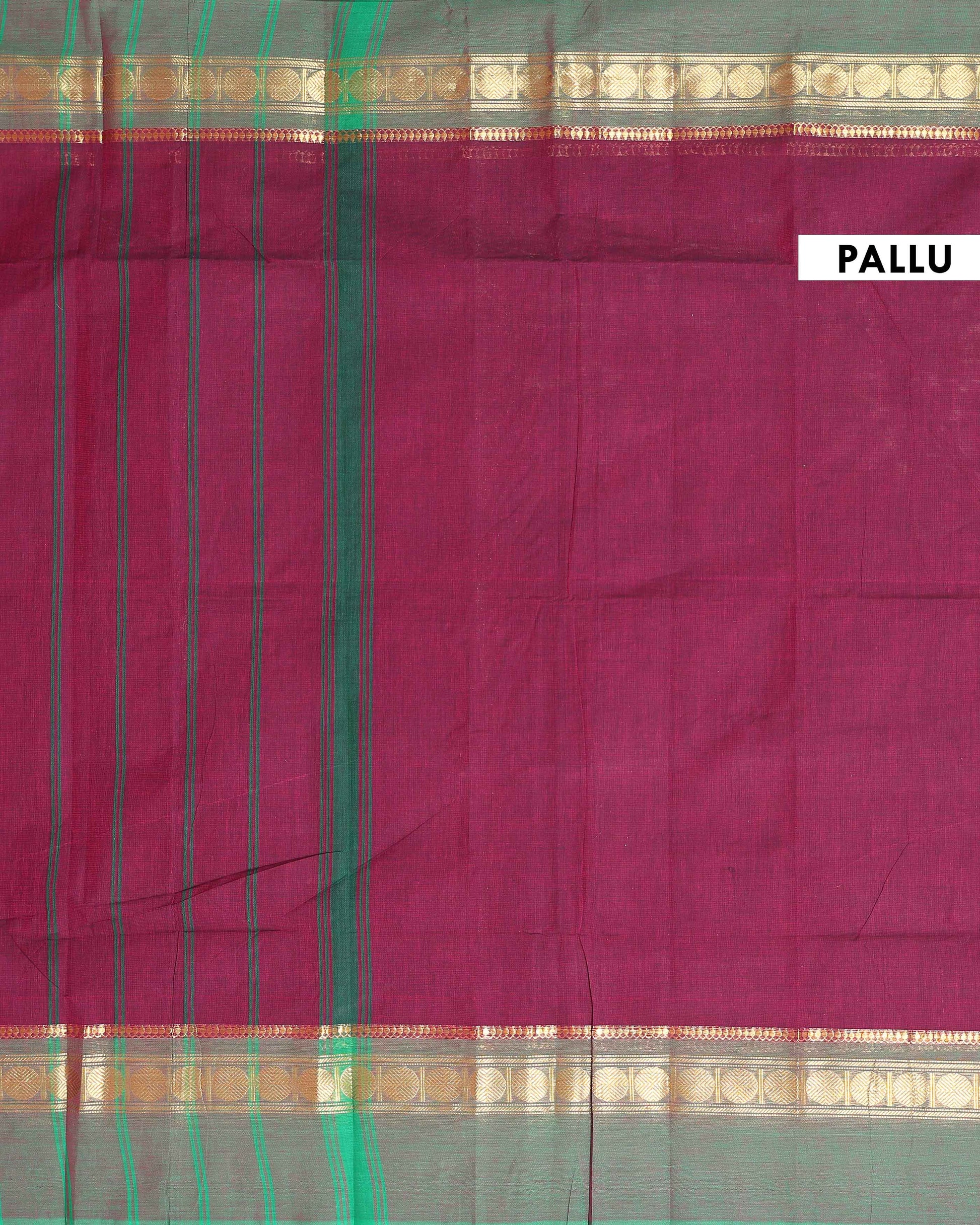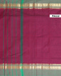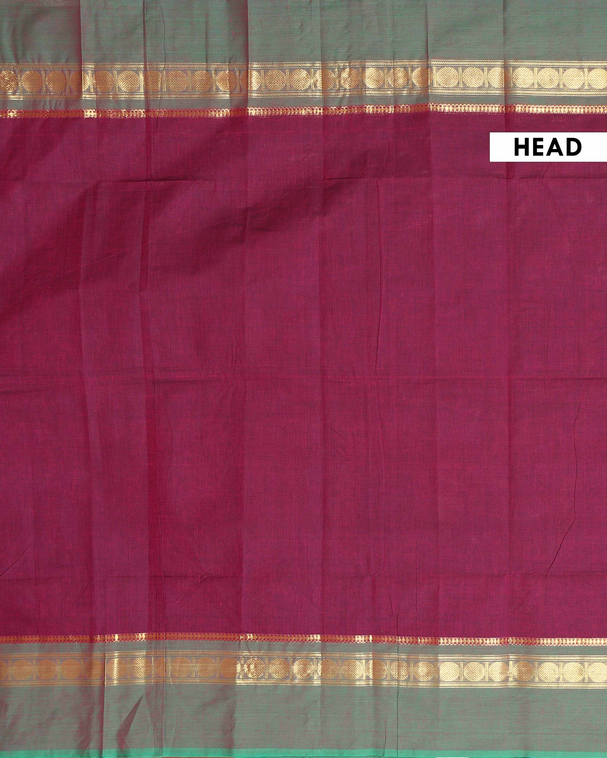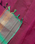 Drape yourself in the timeless elegance of this handloom Kanchi cotton saree, a rich maroon body and contrasting emerald green border.