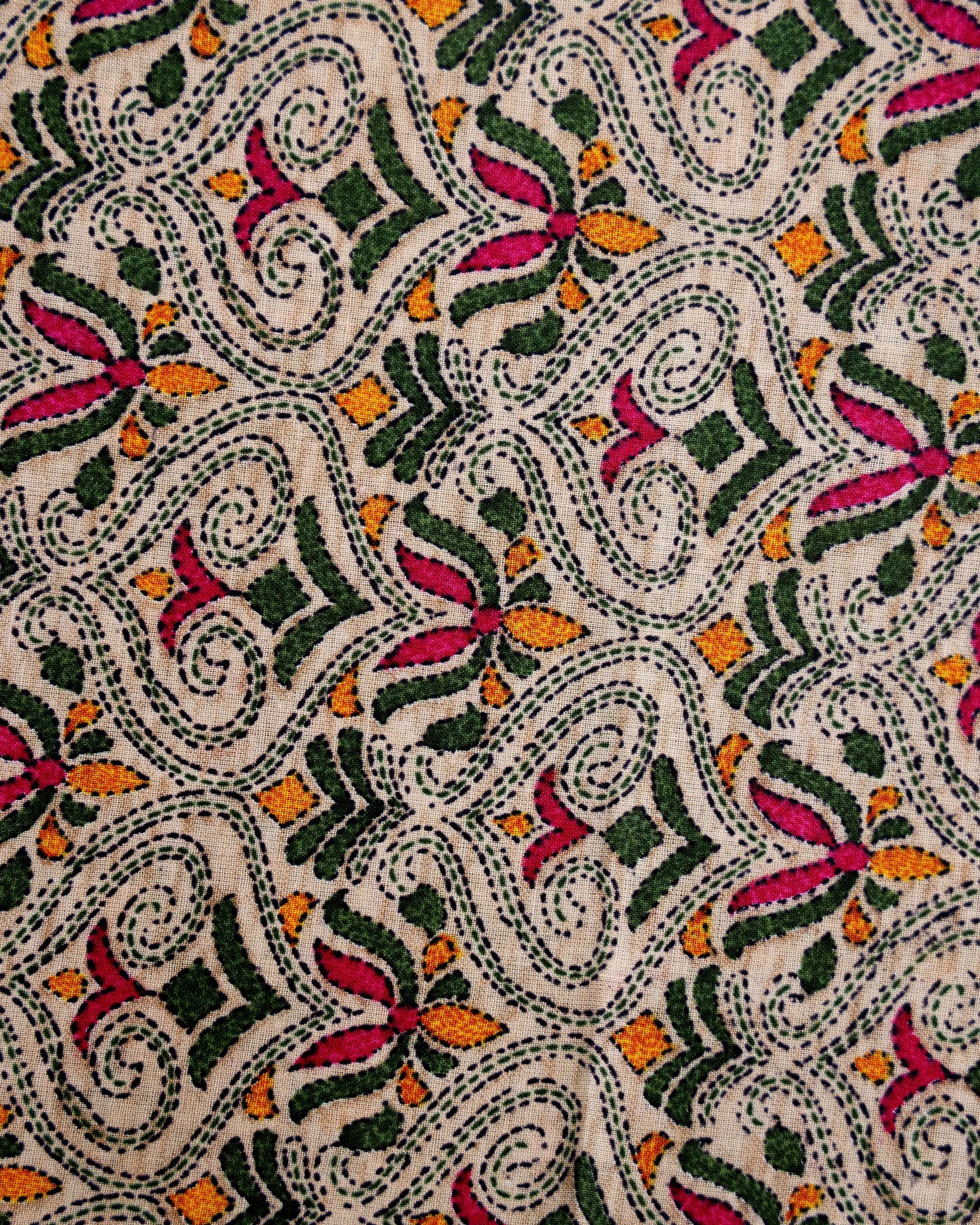 - The saree a subtle texture and is paired with a beautiful printed blouse piece, combining traditional craftsmanship with modern style.