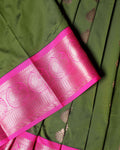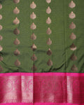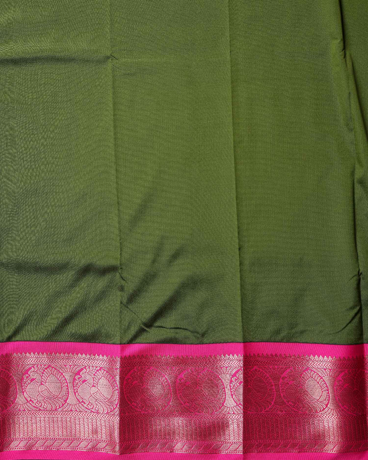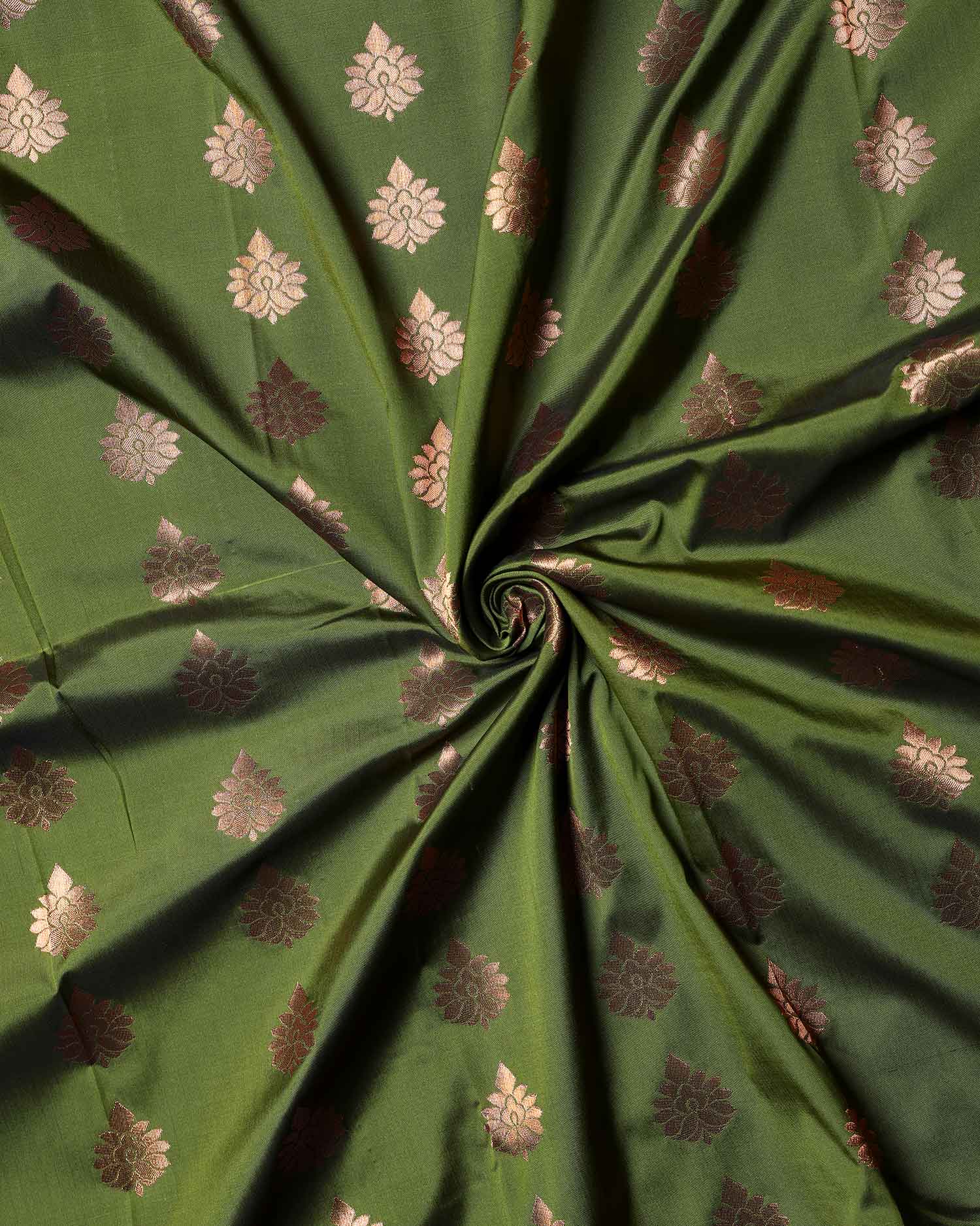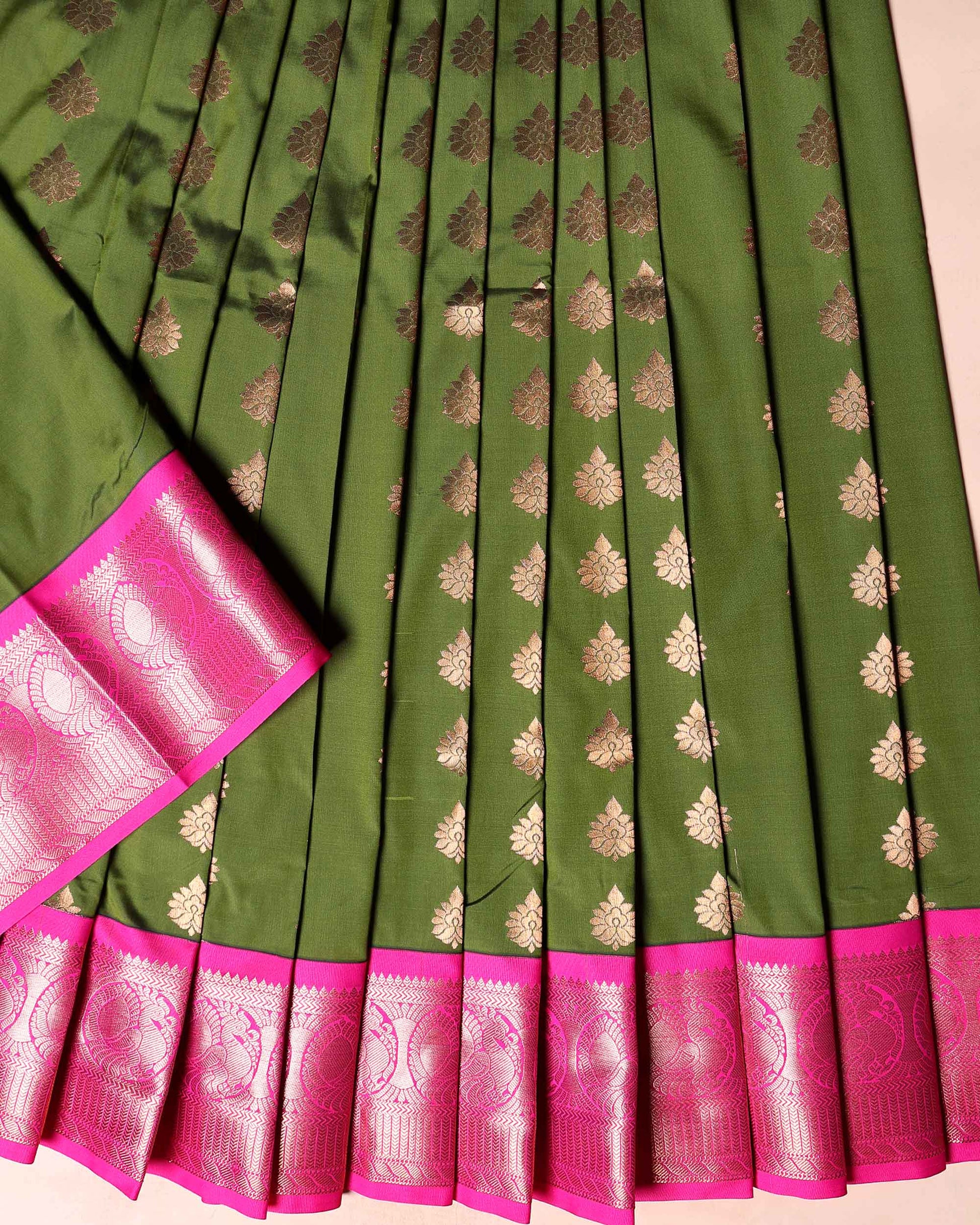 Traditional Kids Pattu Pavadai Material with Zari Floral Buttas and Contrast Peacock Jacquard Border - Green