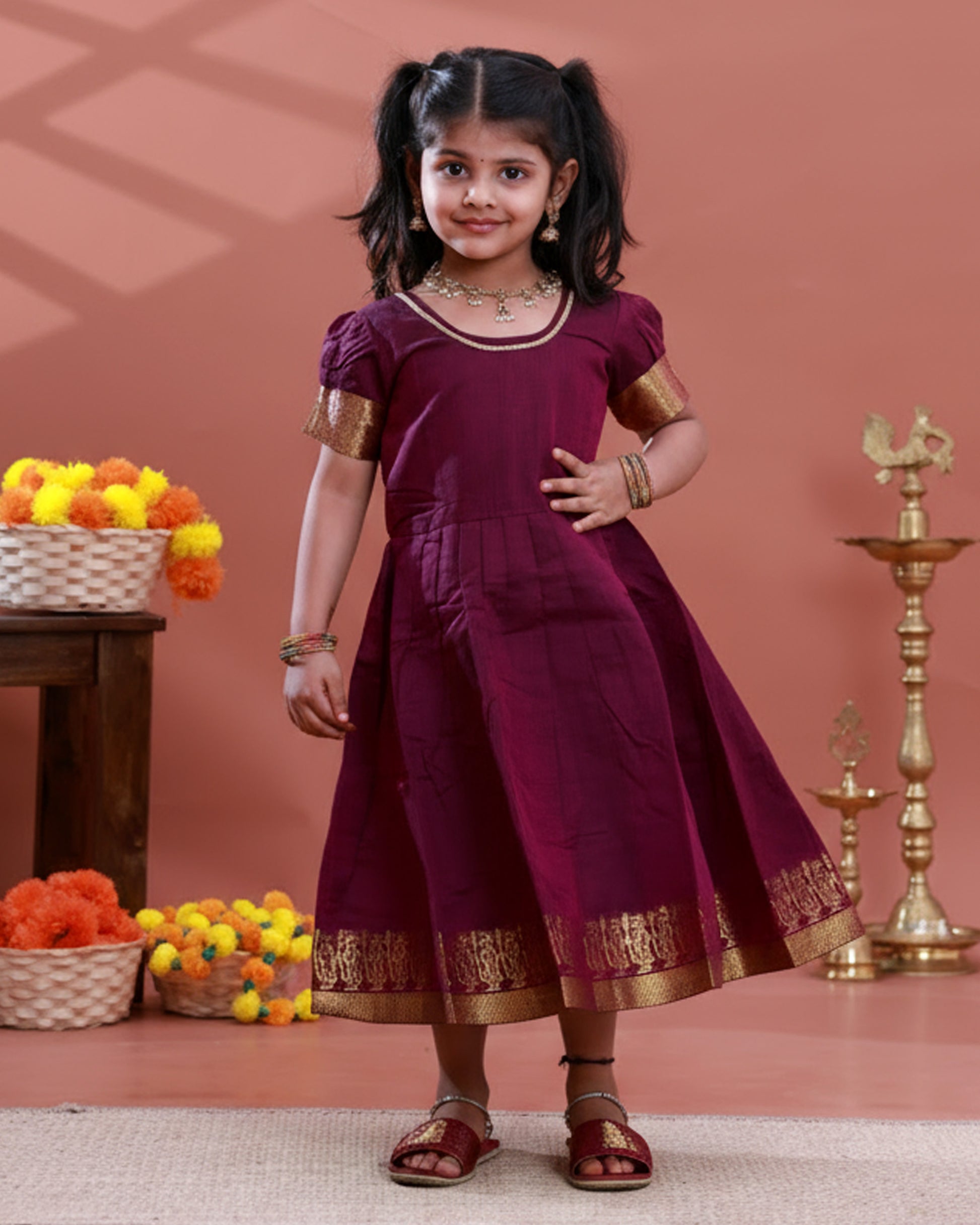Kids Pattu Pavadai Readymade Traditional Ethnic Gown with Zari Border & Puff Sleeves - Purple