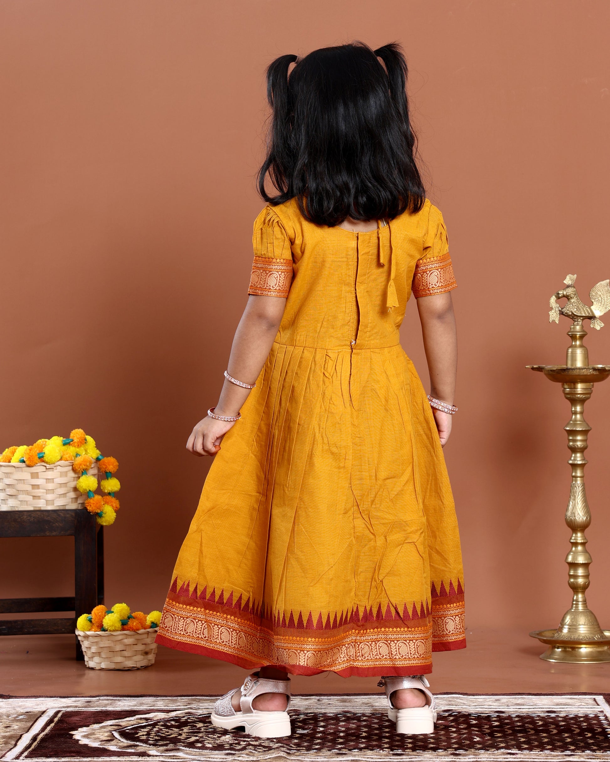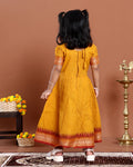 Kids Pattu Pavadai Readymade Traditional Ethnic Gown with Zari Border & Puff Sleeves - Yellow