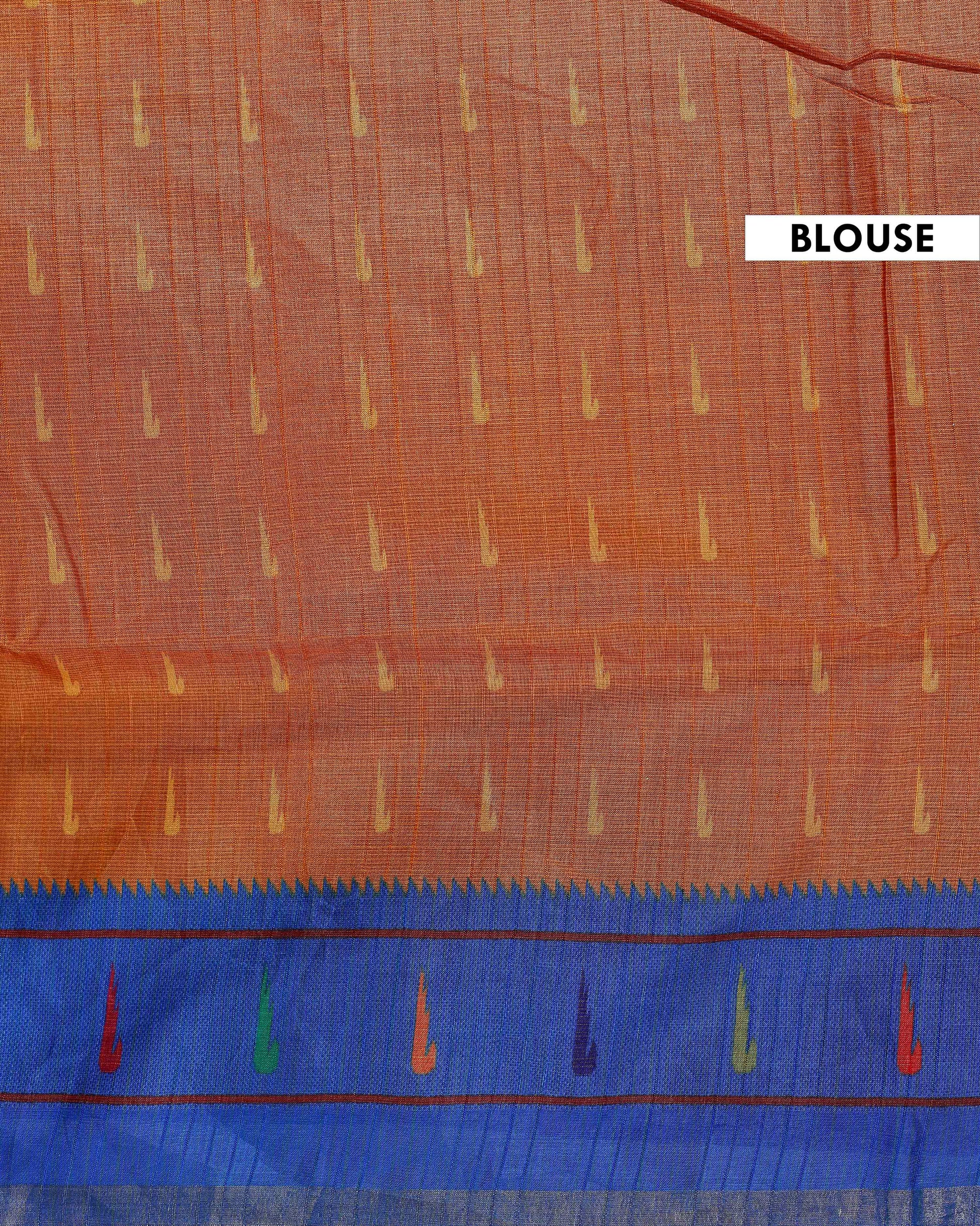 The striking blue border and pallu, accented with golden zari work, add a touch of timeless elegance