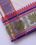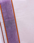- Men's traditional handloom cotton dhoti in off white, featuring a stylish purple and multi color fancy border with traditional motifs