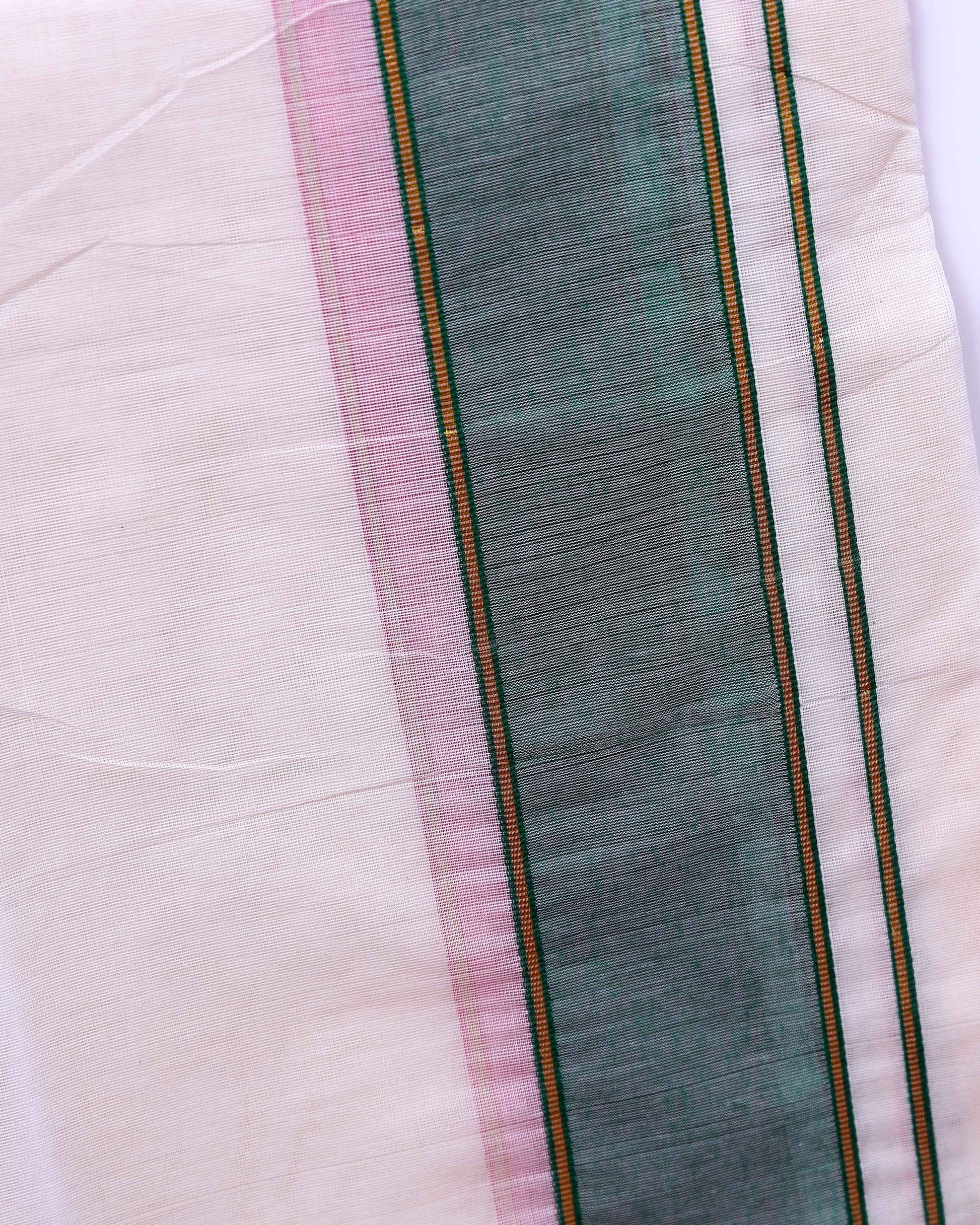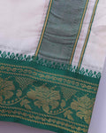 - Men's traditional white cotton dhoti featuring an elegant green and gold border, perfect for festive occasions and cultural events.