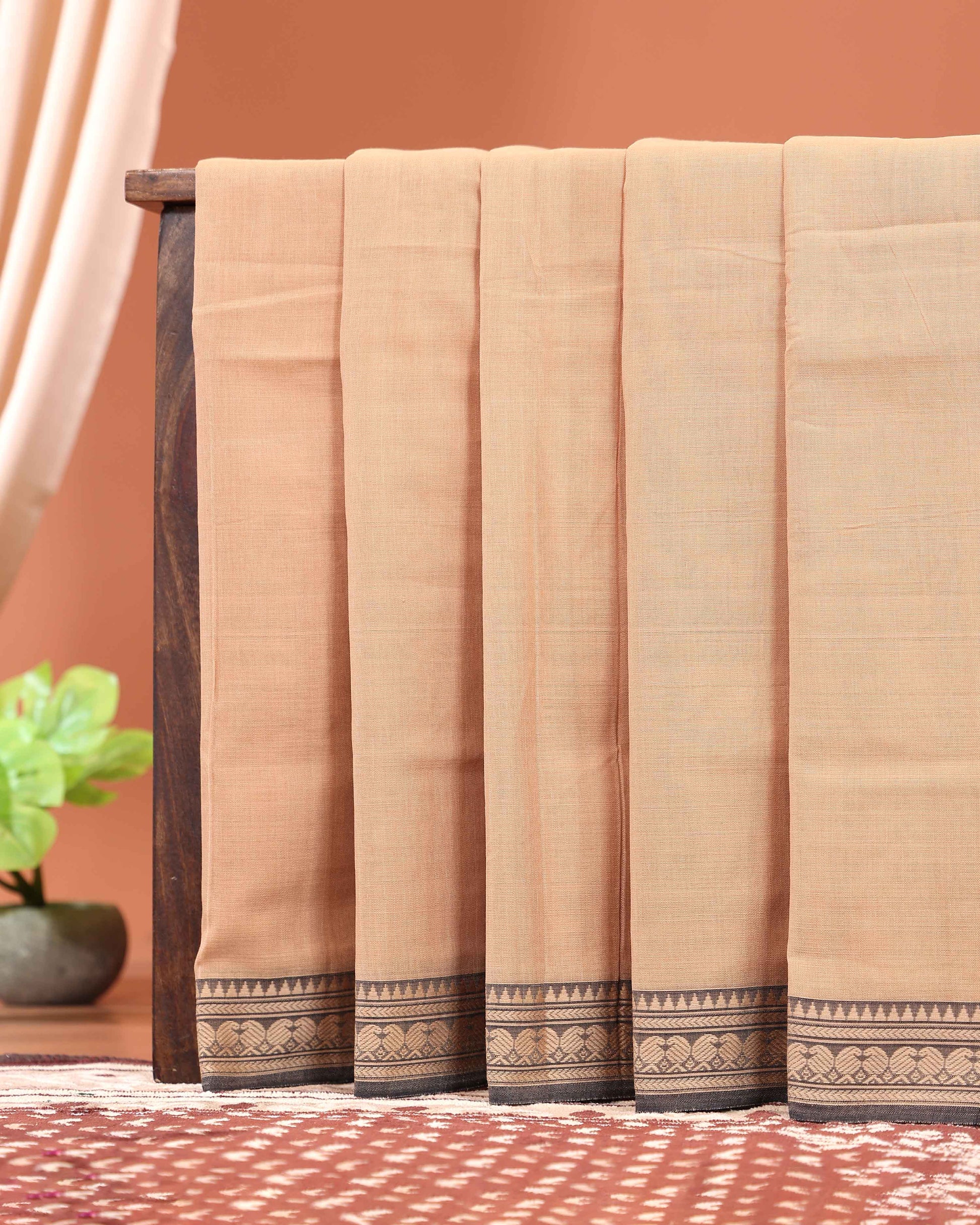 - This elegant Narayanpet Cotton Saree a subtle striped pattern and a traditional temple border, perfect for a sophisticated look