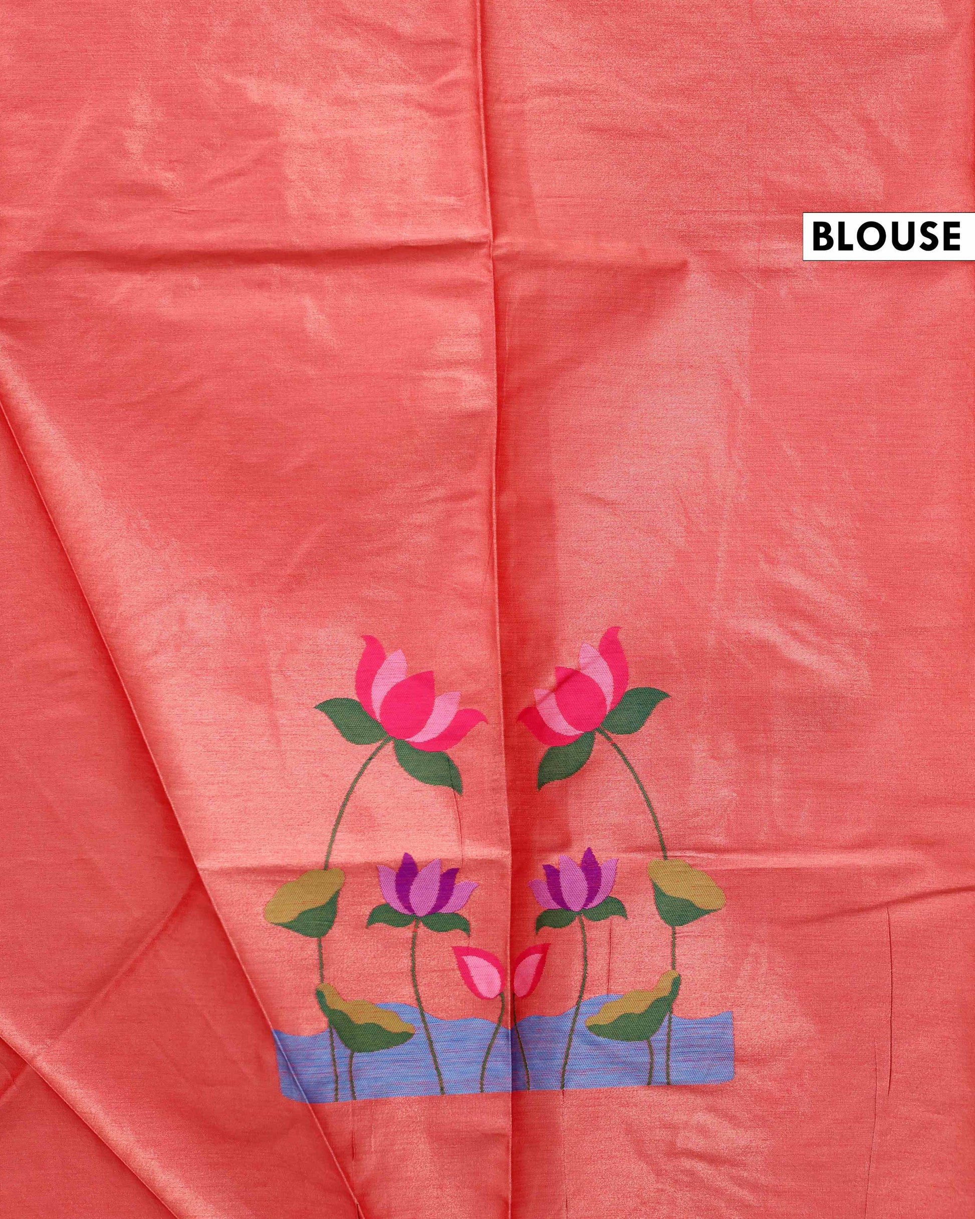 - This elegant handwoven saree enchants with intricate zari woven buttas and a distinct border design.