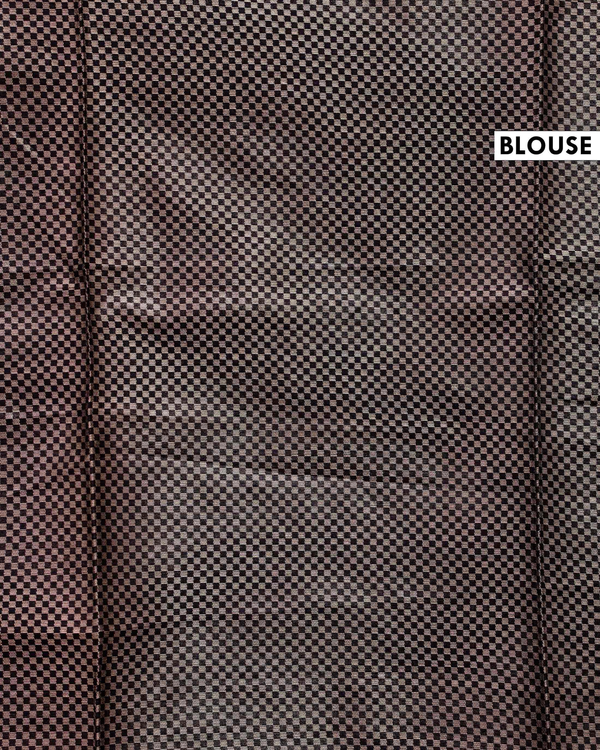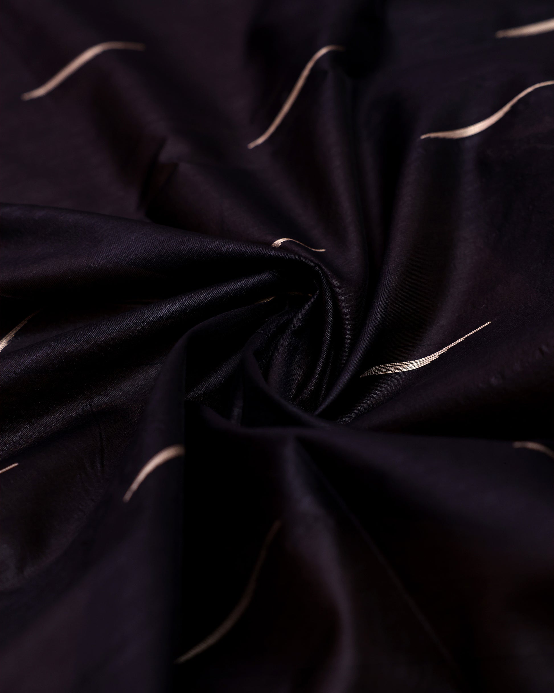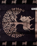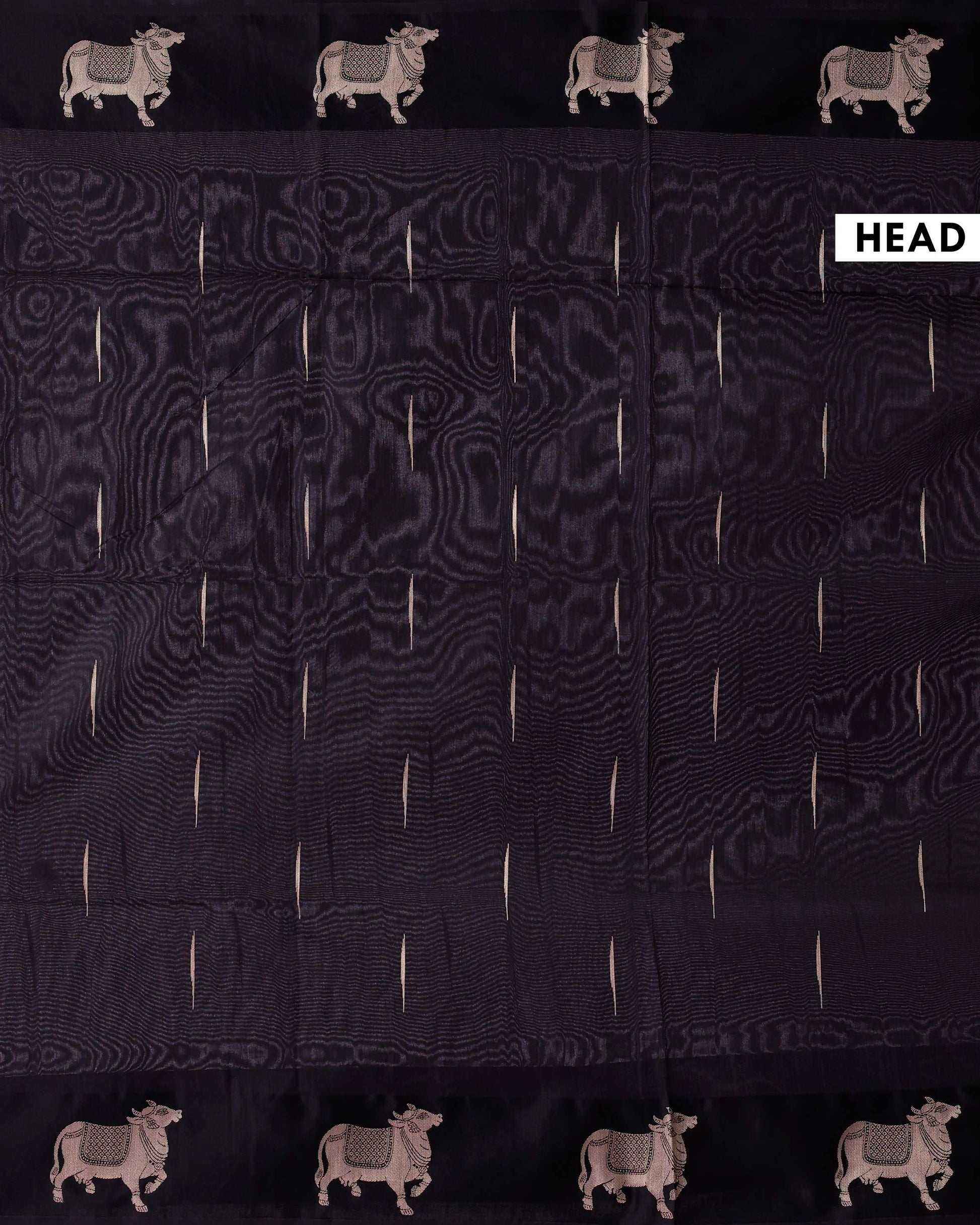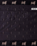 - Embrace timeless elegance with this exquisite Black Raw silk saree traditional cow motifs on the border and delicate line work throughout.