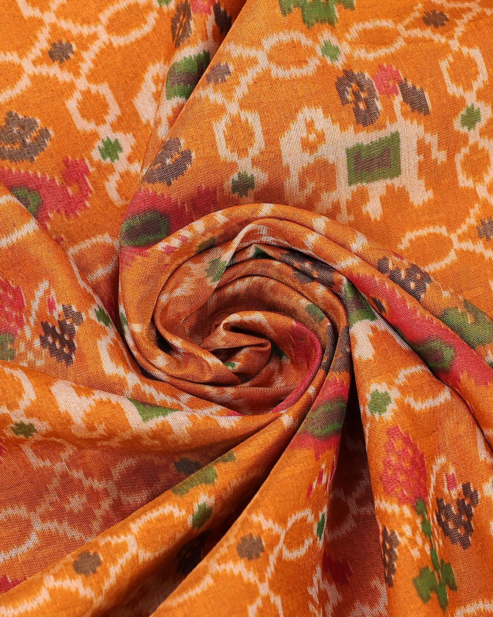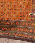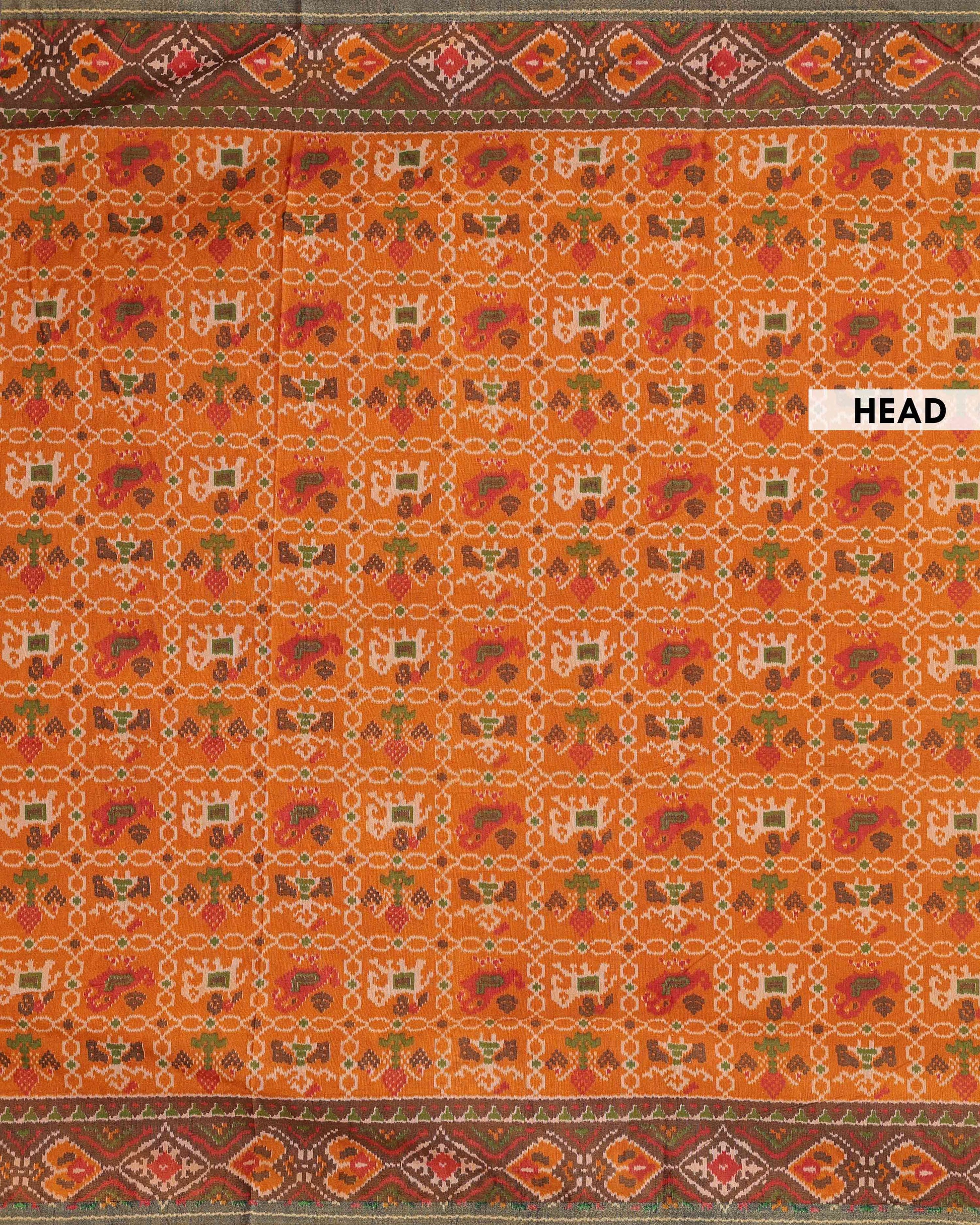 - This exquisite Patola Silk Saree a vibrant orange body with intricate double ikat weaving and a rich, contrasting border