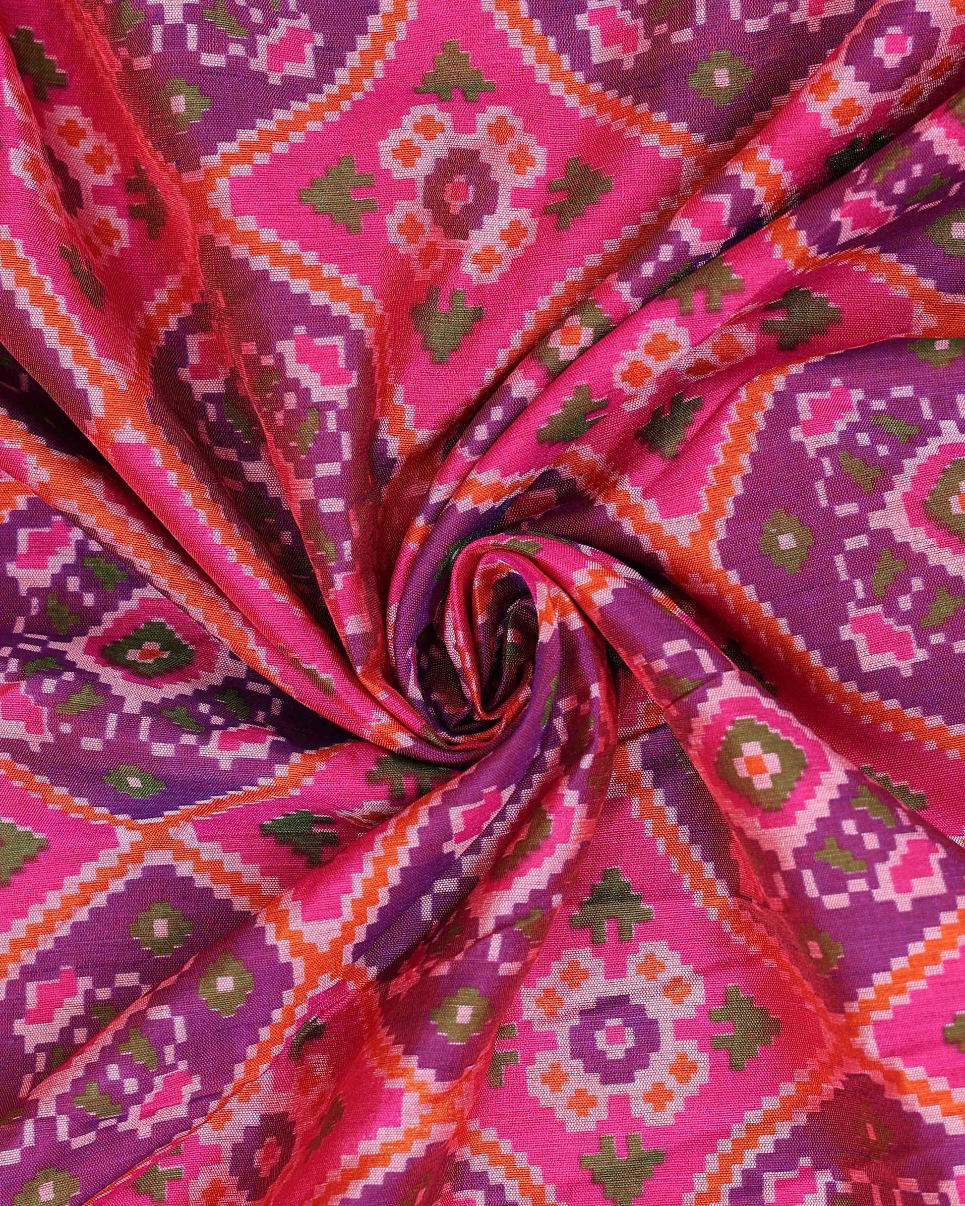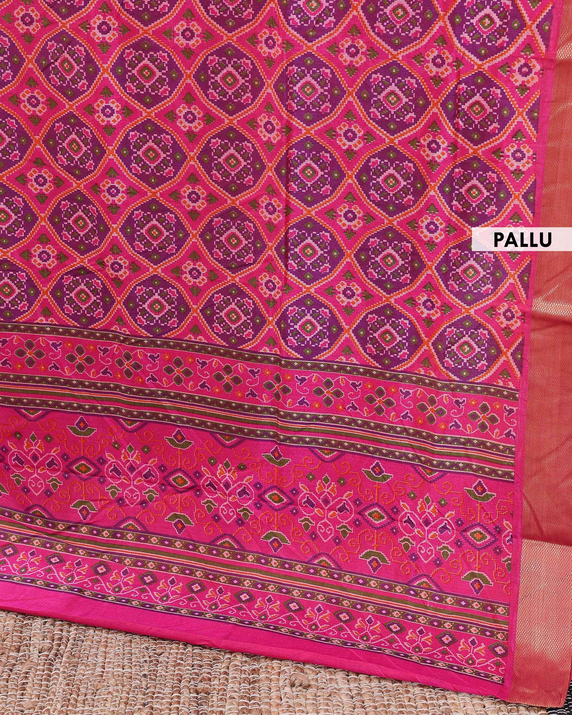 - Embrace timeless tradition with this exquisite Patola Silk Saree, a vibrant pink and intricate geometric patterns