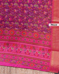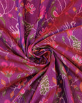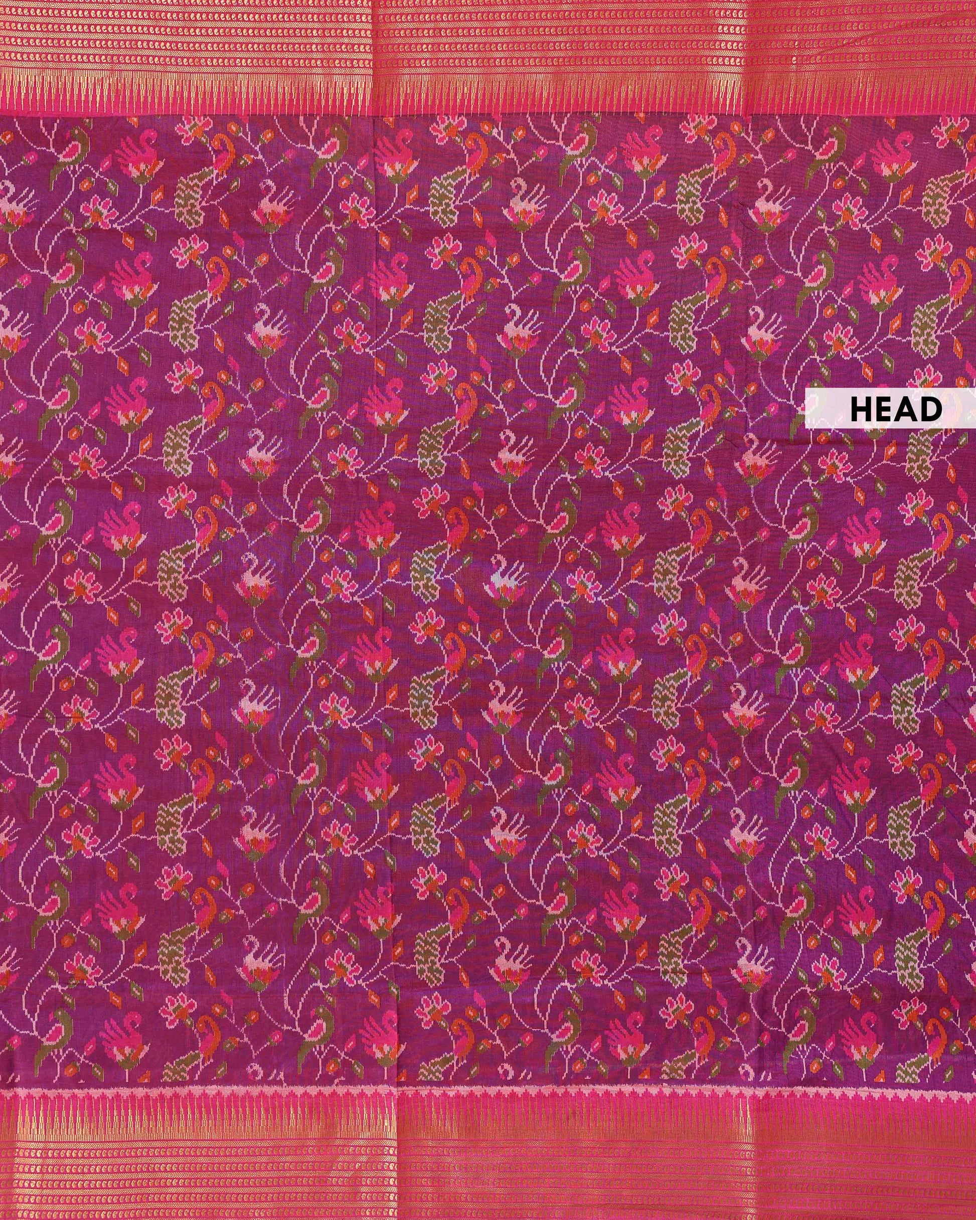- This vibrant Patola silk saree, a rich purple body with intricate floral and bird motifs, is a masterpiece of traditional Indian weaving.