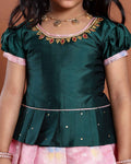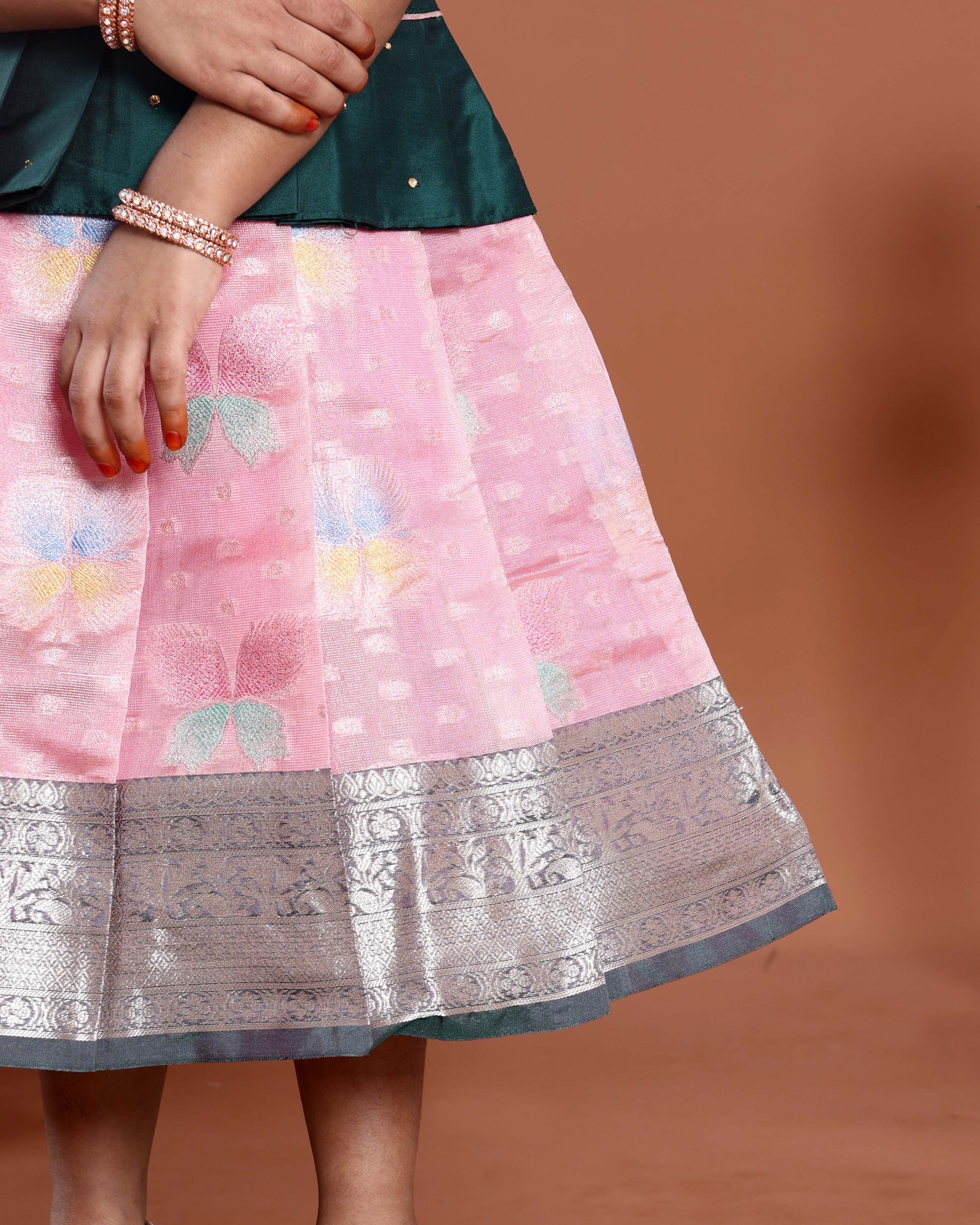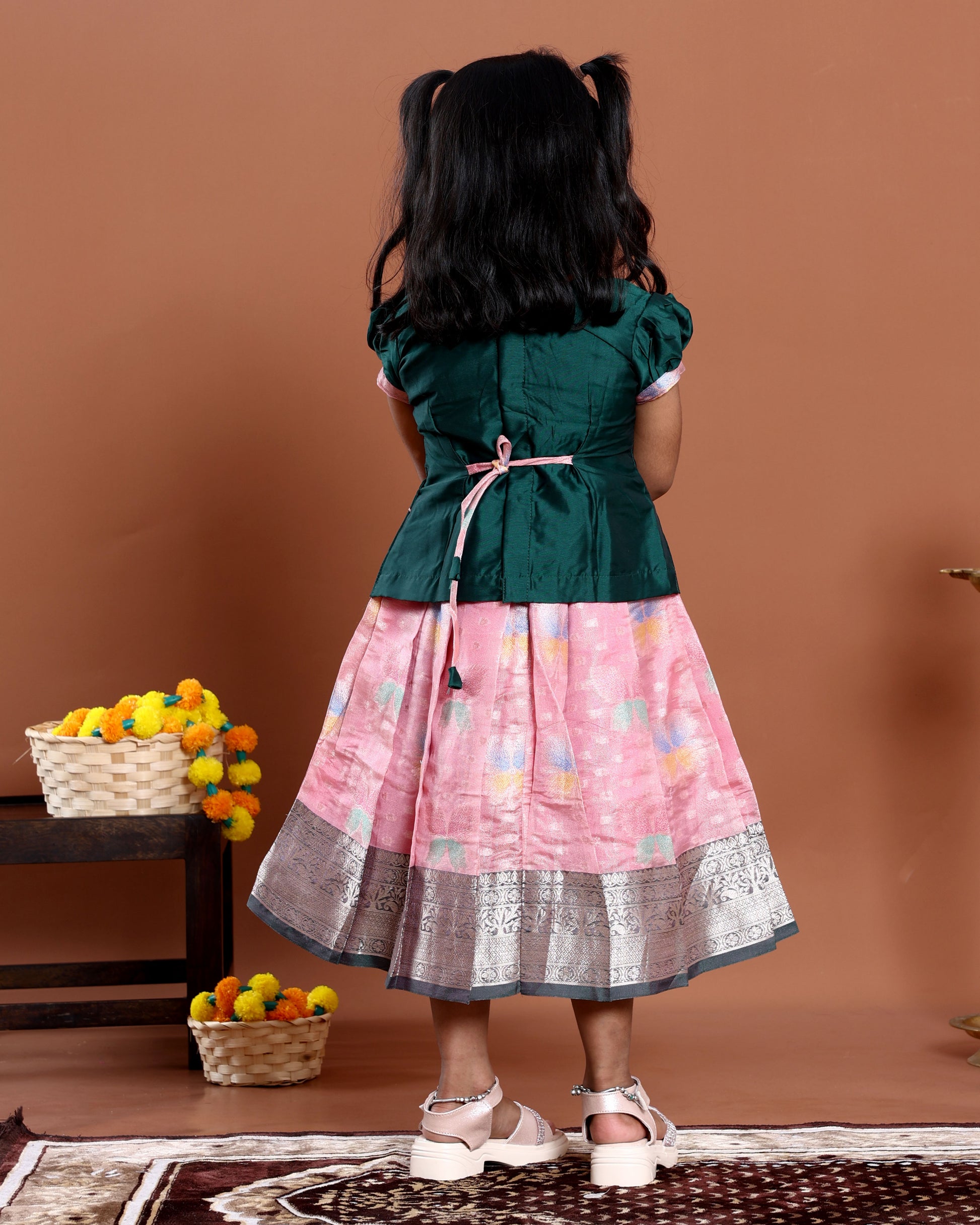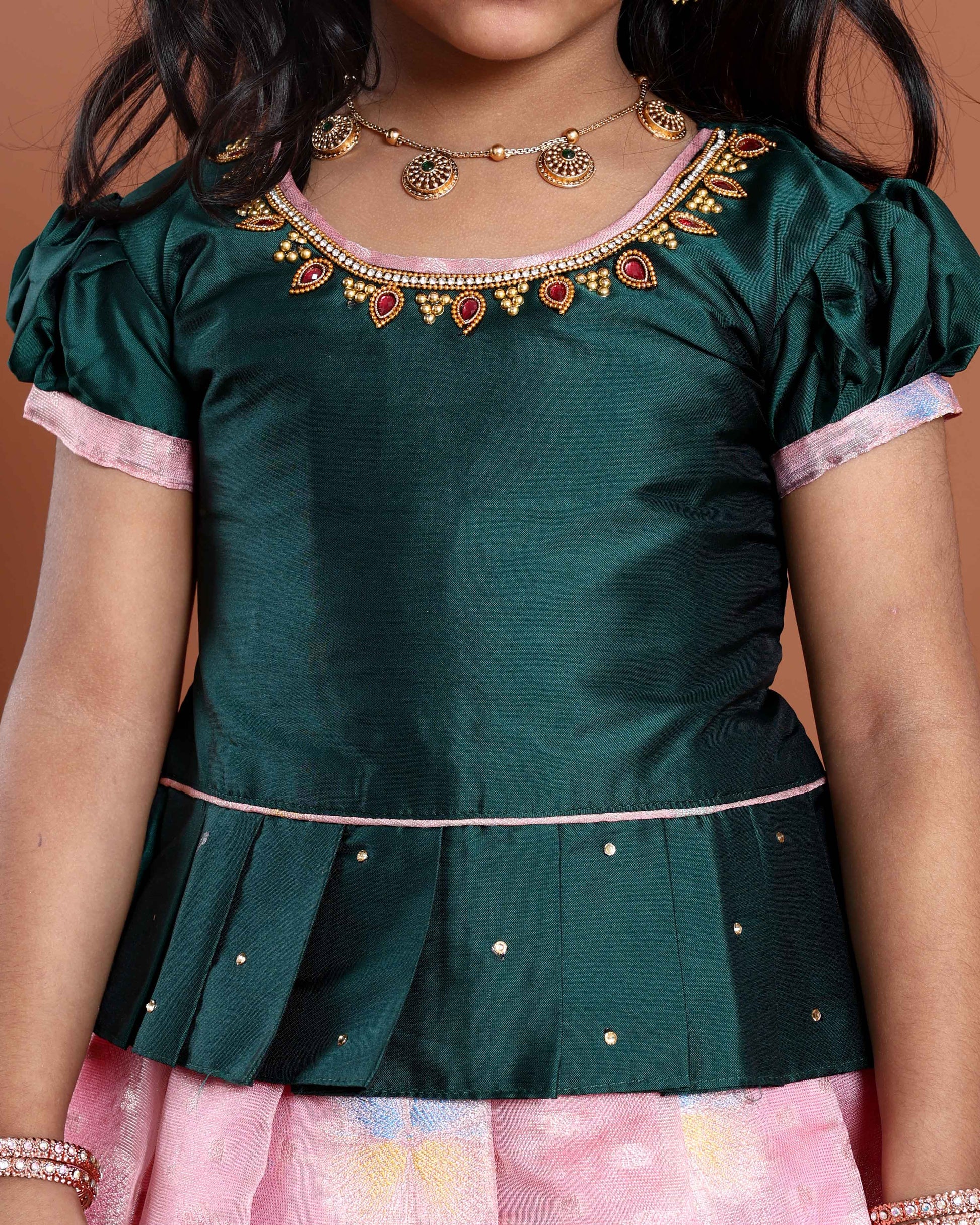 Traditional Pattu Pavadai Set With Zari Woven Skirt And Embroidered Blouse - Green