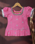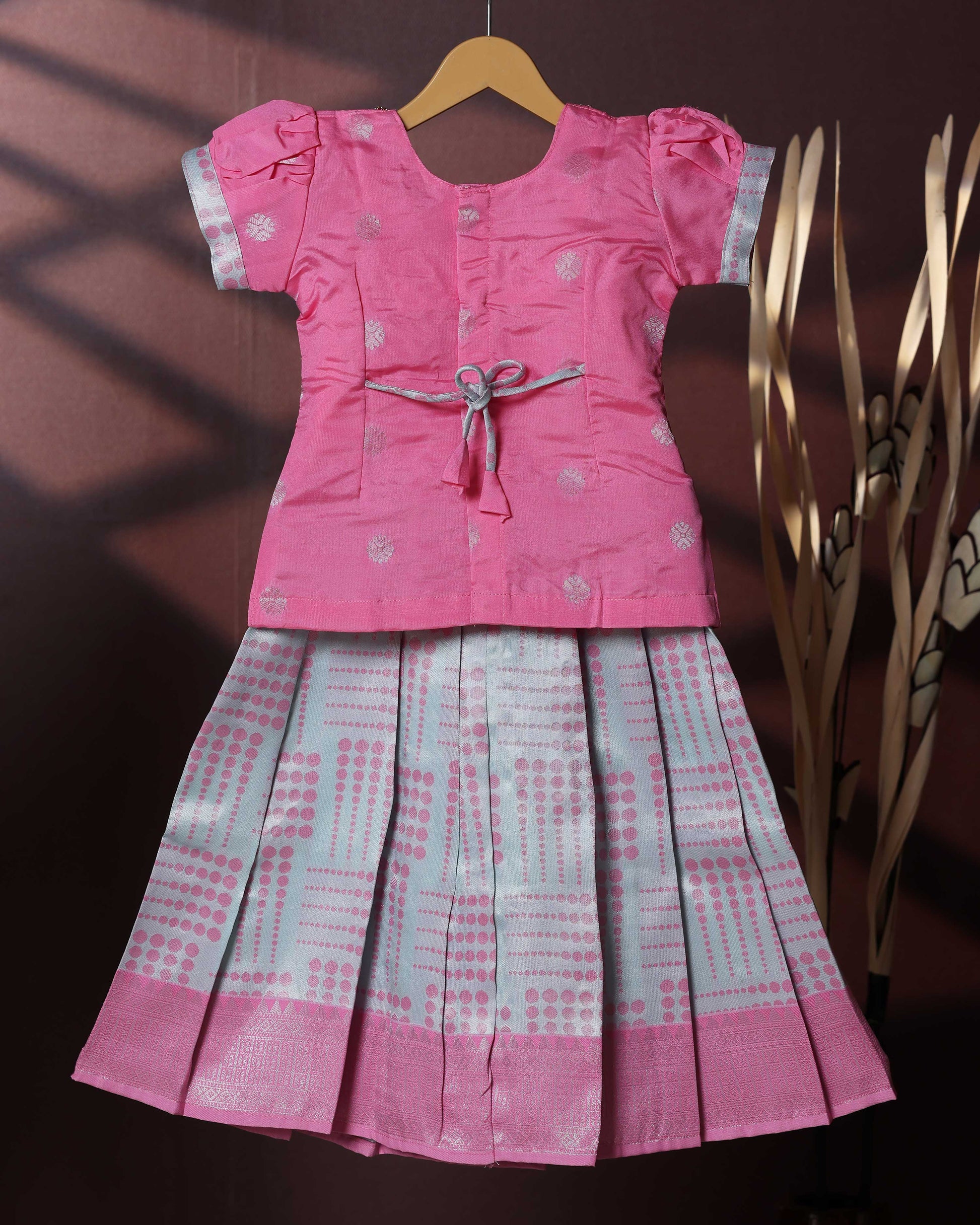 Traditional Pattu Pavadai Set With Zari Woven Skirt And Embroidered Blouse- Pink