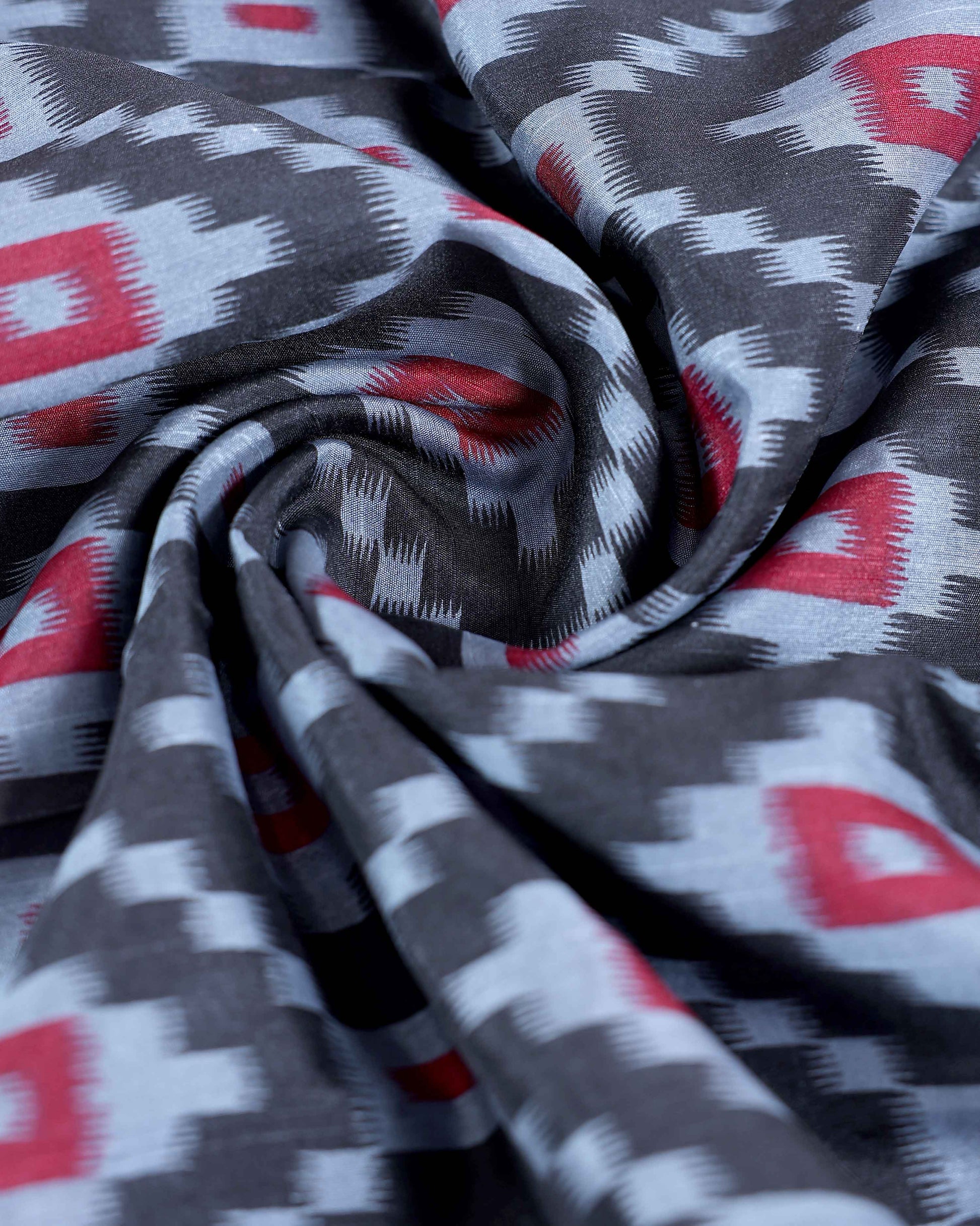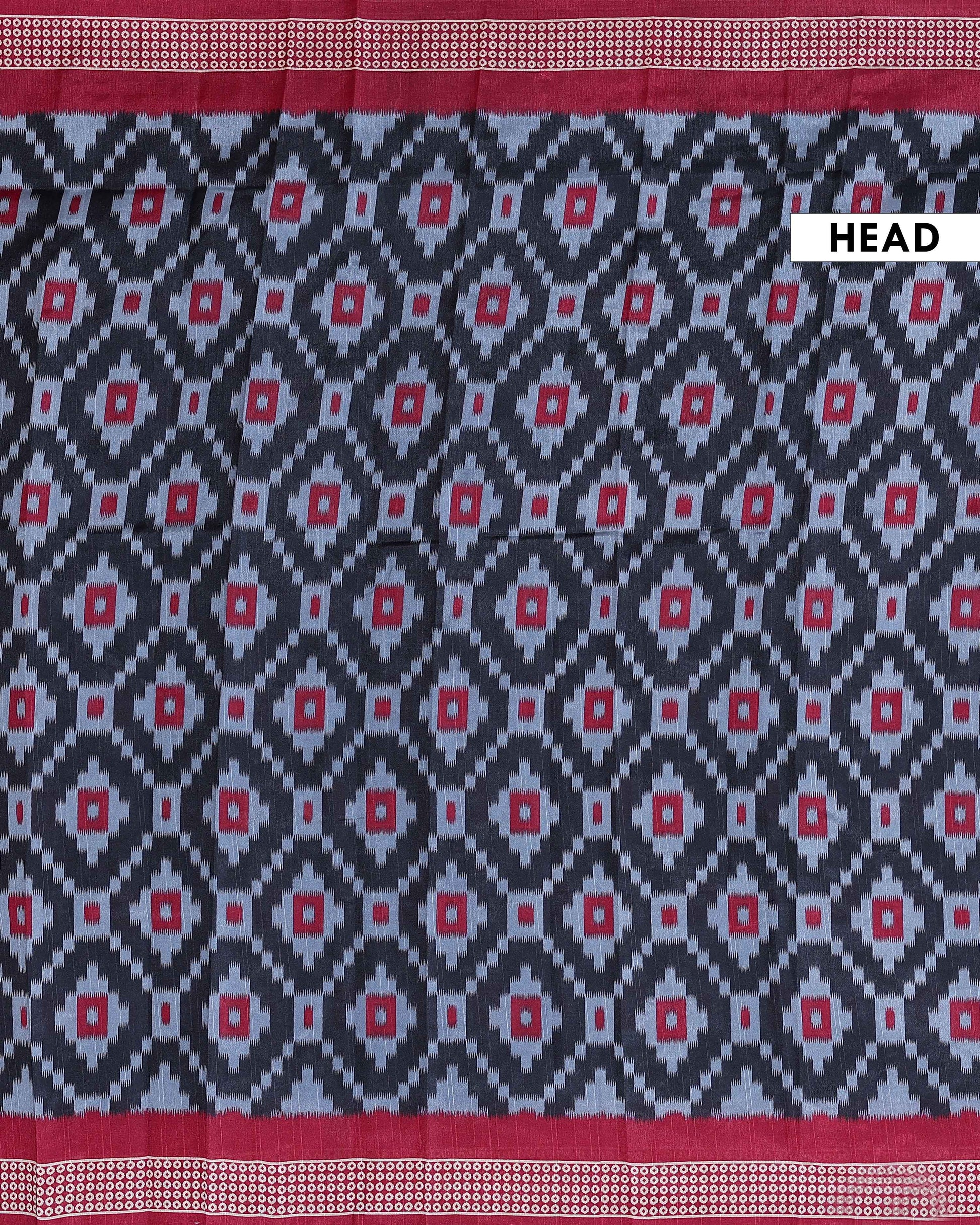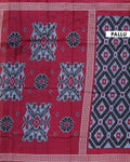 - This handwoven Pochampally Ikat saree features a stunning double Ikat geometric pattern in shades of black and grey, complemented by a rich maroon border with intricate motifs