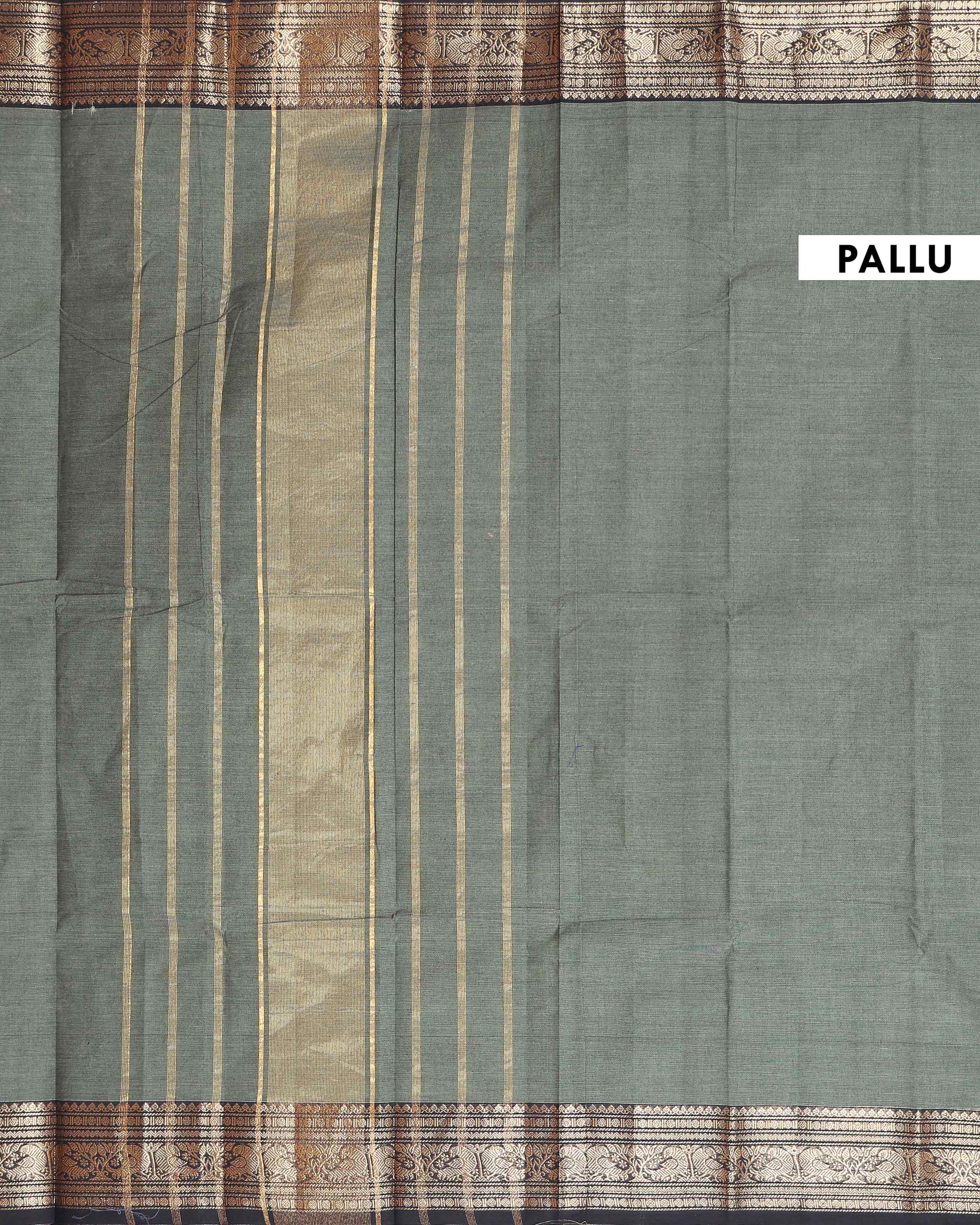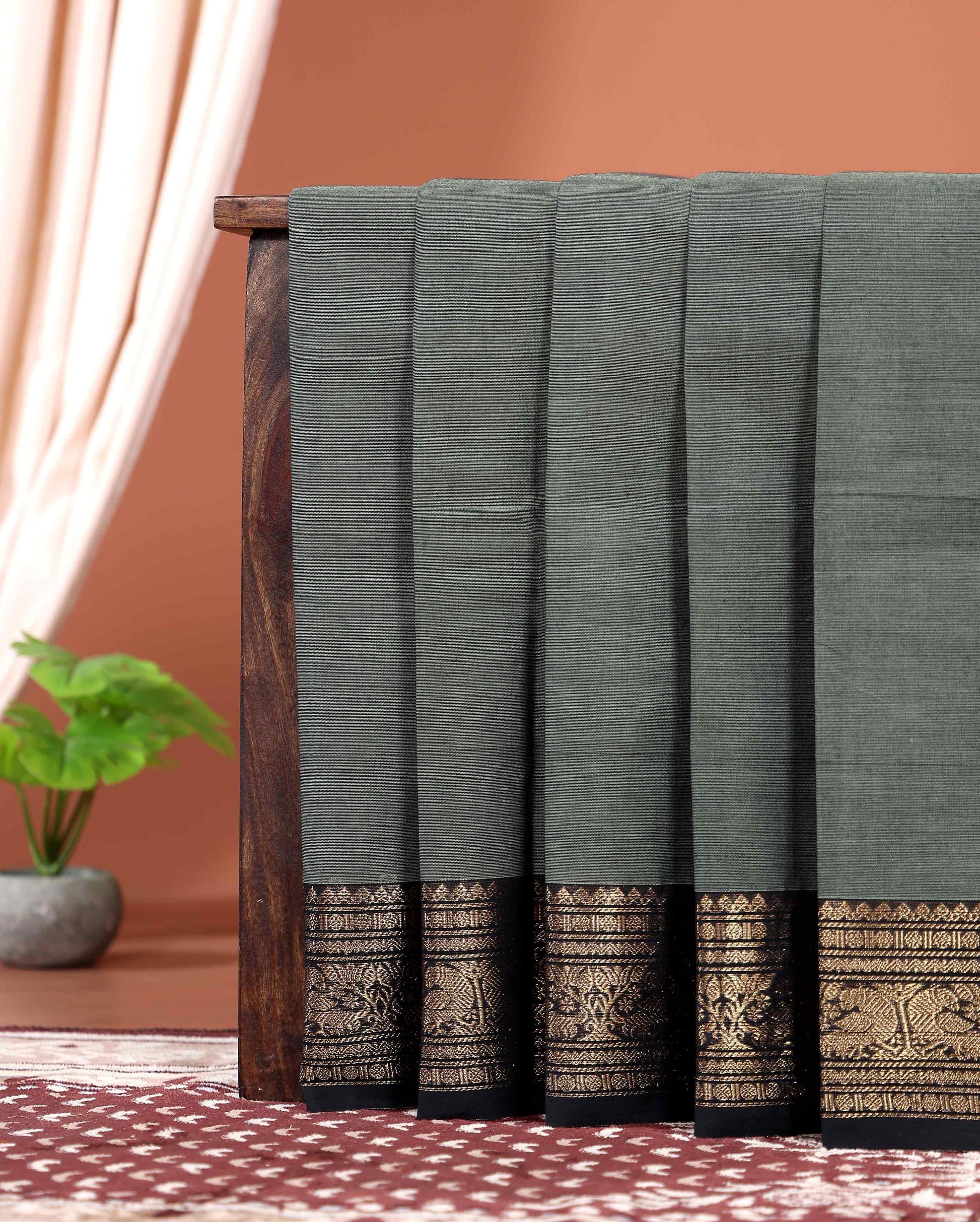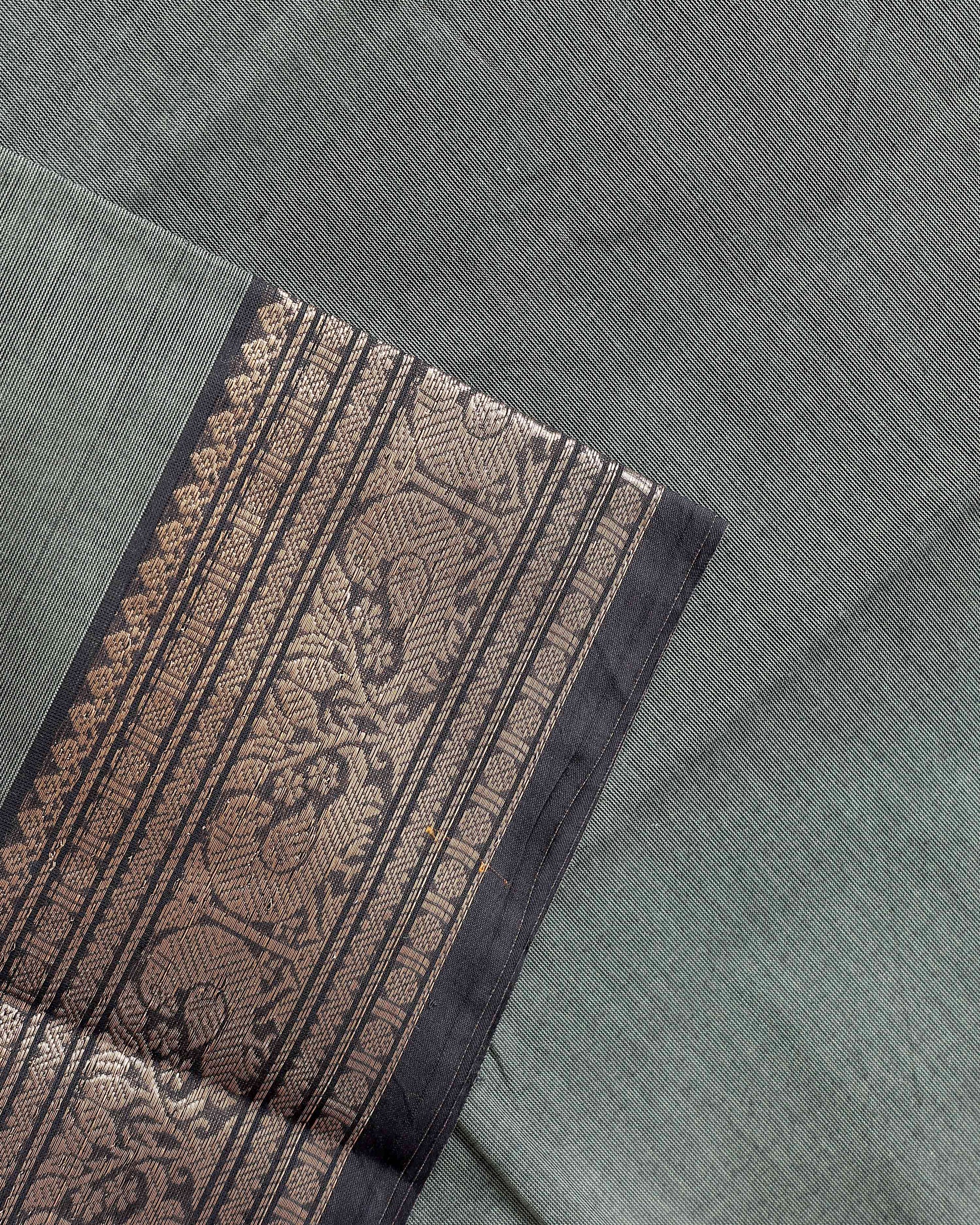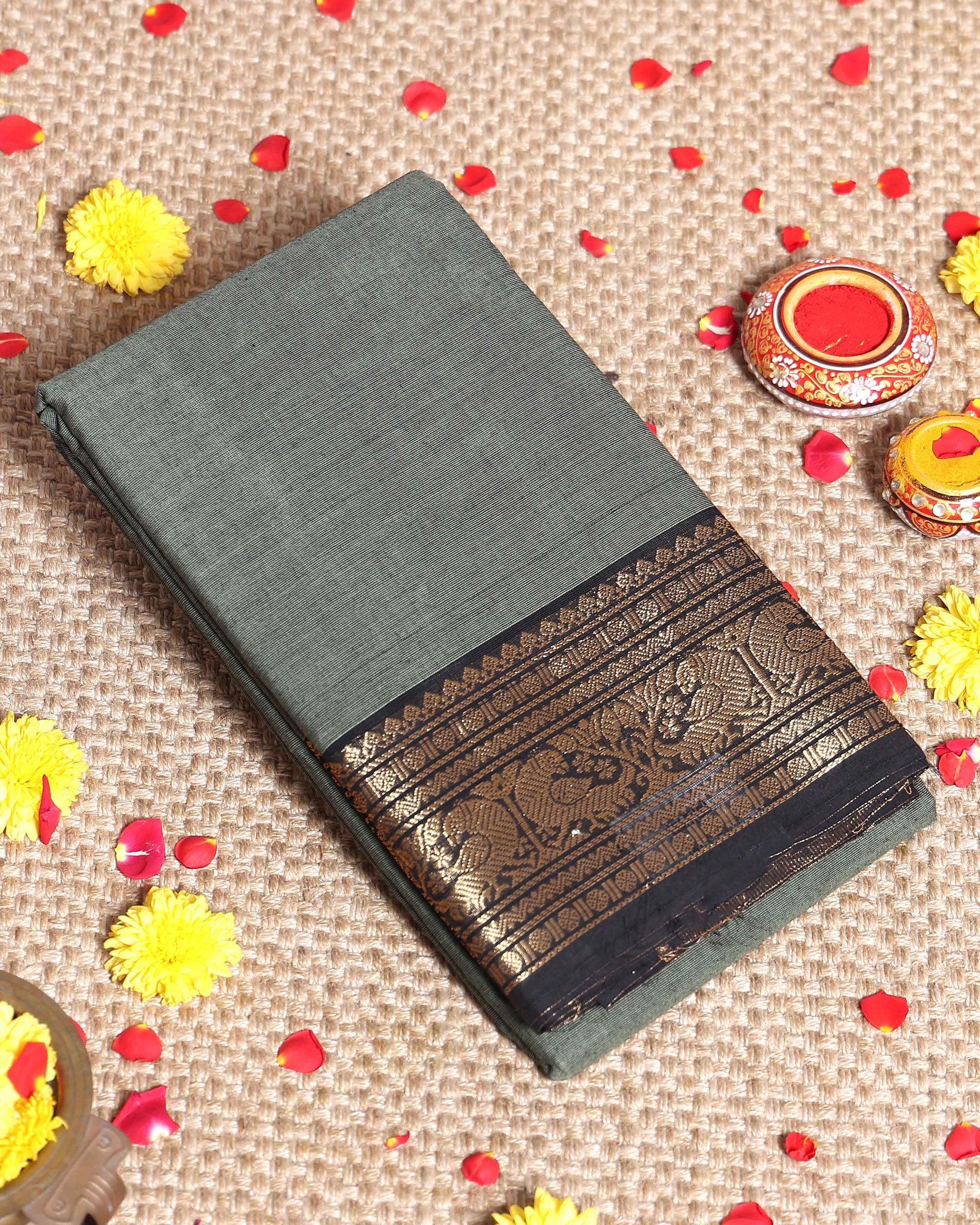 - Elevate your traditional wardrobe with this stunning Pastel Green Kanchi cotton saree an elegant black and gold detailed border