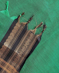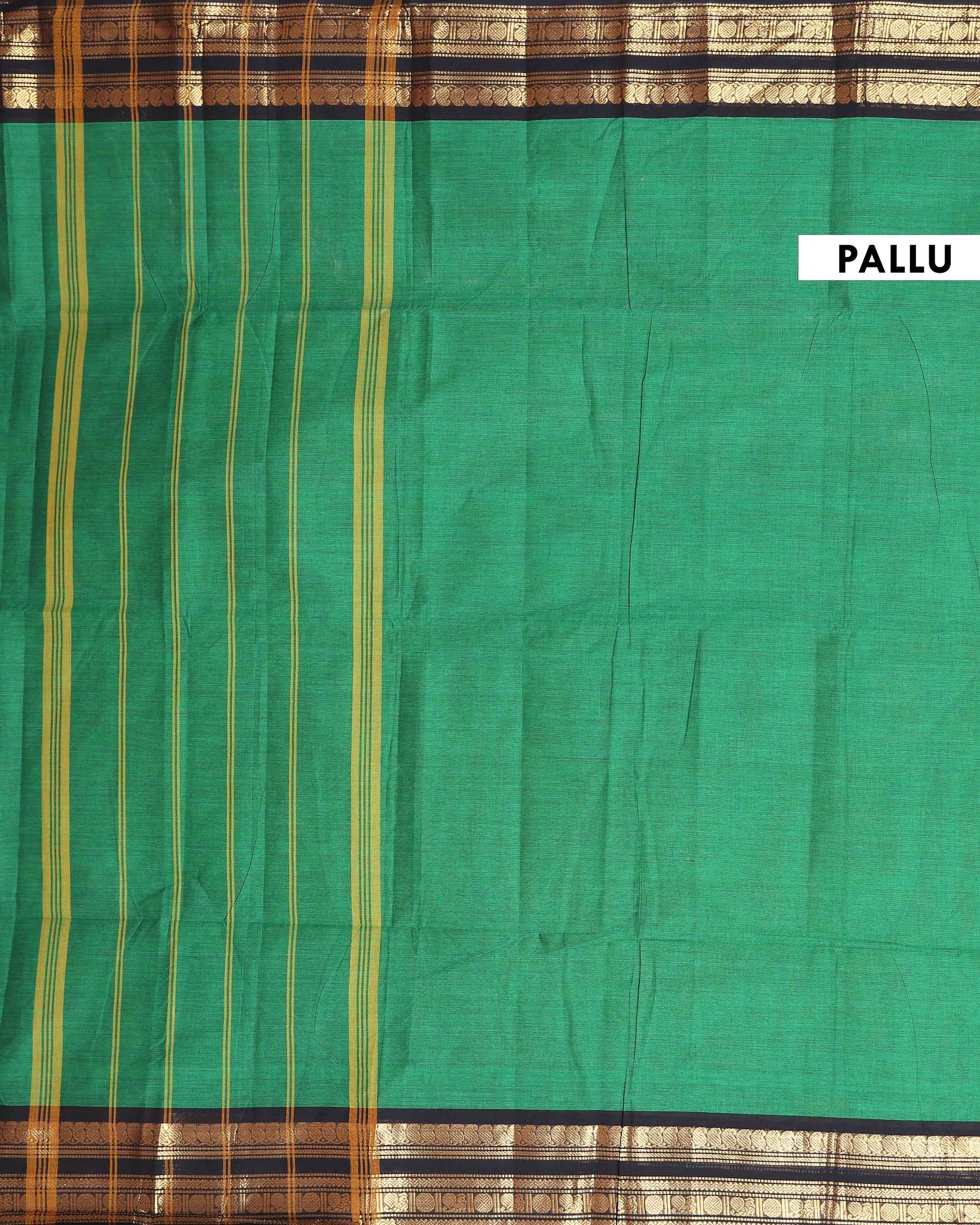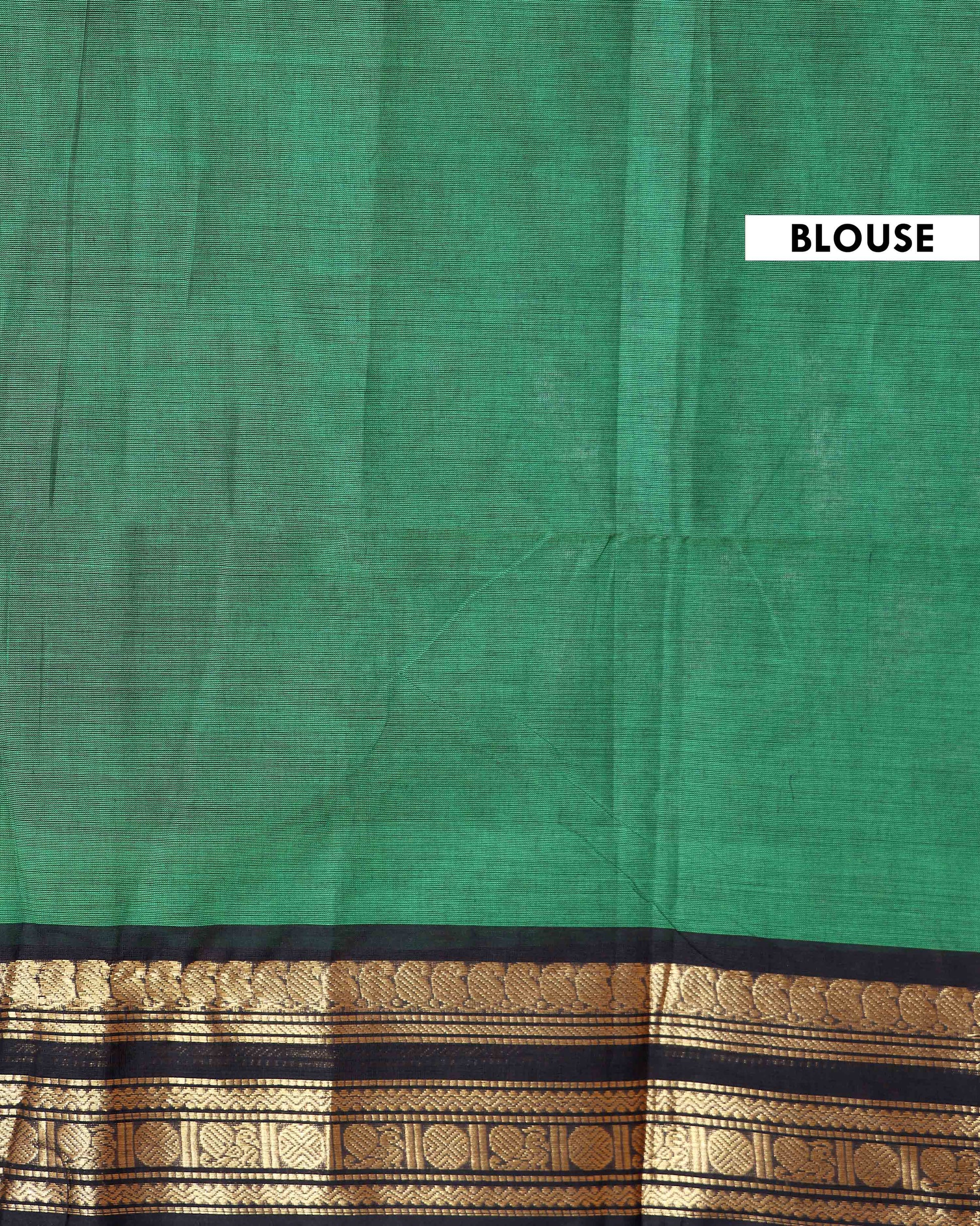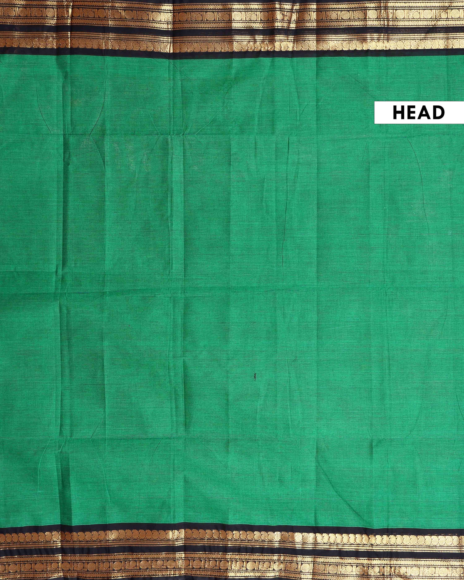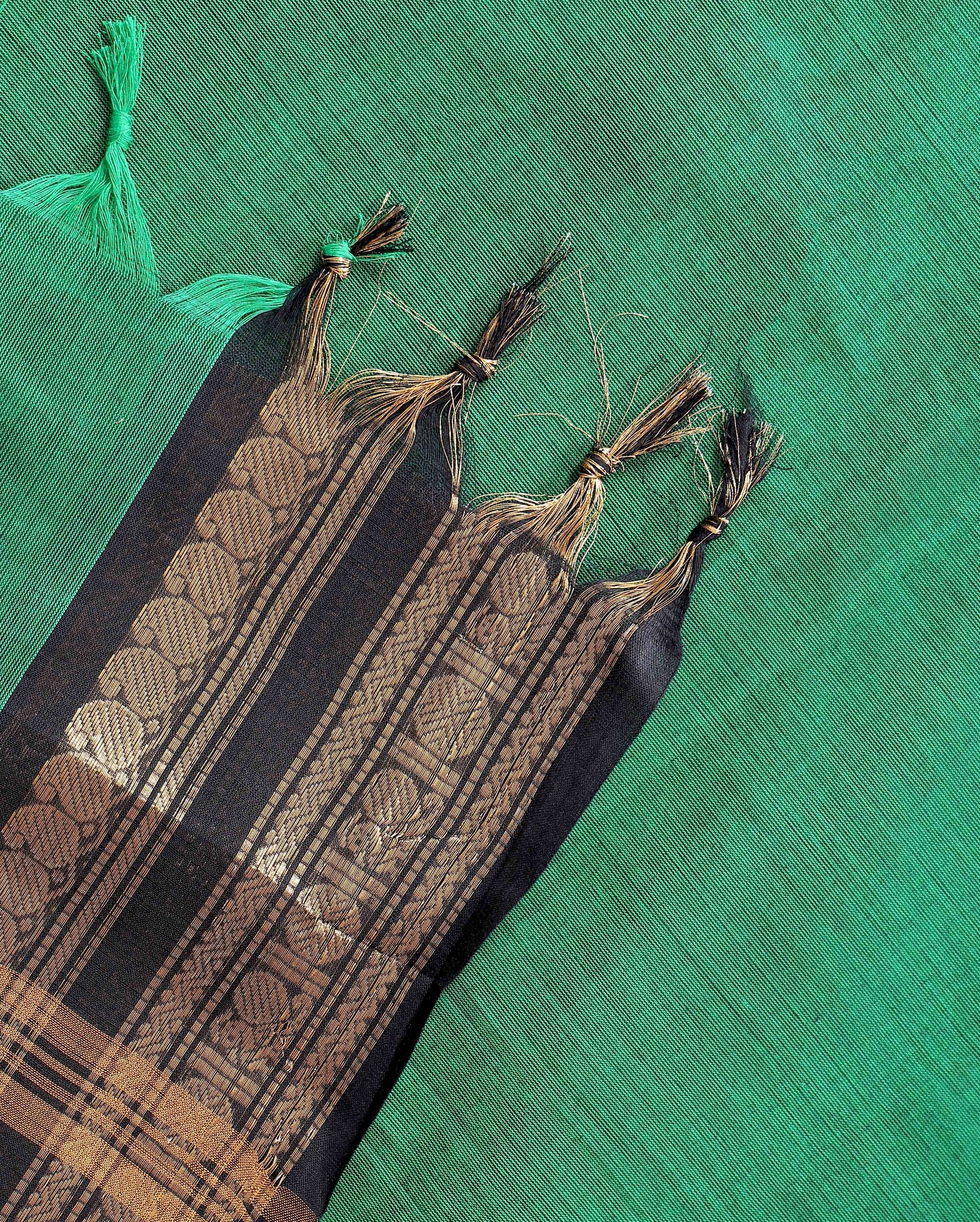 - Drape yourself in tradition with this stunning Kanchi cotton saree a vibrant green and an elegant black border with intricate gold zari work