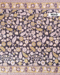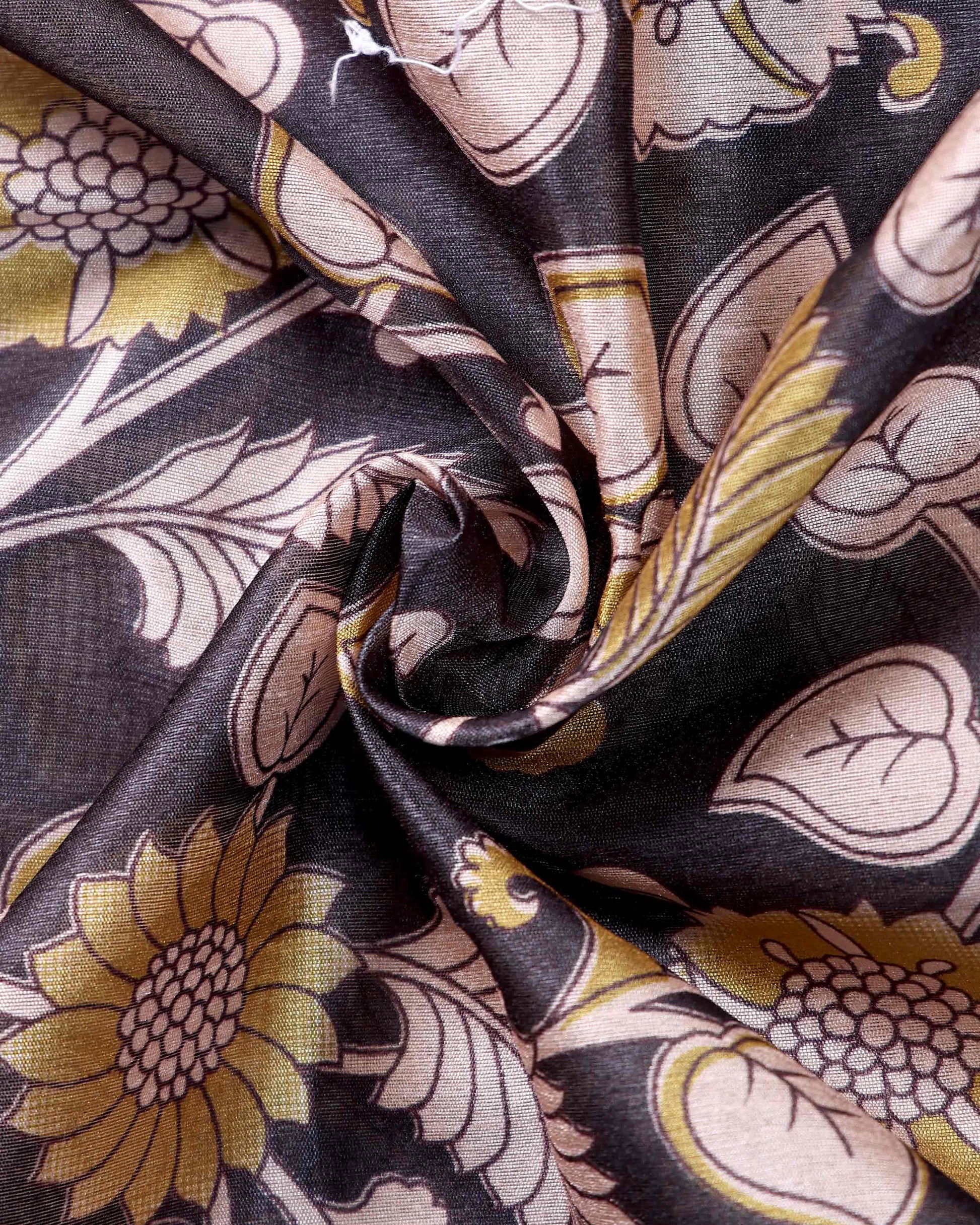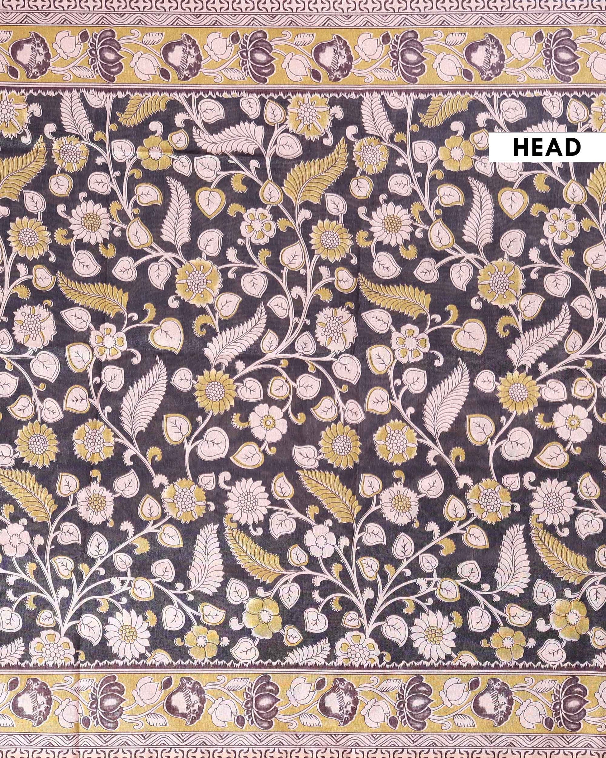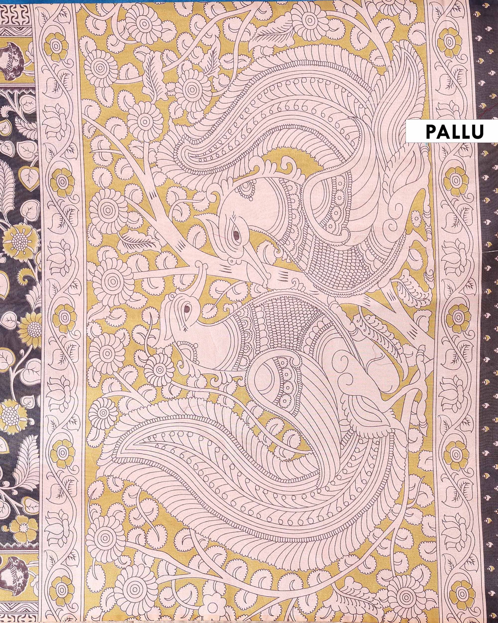 - This stunning raw silk saree intricate Kalamkari print showcasing traditional floral and animal motifs in elegant black and cream