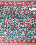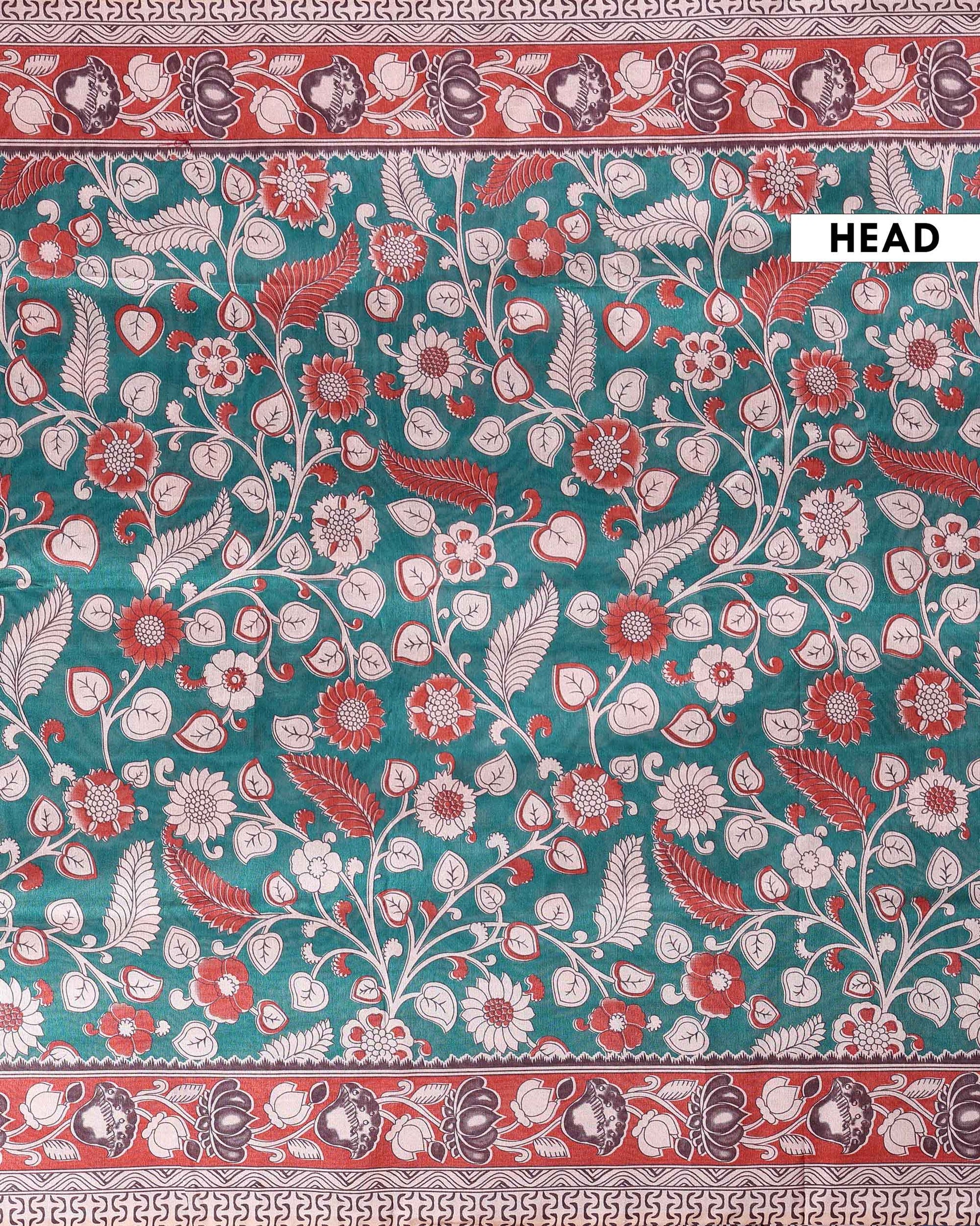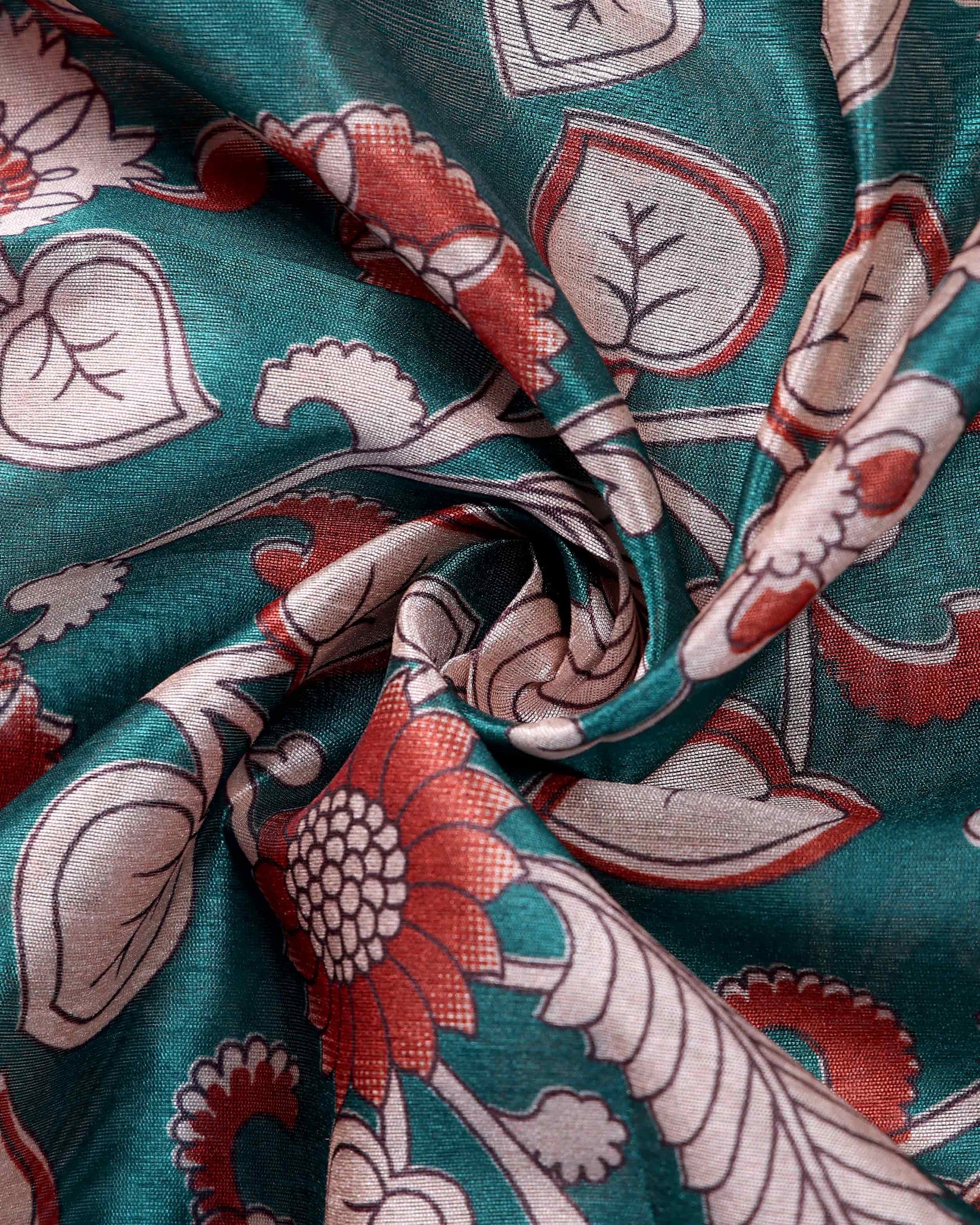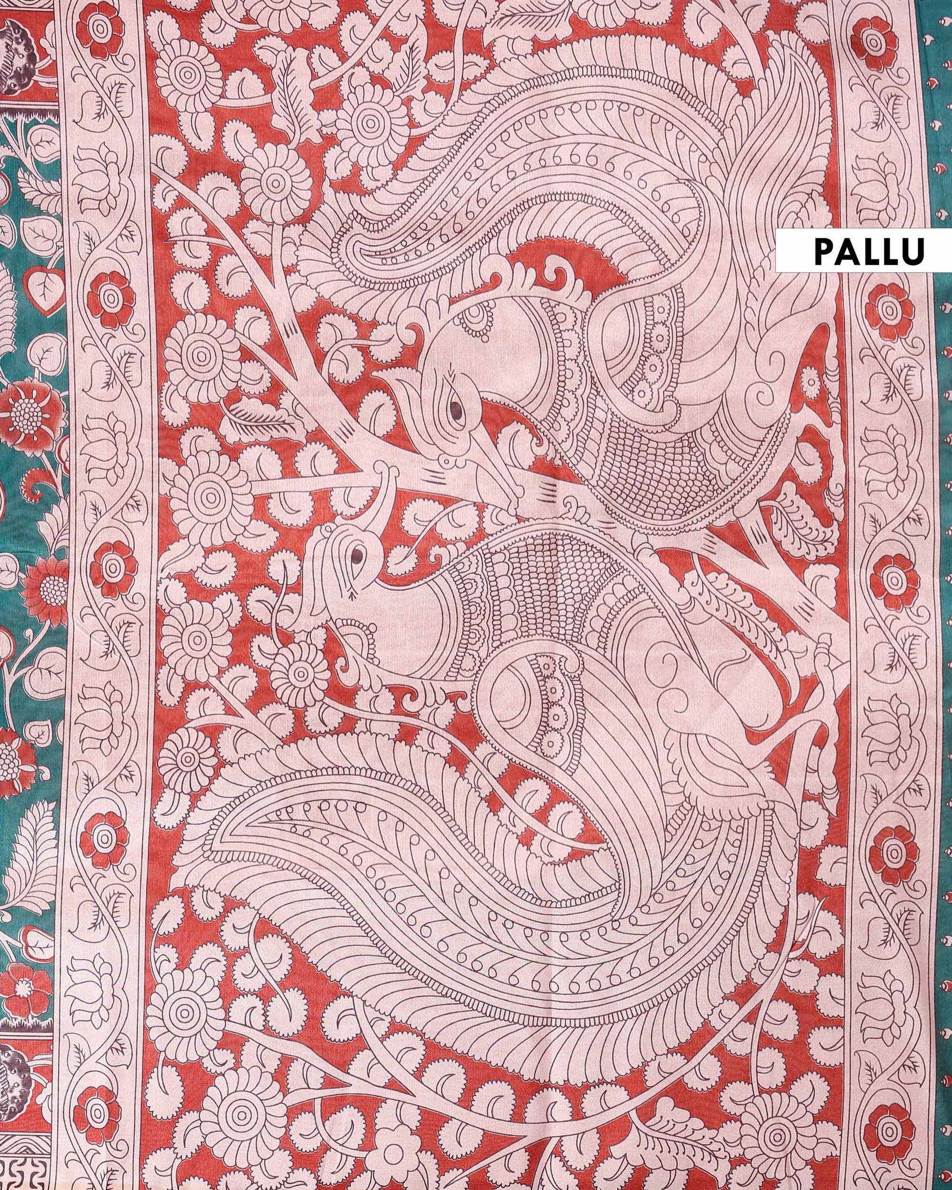 - Elevate your style with this stunning Kalamkari raw silk saree intricate floral and peacock motifs in a vibrant teal green and red palette.