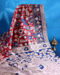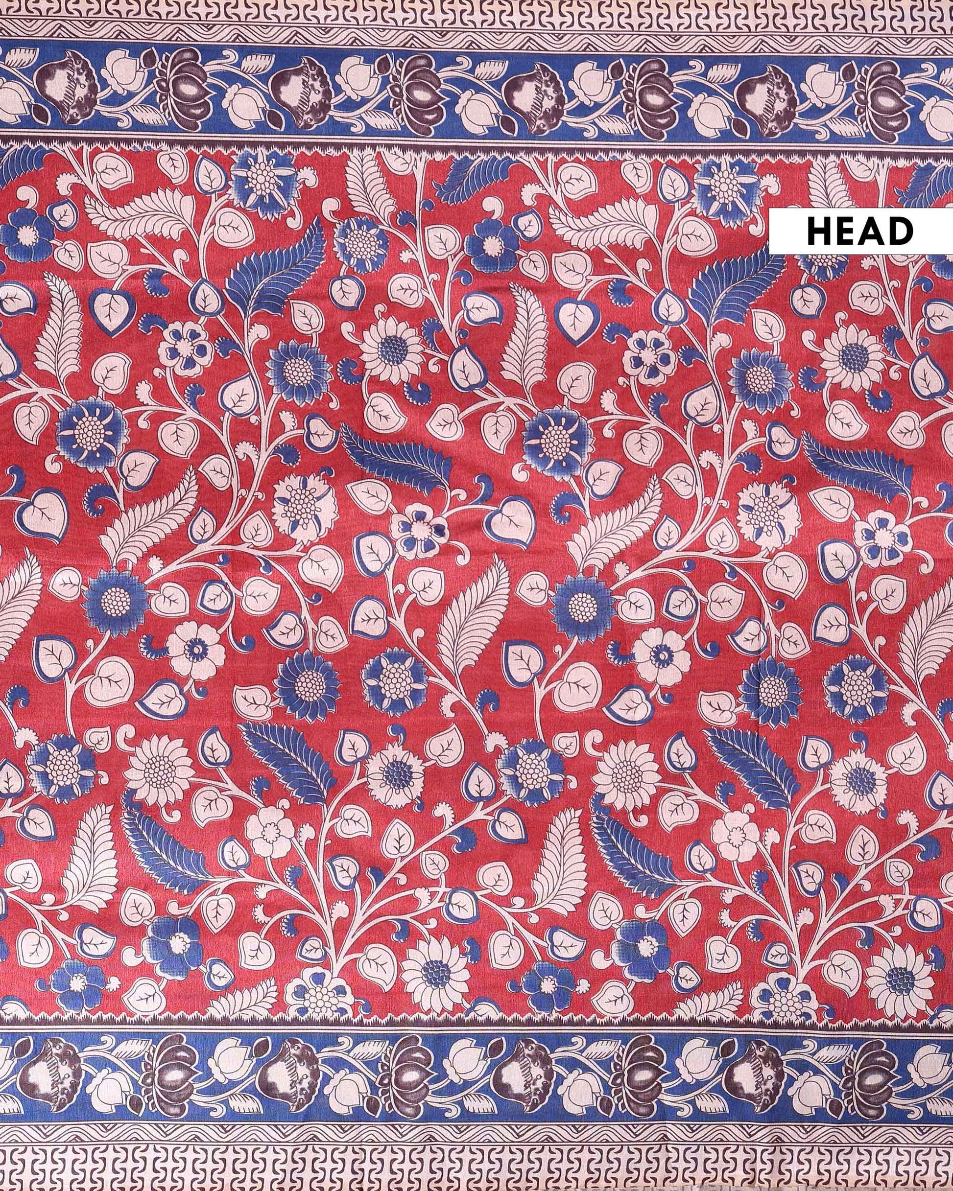 - Elegant raw silk Kalamkari saree a rich red base with intricate blue and beige floral prints and a striking peacock pallu.Ā