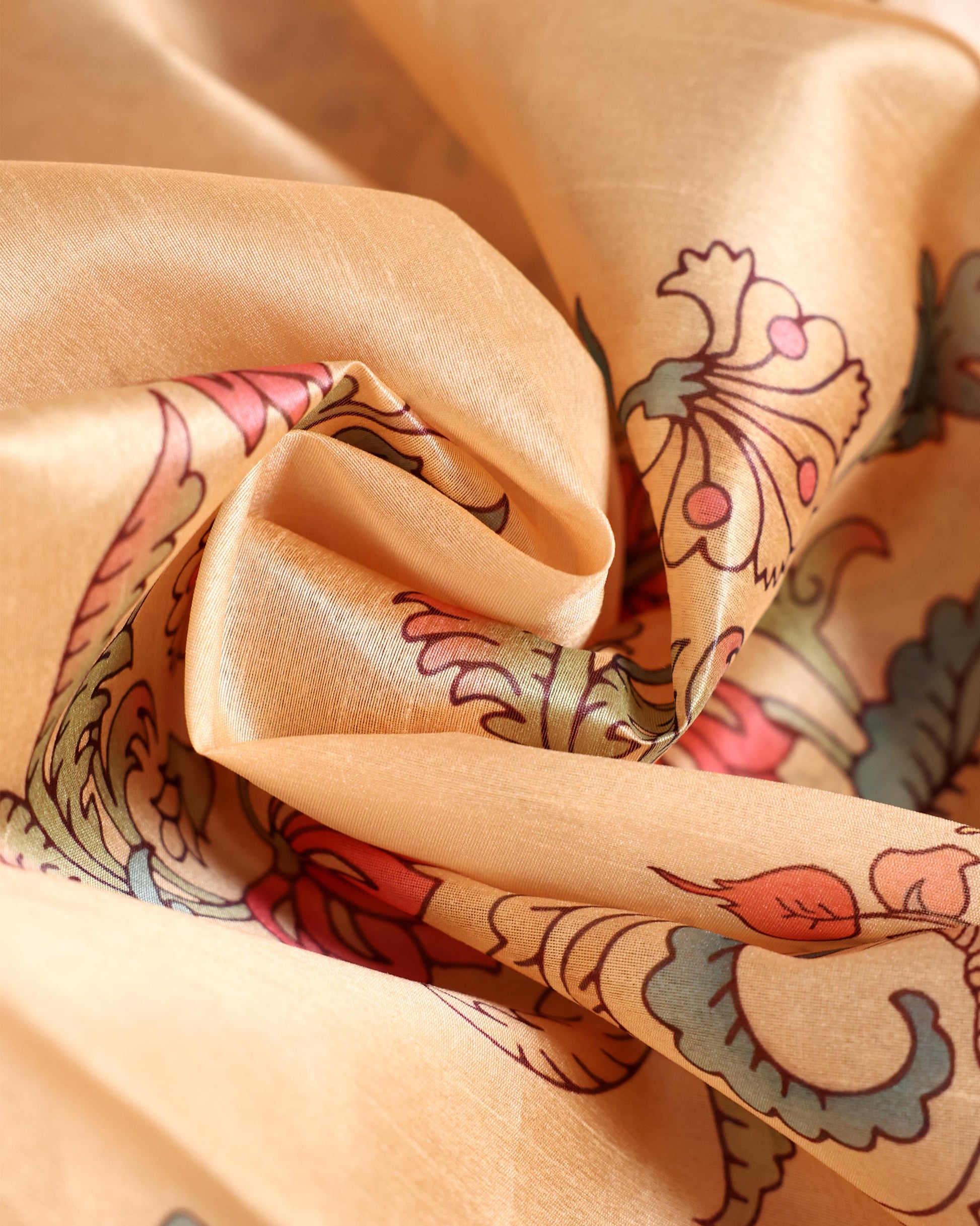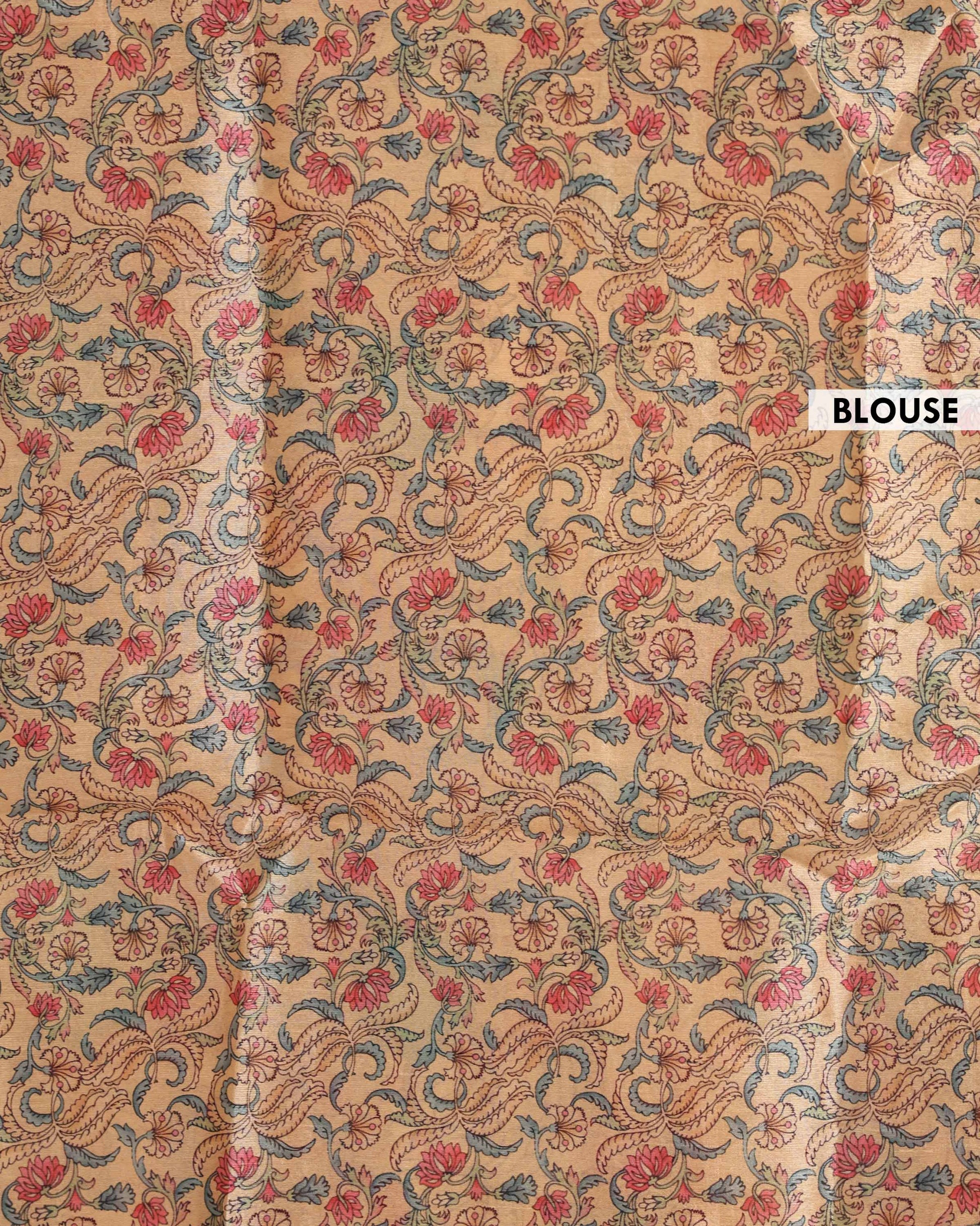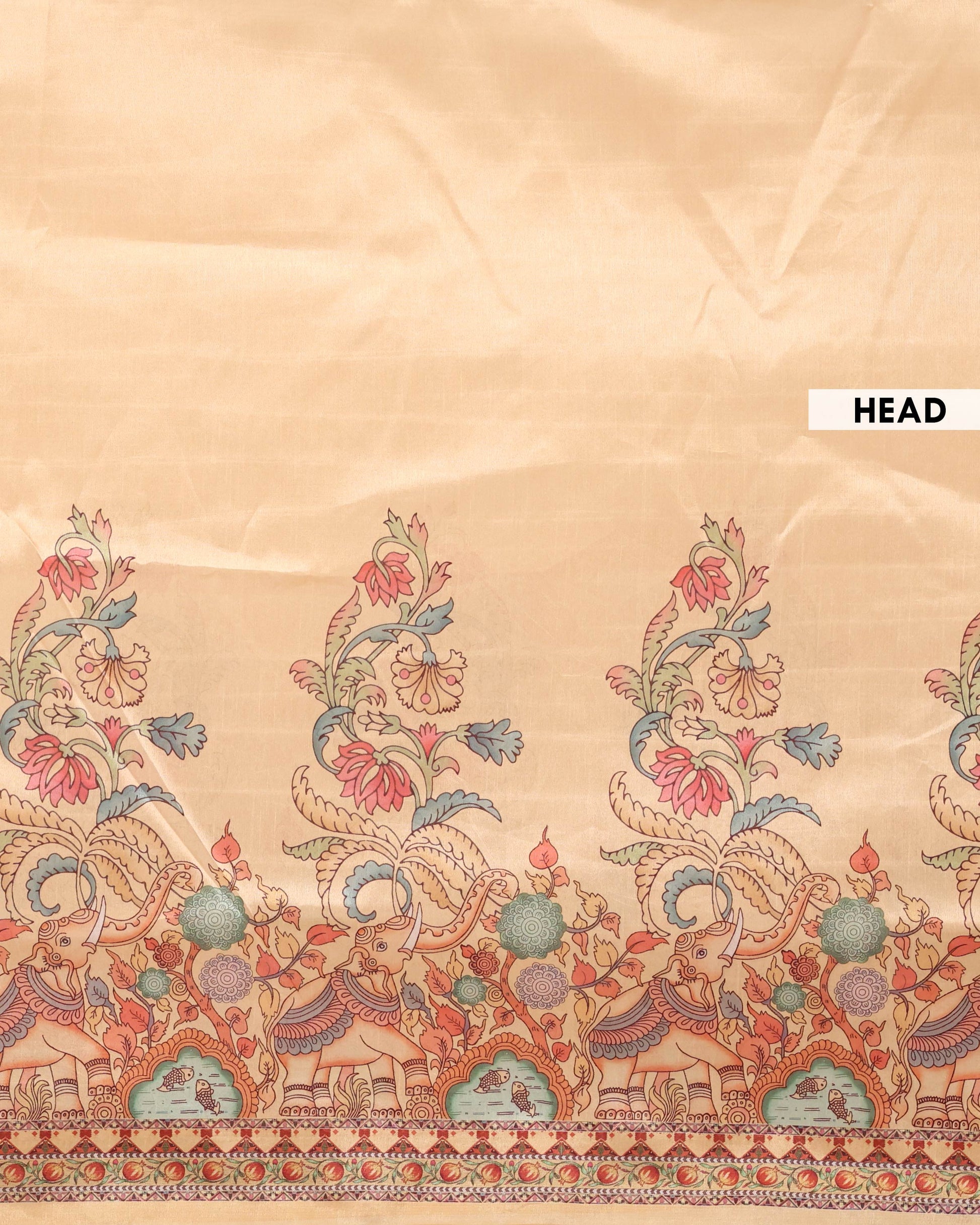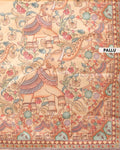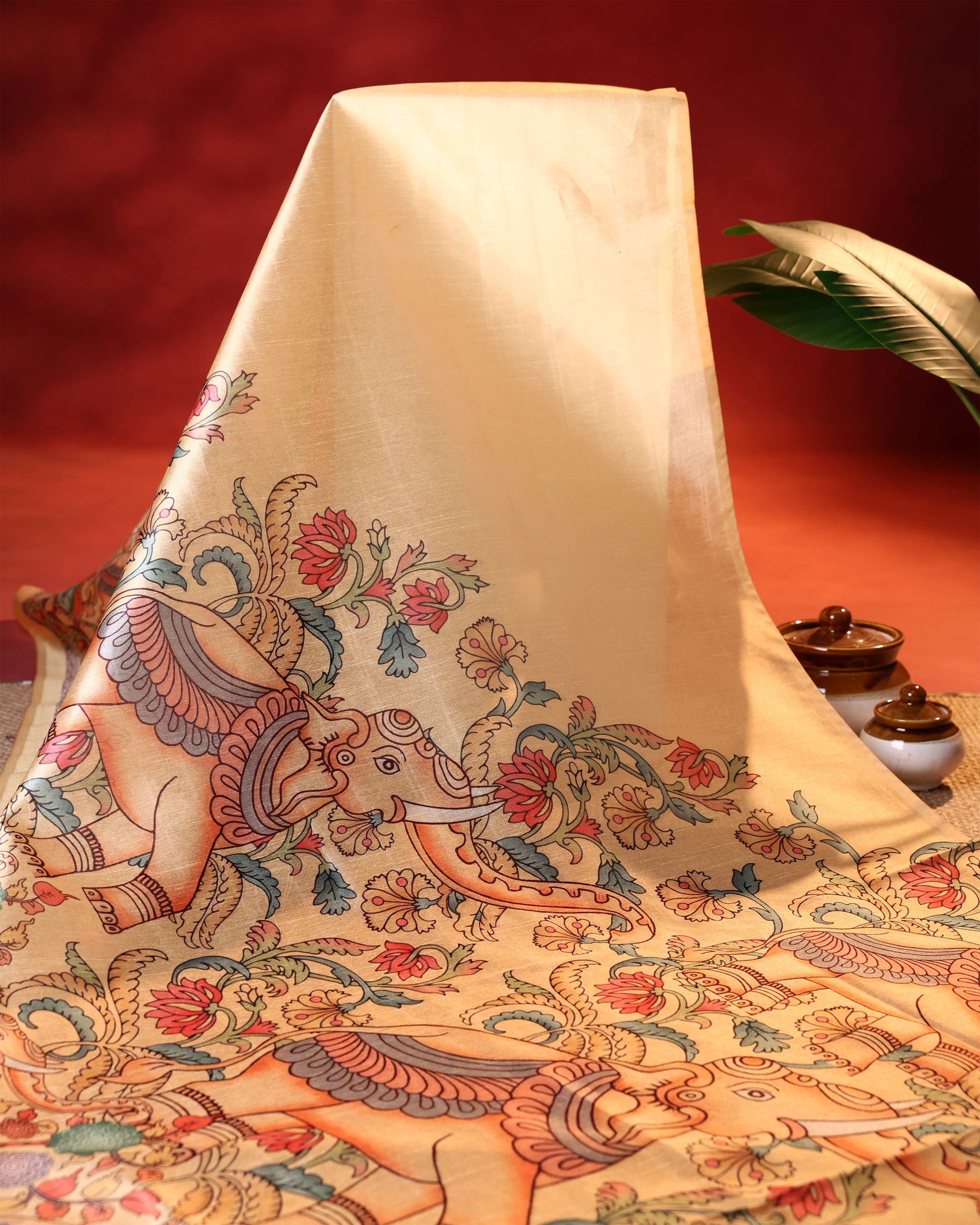 Traditional Raw Silk Saree with Kalamkari Elephant & Floral Motifs and Heritage Pallu Design - Sandal