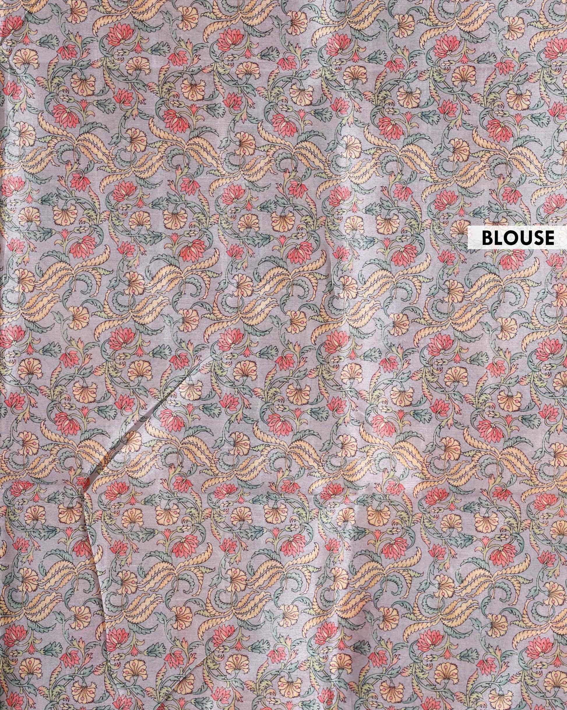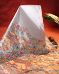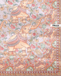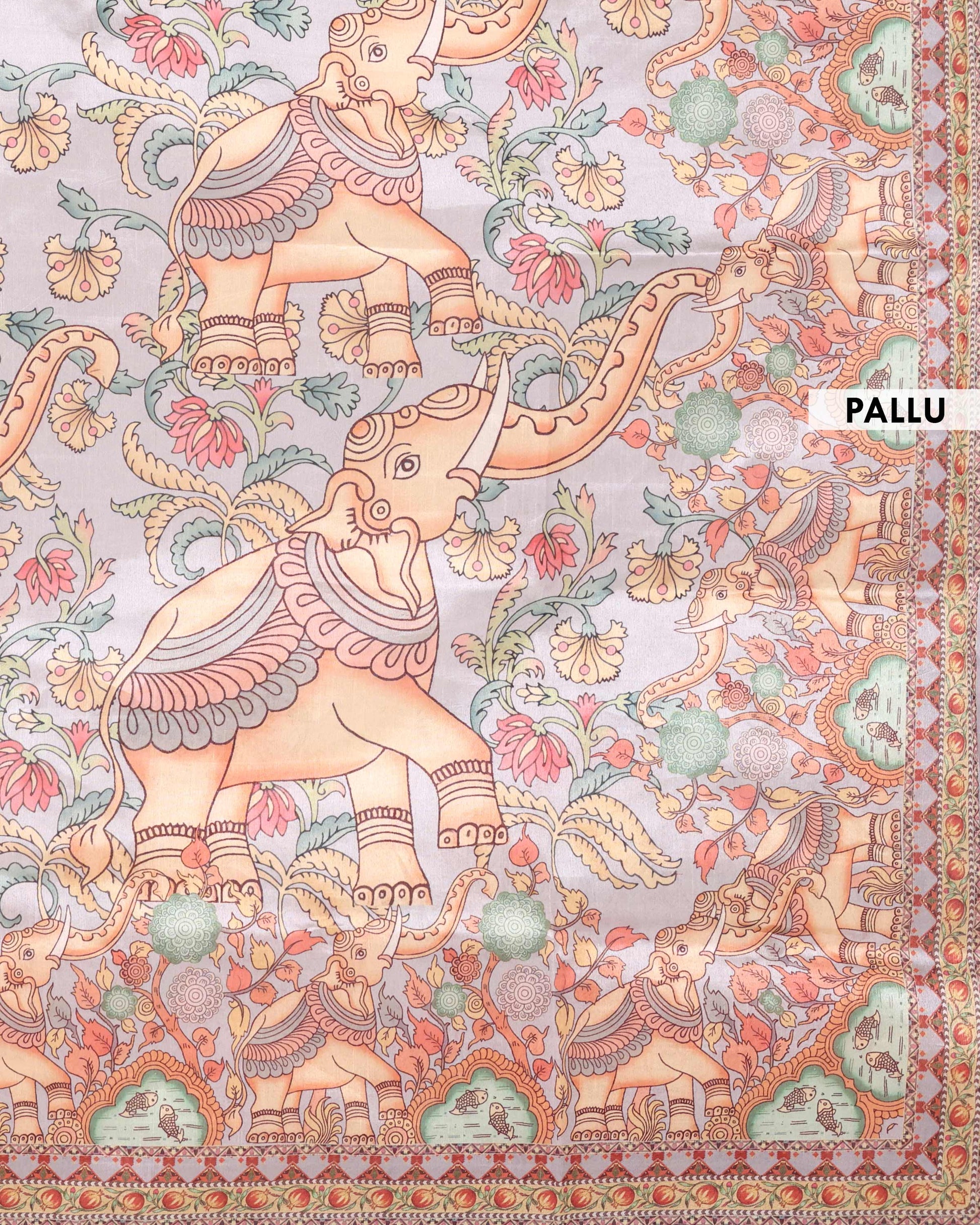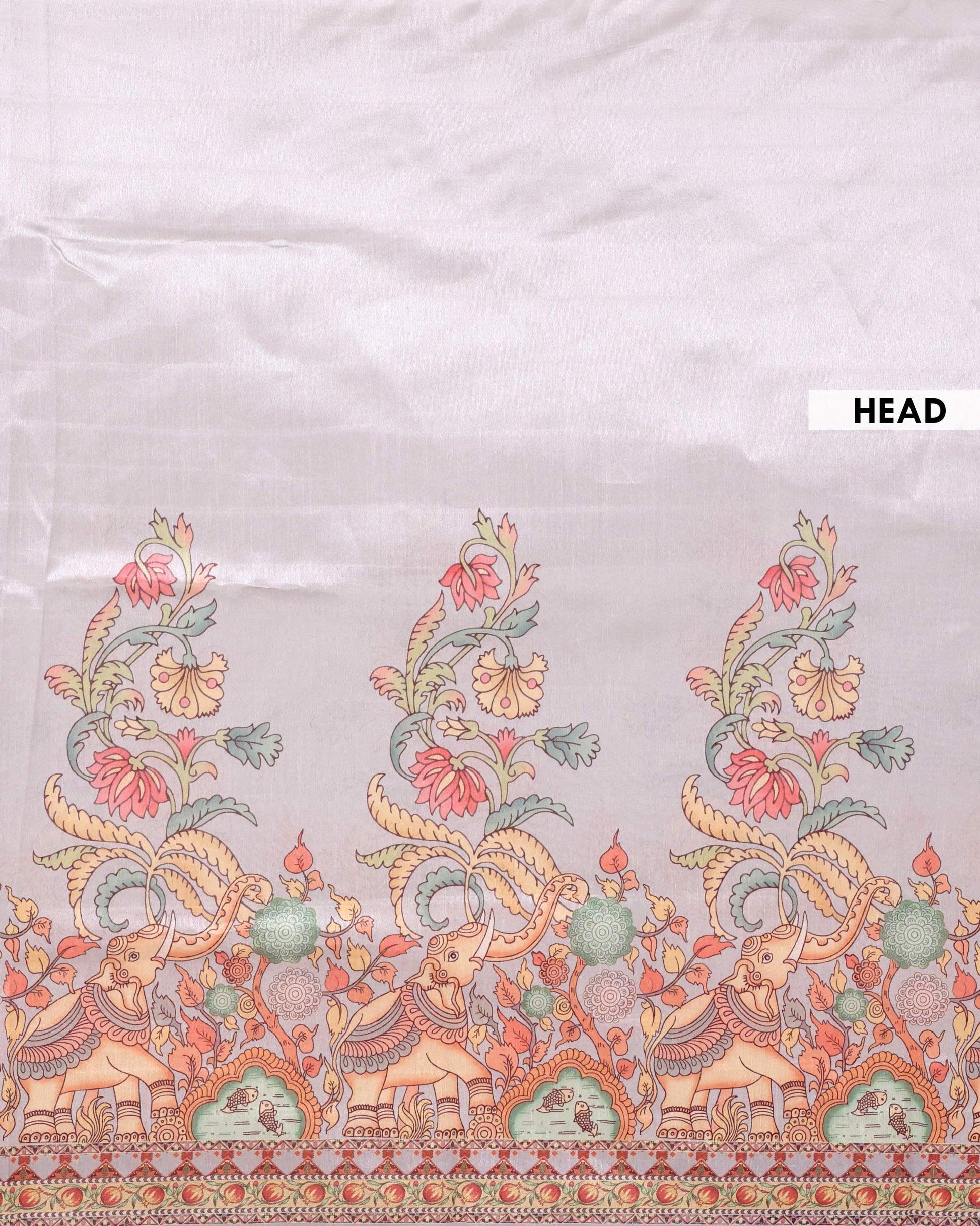 Traditional Raw Silk Saree with Kalamkari Inspired Elephant & Floral Motifs and Heritage Pallu Design - Light Grey