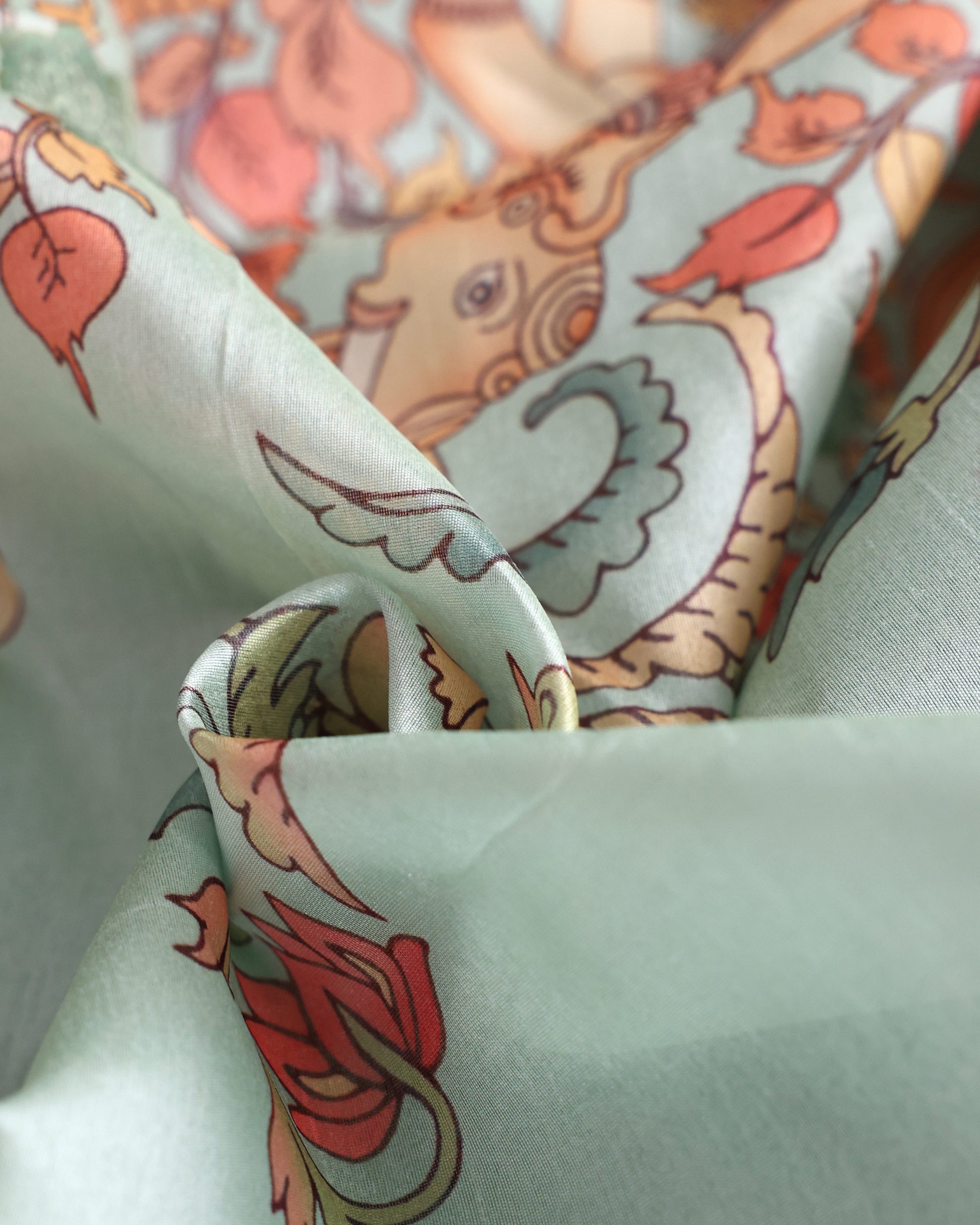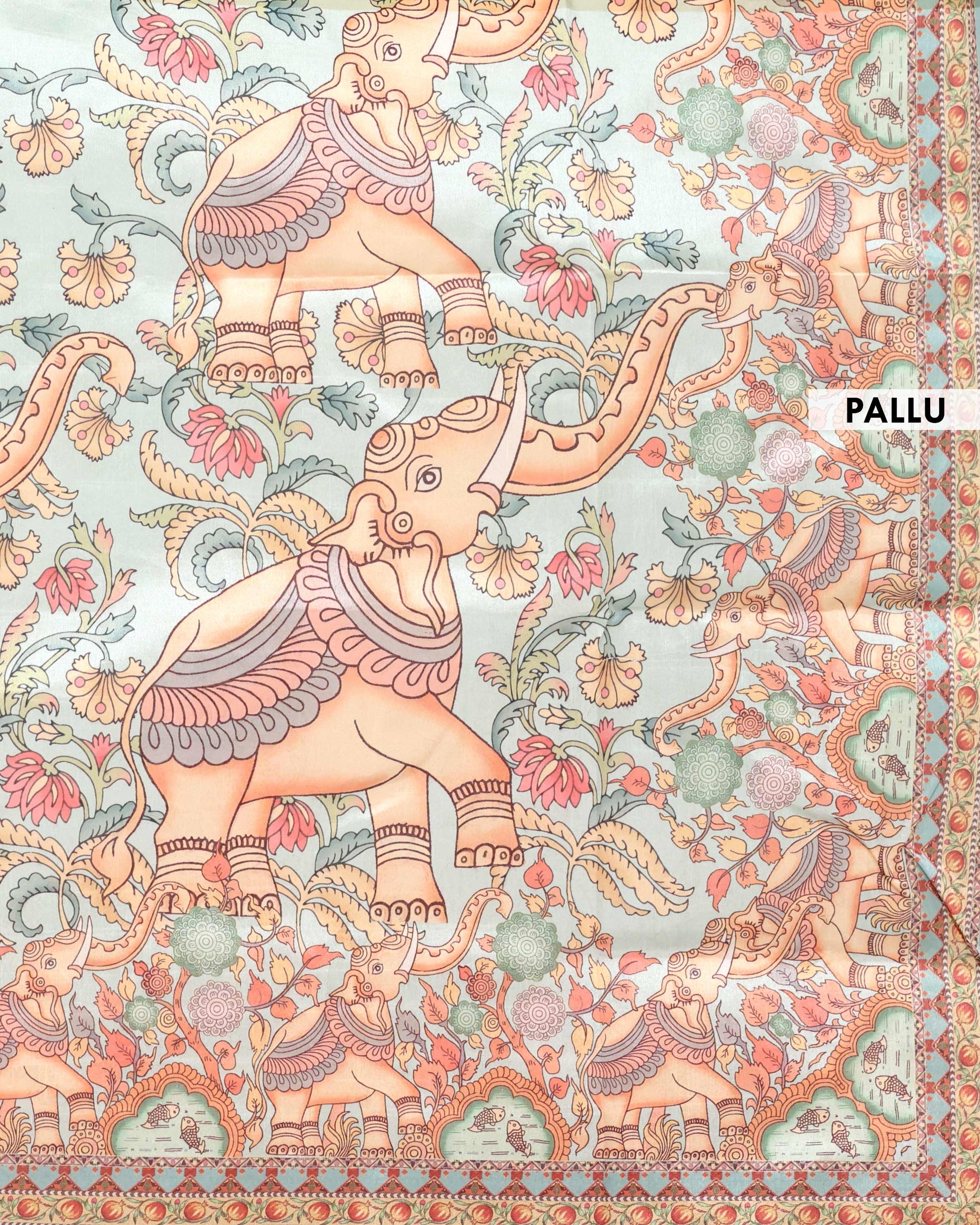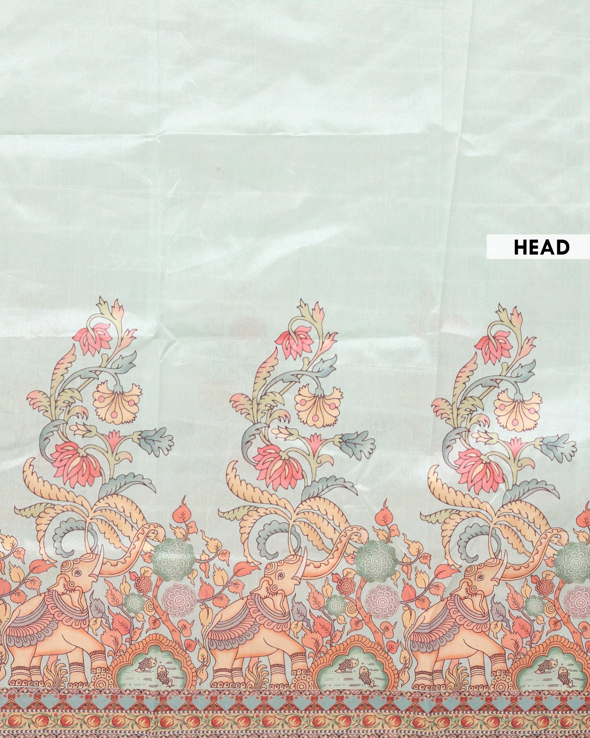 Traditional Raw Silk Saree with Kalamkari Inspired Elephant & Floral Motifs and Heritage Pallu Design - Pista Green