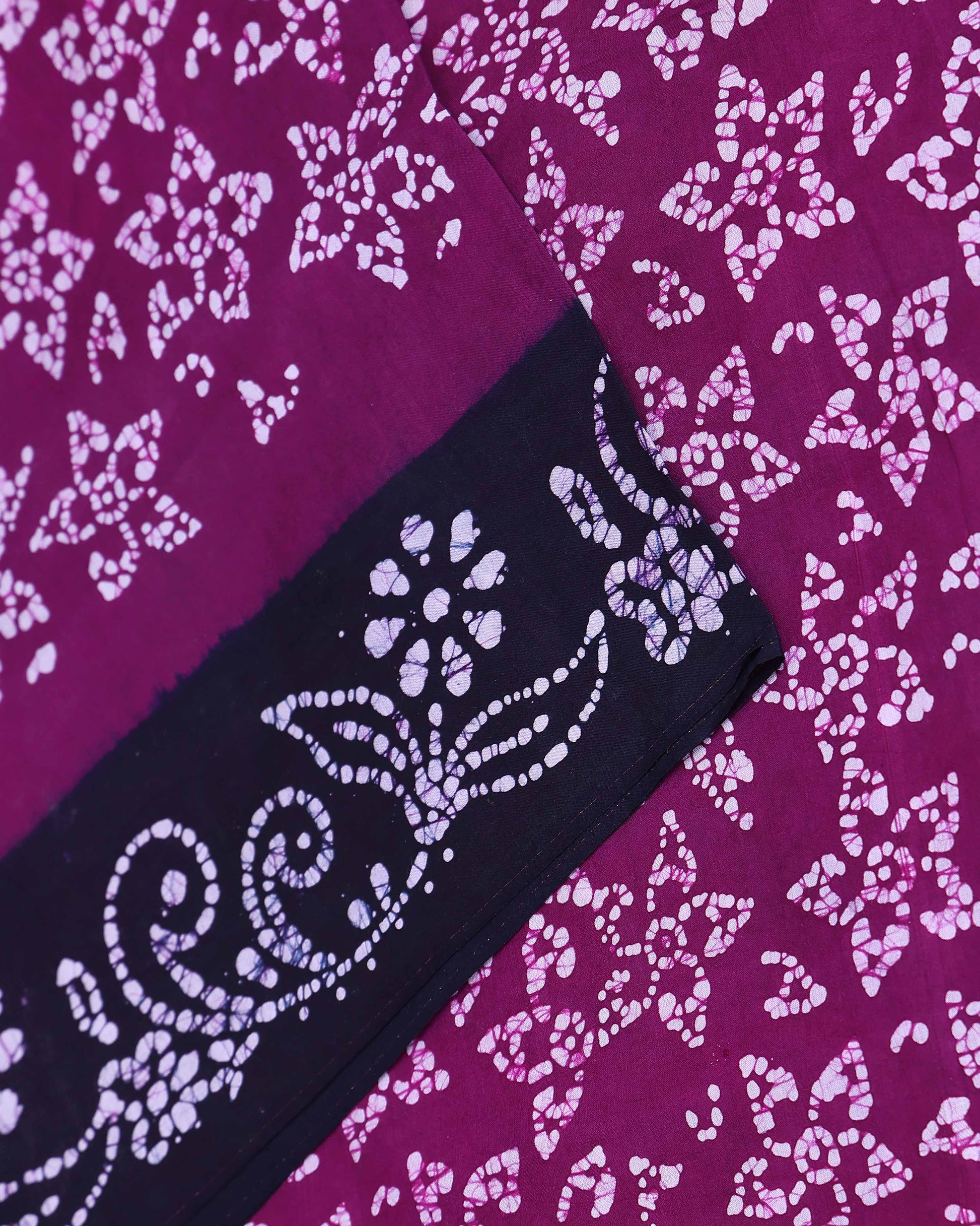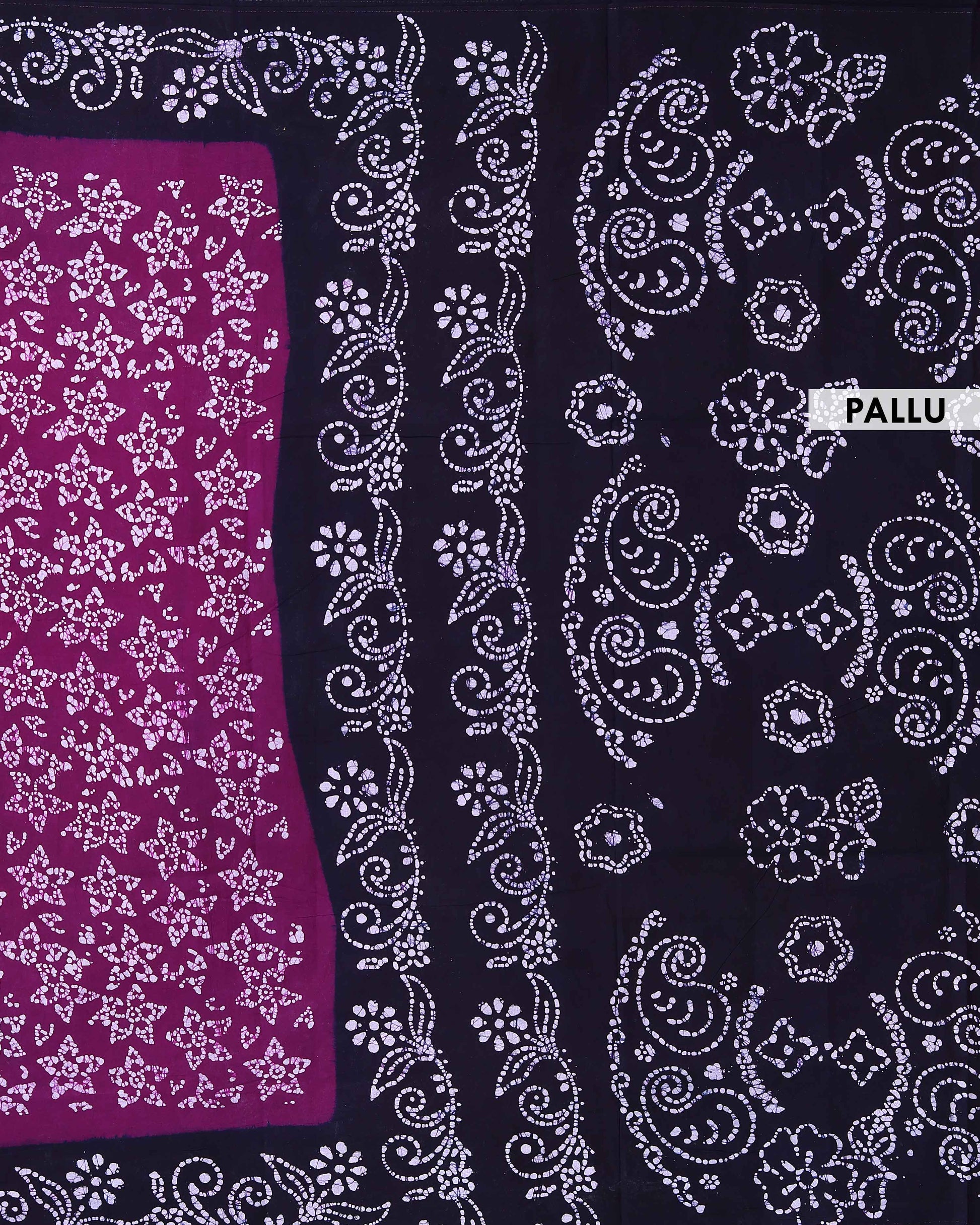 - This stunning purple Sungudi cotton saree vibrant hues and a contrasting black border with intricate white patterns