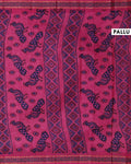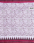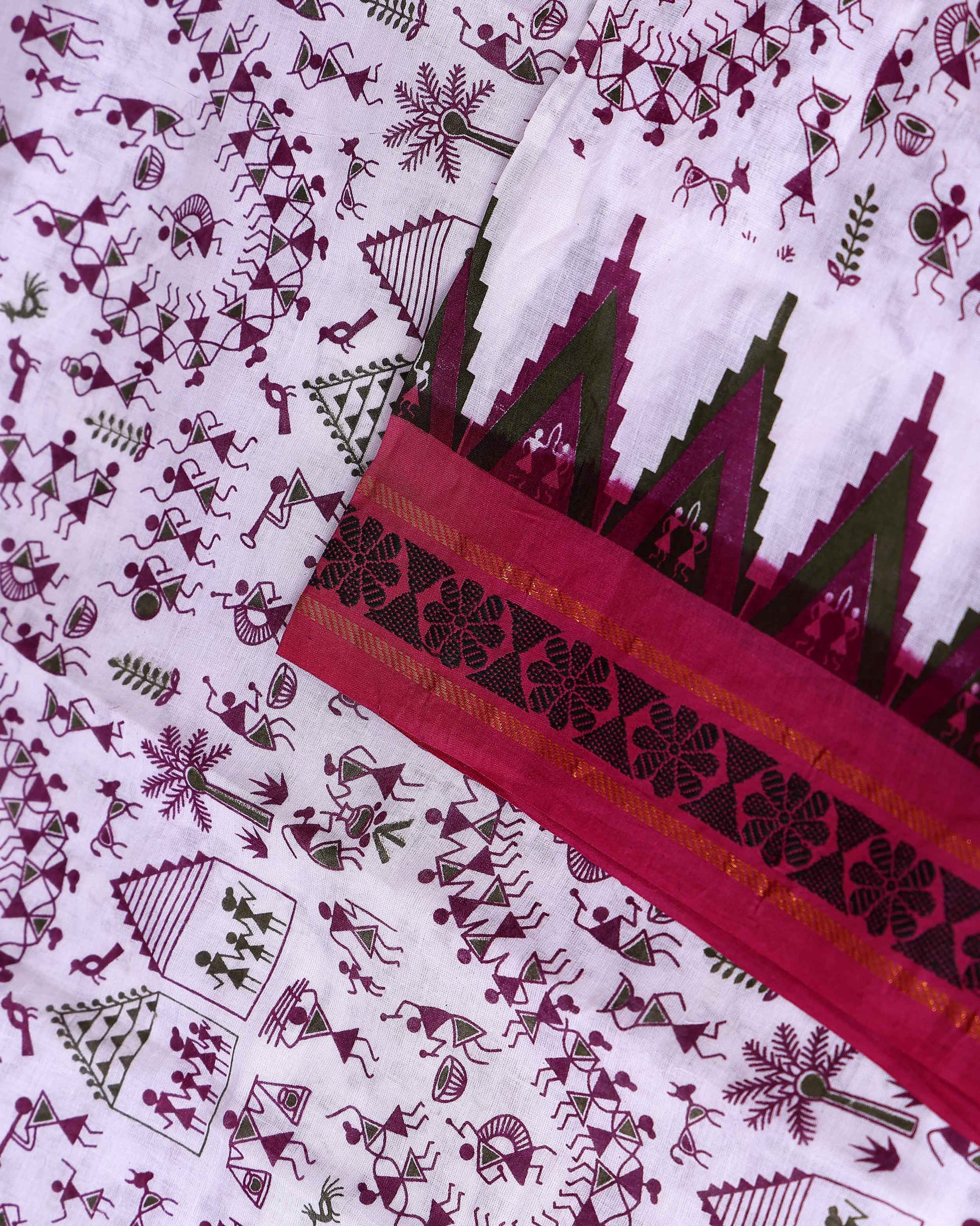 - Elegant white Sungudi cotton saree a vibrant maroon border and traditional Warli art prints.