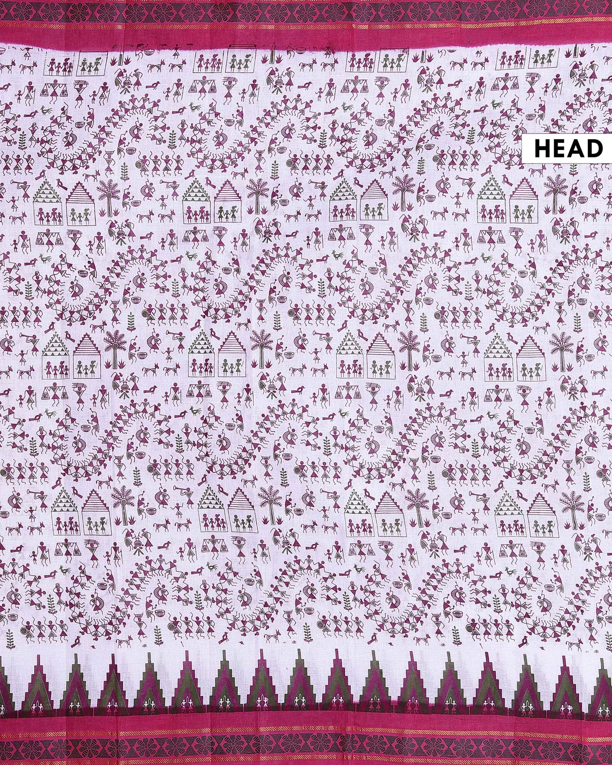 Traditional Sungudi Cotton Saree with Intricate Warli Tribal Print and Contrasting Geometric Border Design Without Blouse - Off White