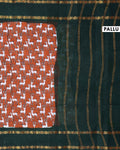 - This elegant Sungudi cotton saree a vibrant Dark Brown body with traditional white cow prints, complemented by a rich dark green and gold zari border