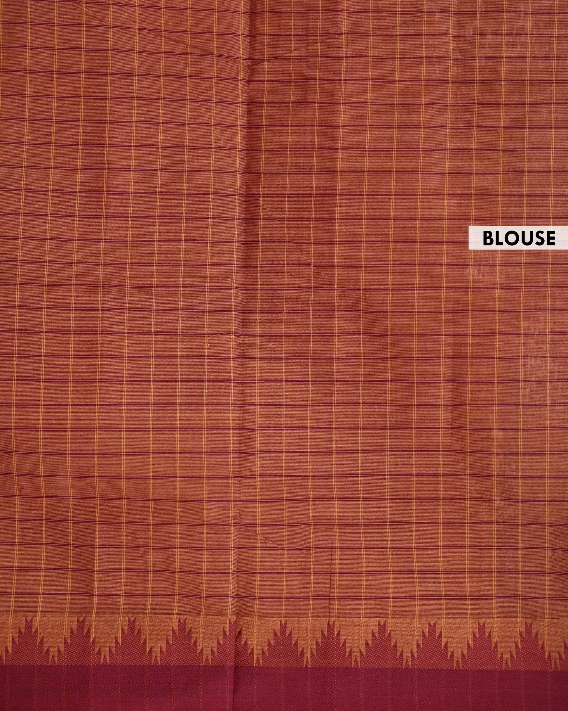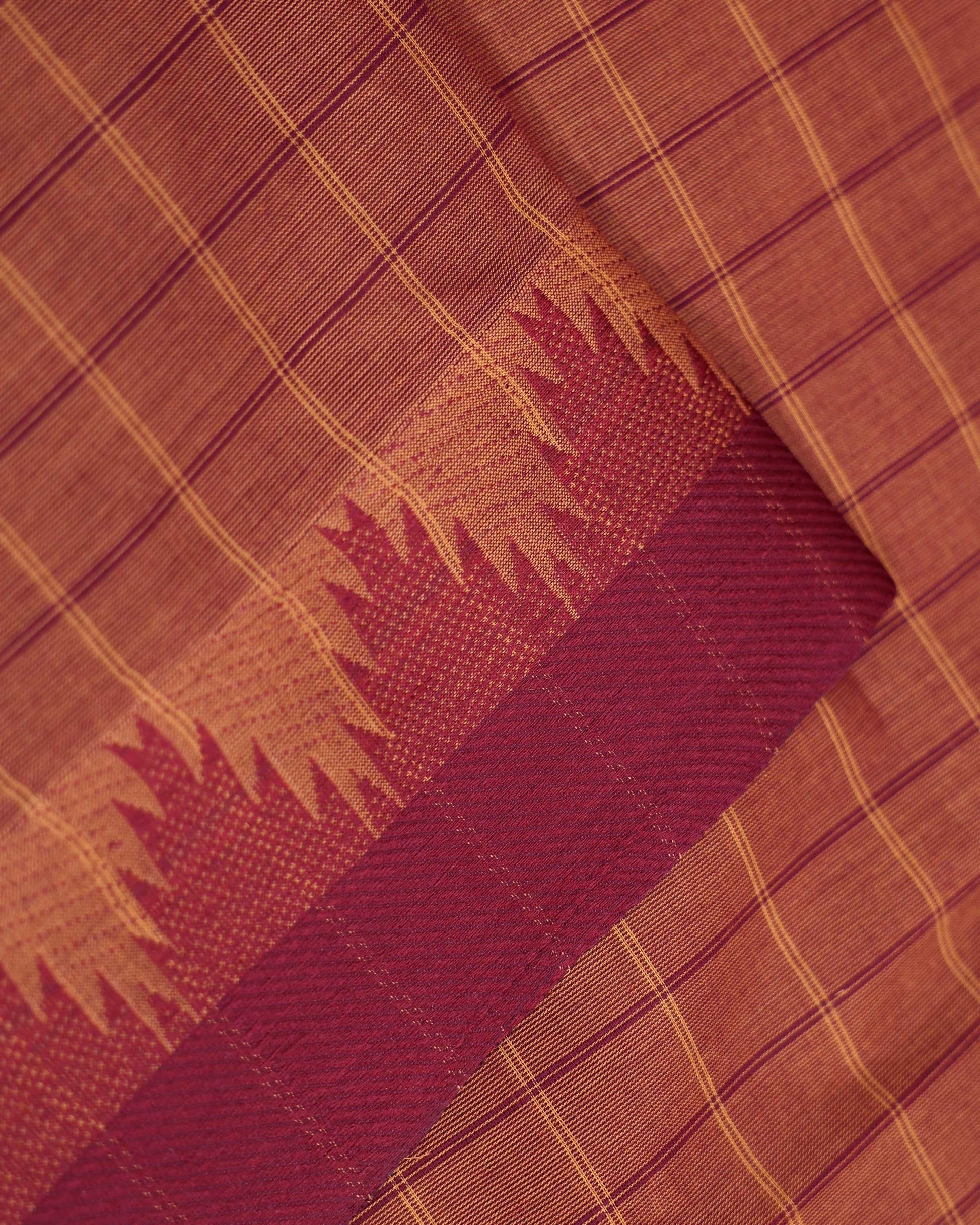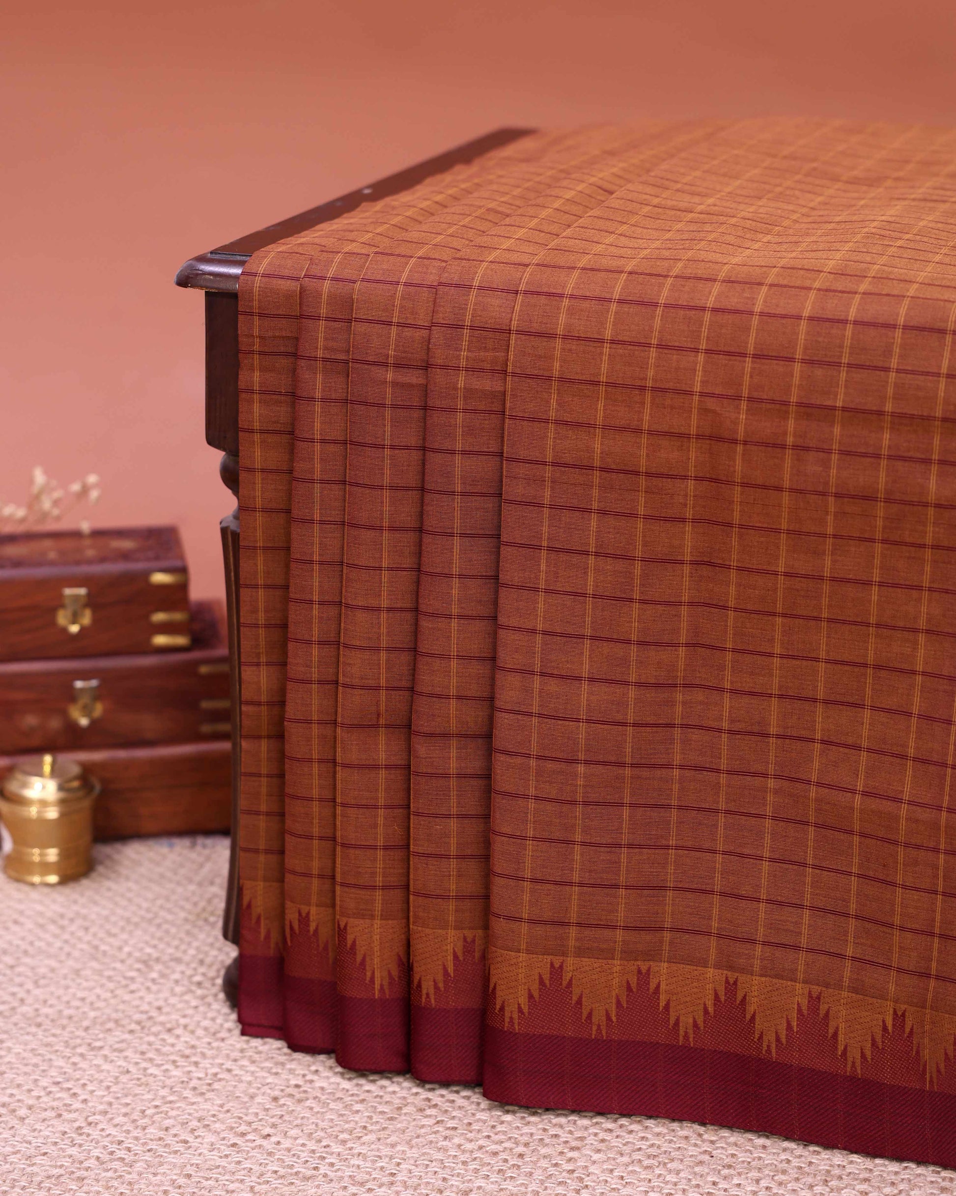 Traditional Venkatagiri Cotton Handloom Saree with Checks Design and Temple Border - Brown