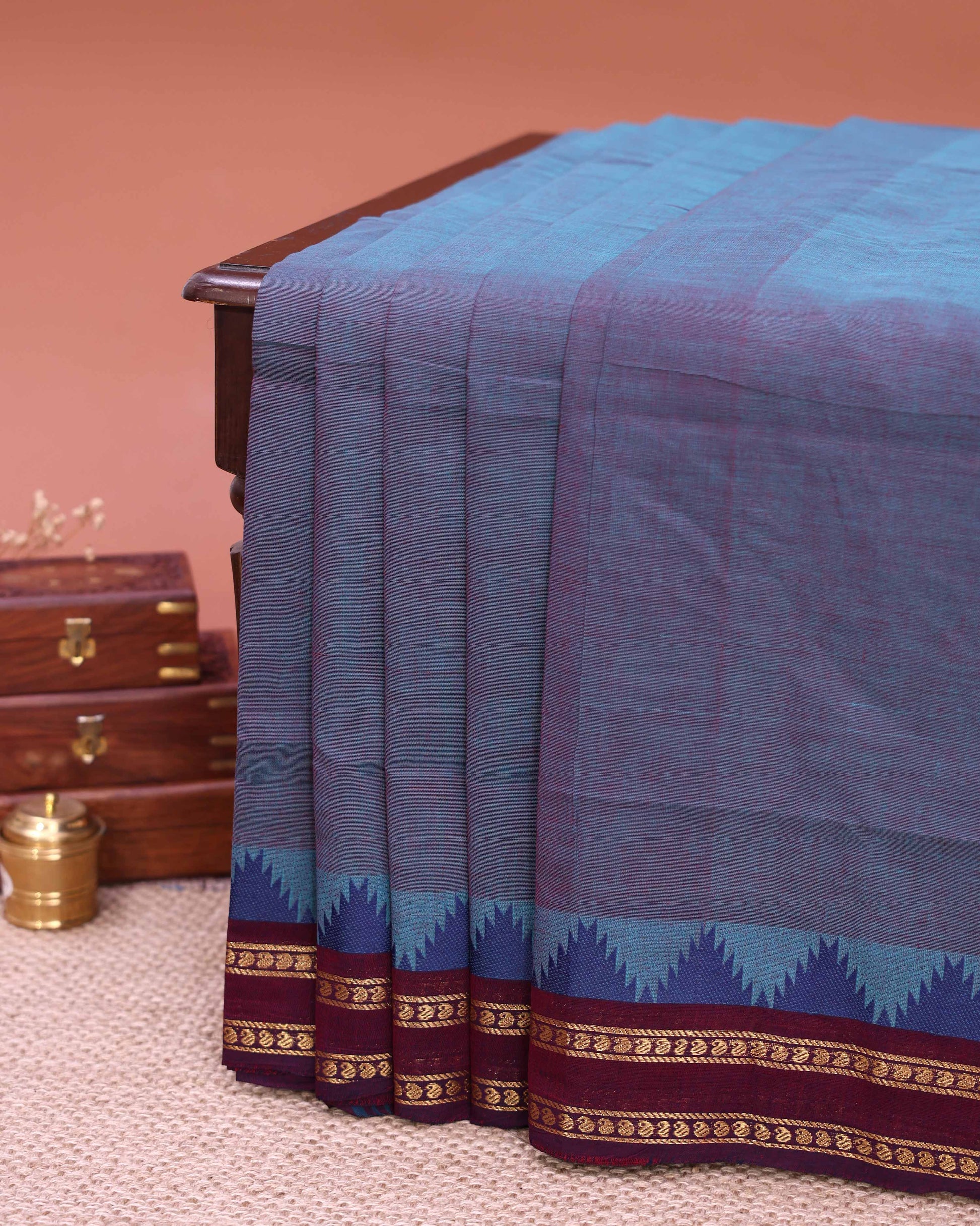 - The traditional appeal is enhanced by a rich, contrasting temple border in a deep maroon shade with intricate gold zari motifs, making it ideal for office wear or everyday elegance