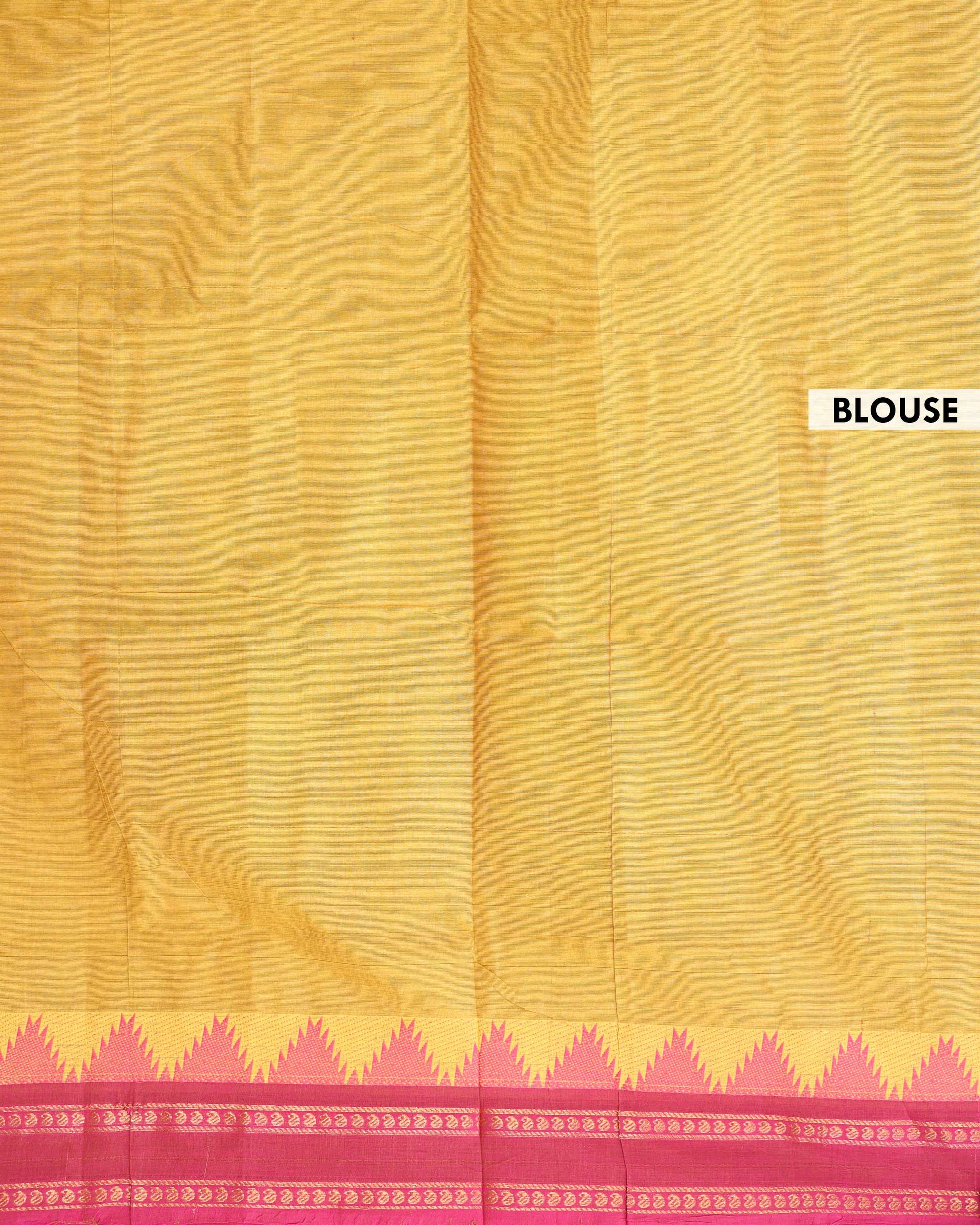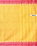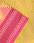 - Drape yourself in the elegance of this yellow handloom cotton saree a striking pink temple-style woven border and pallu.