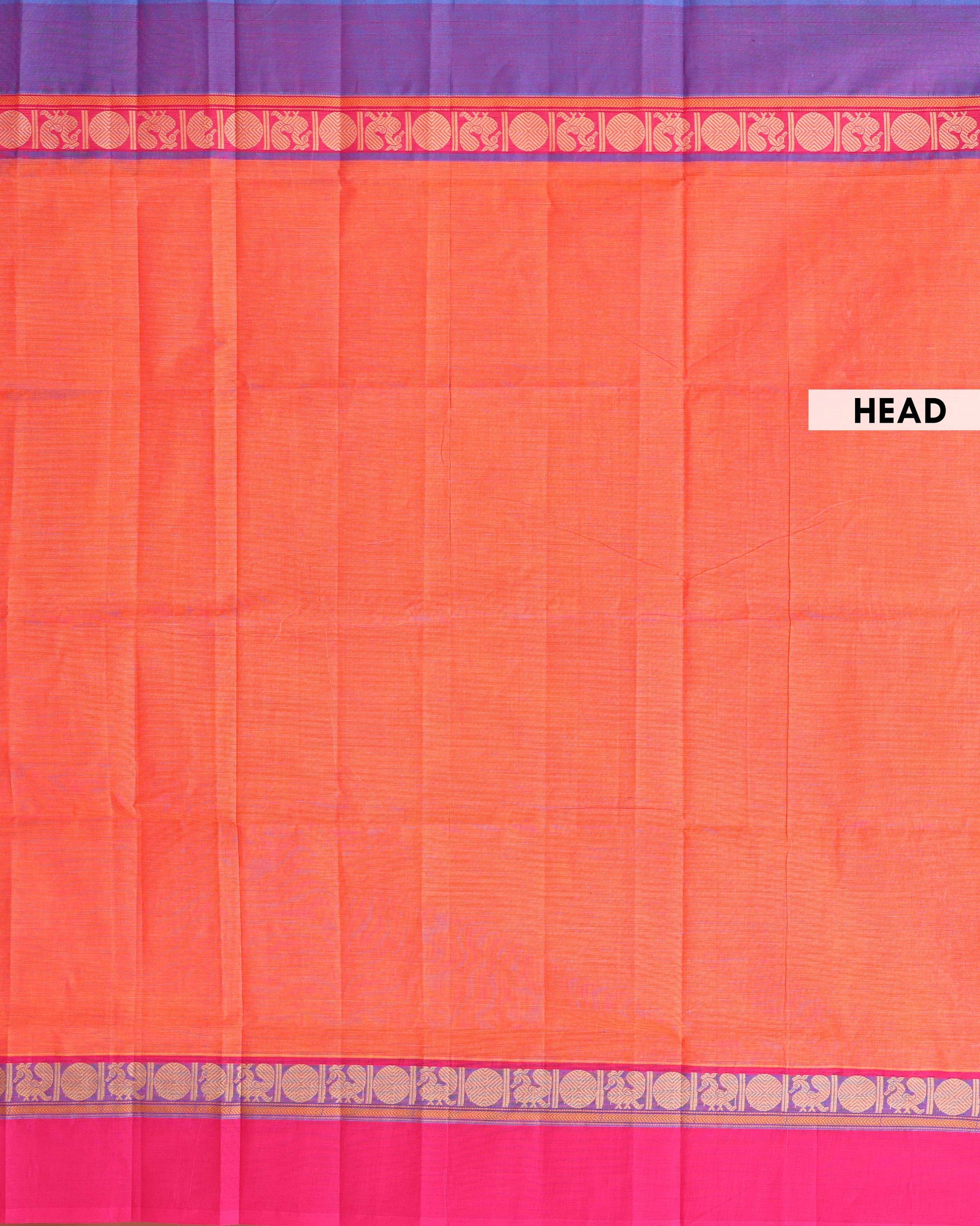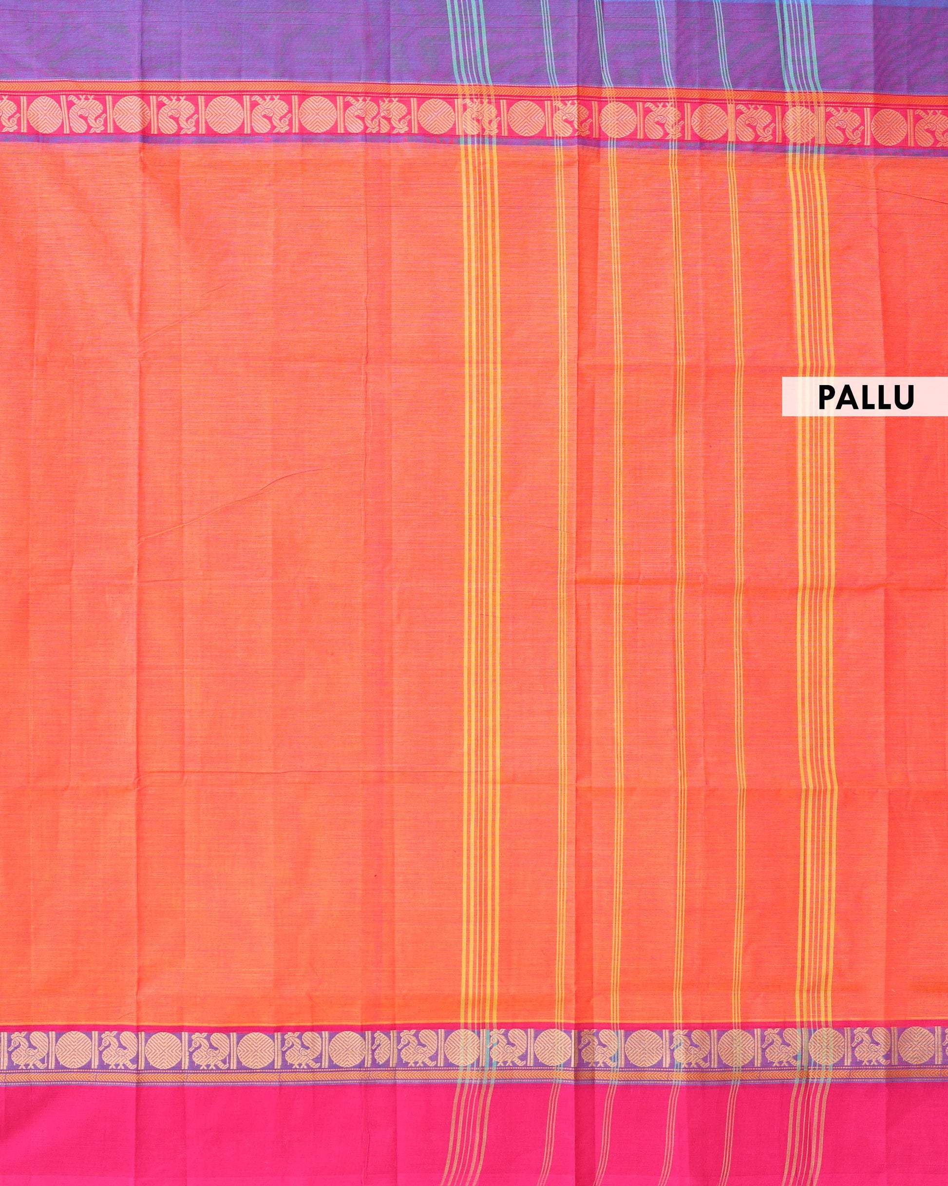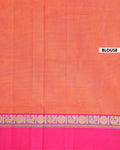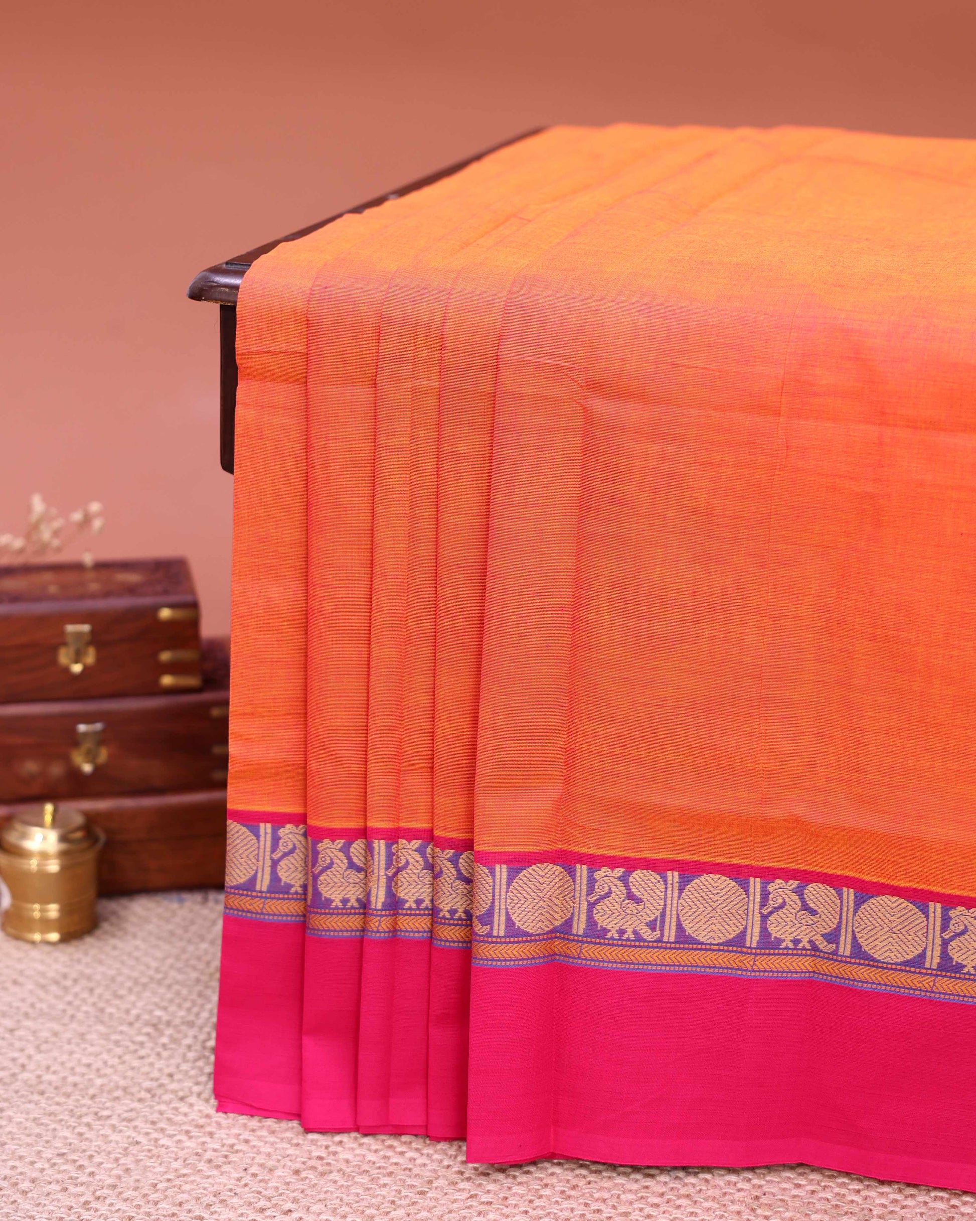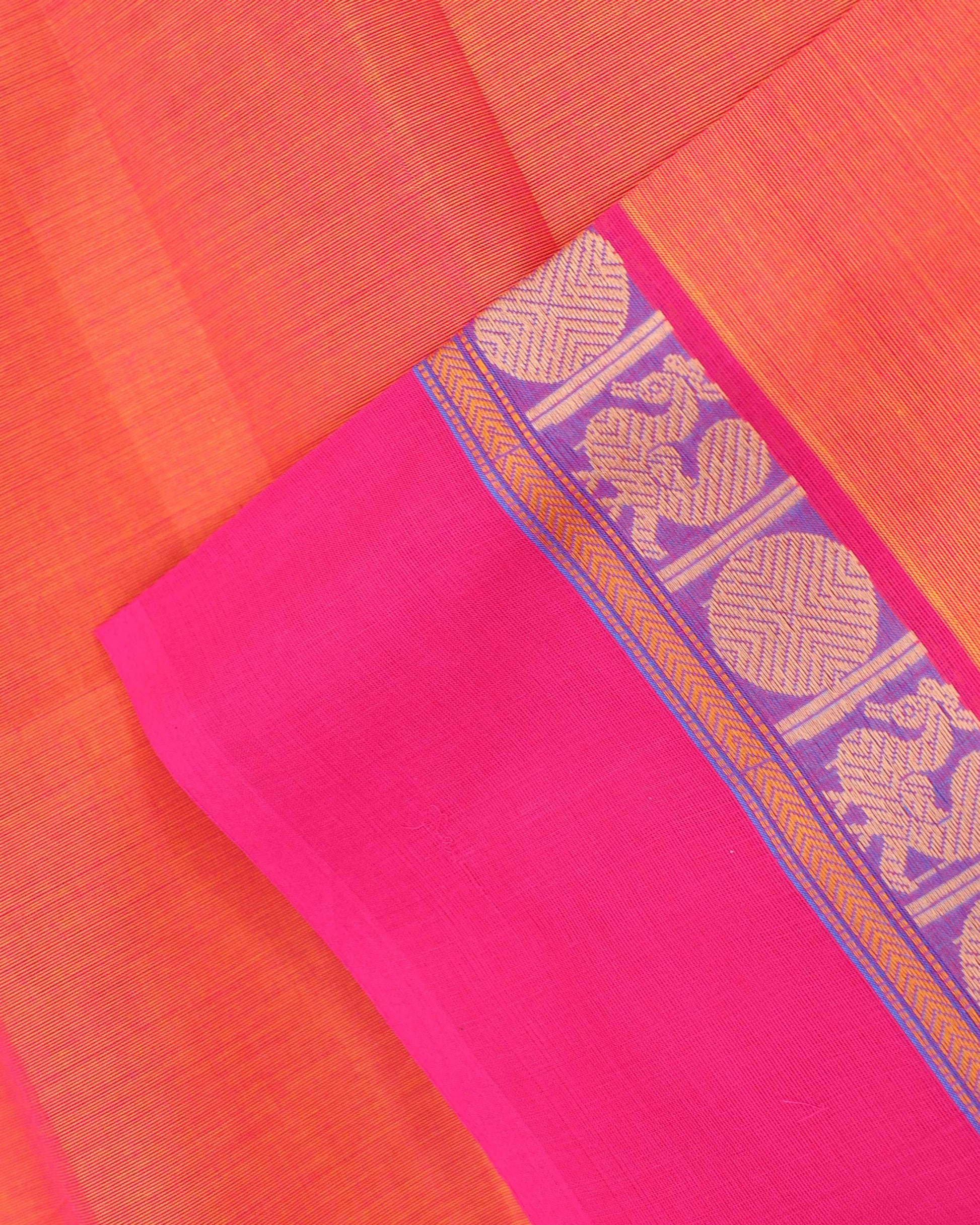 - This handwoven Venkatagiri cotton saree known for its durability and breathability, a vibrant orange body and a contrasting magenta border with traditional peacock motifs