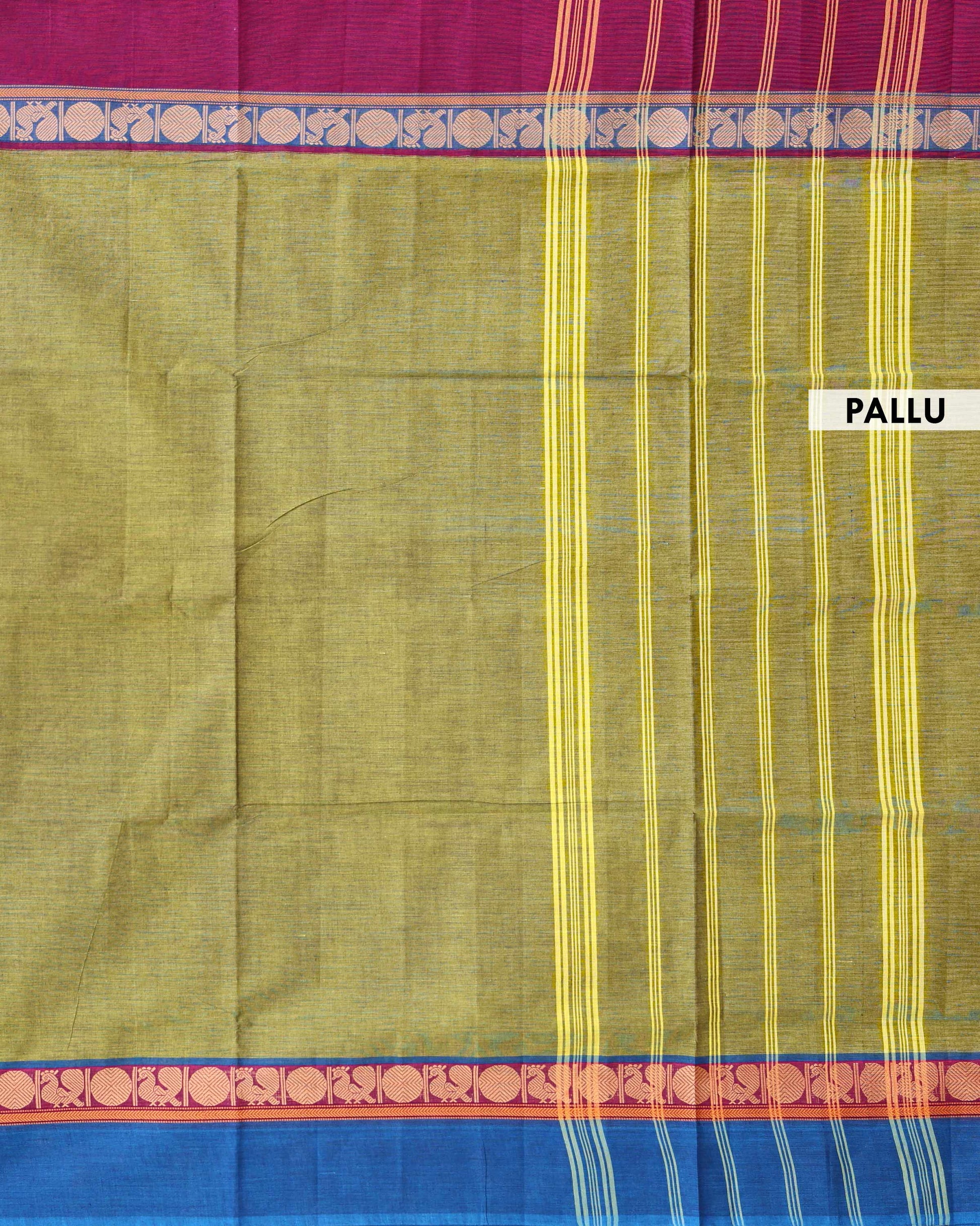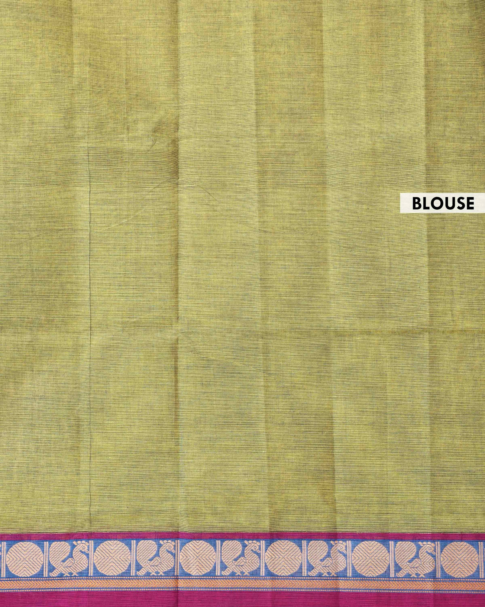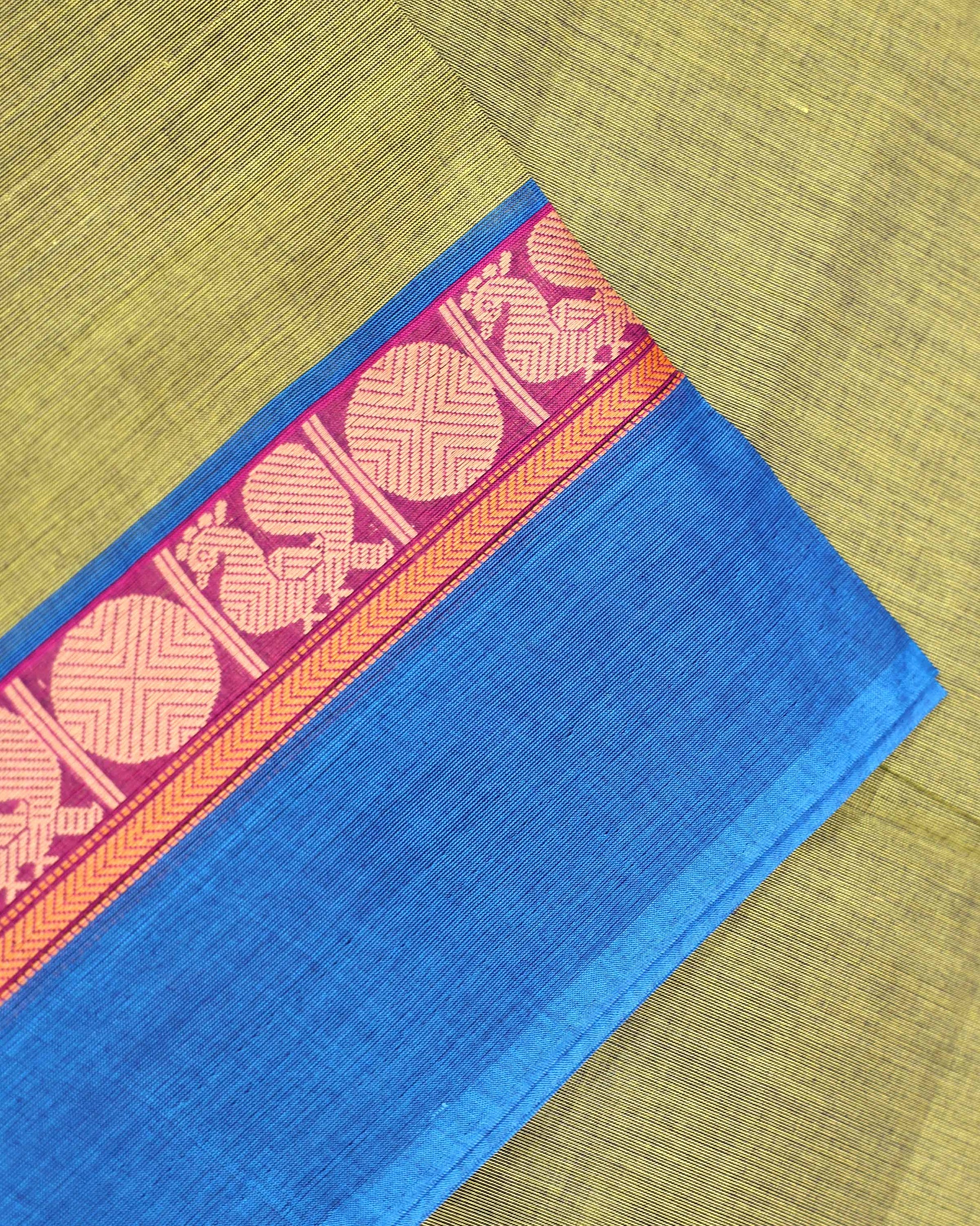 - Drape yourself in the timeless elegance of this handwoven Venkatagiri cotton saree, a vibrant Green body and a striking blue border adorned with traditional motifs.