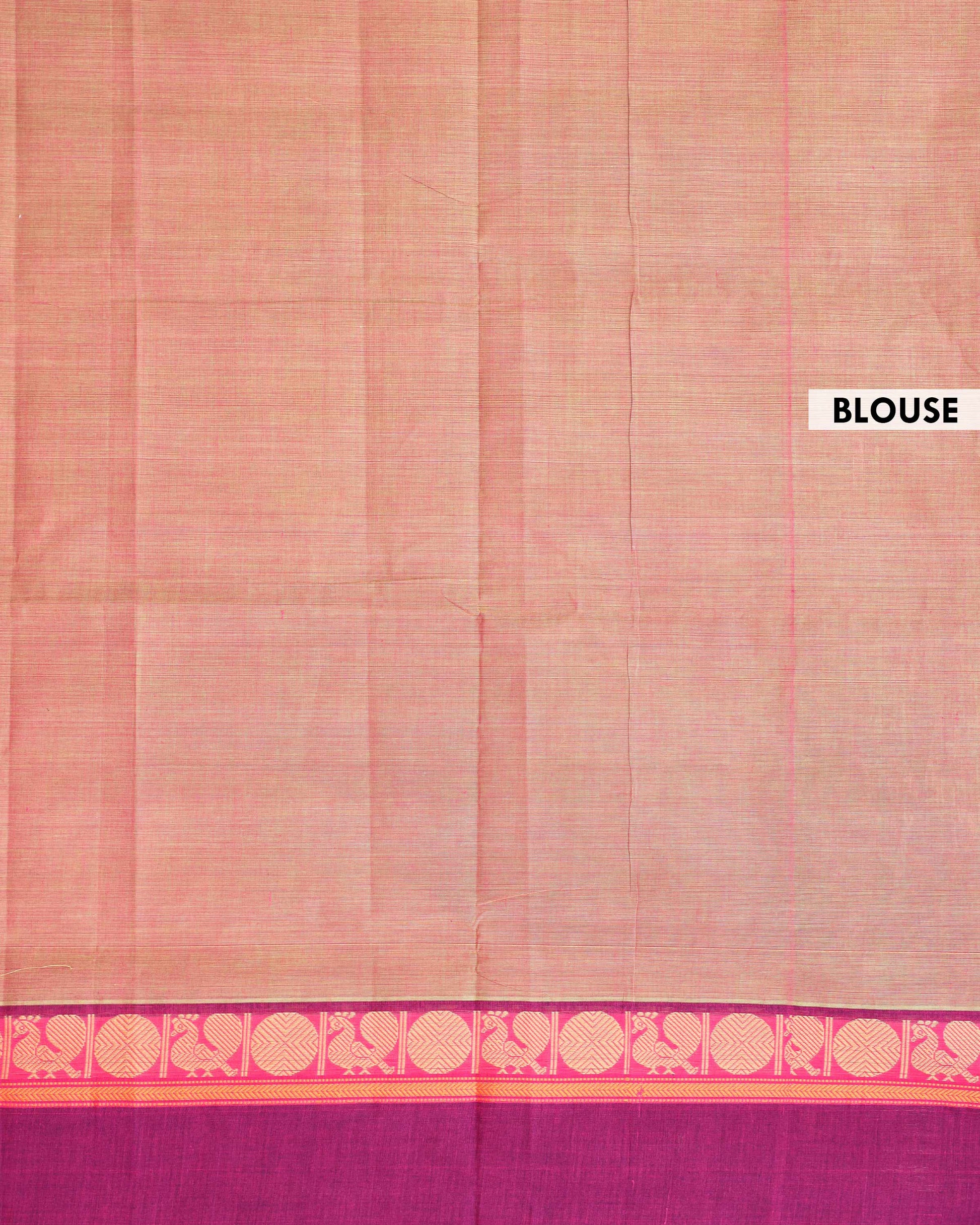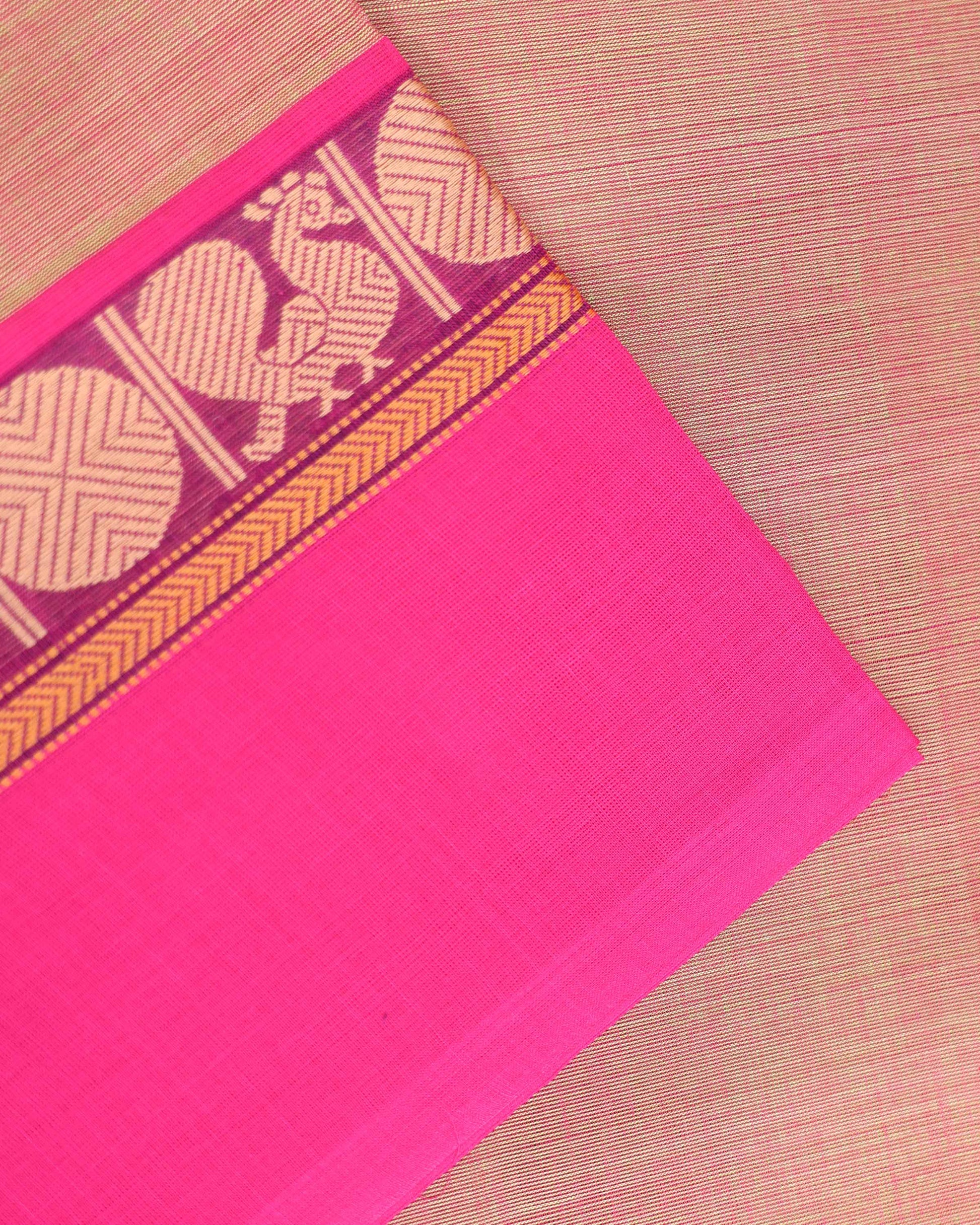 - Elevate your everyday style with this exquisite handloom Venkatagiri Cotton Saree a dual tone Olive Green body and a rich magenta purple border adorned with traditional peacock motifs,