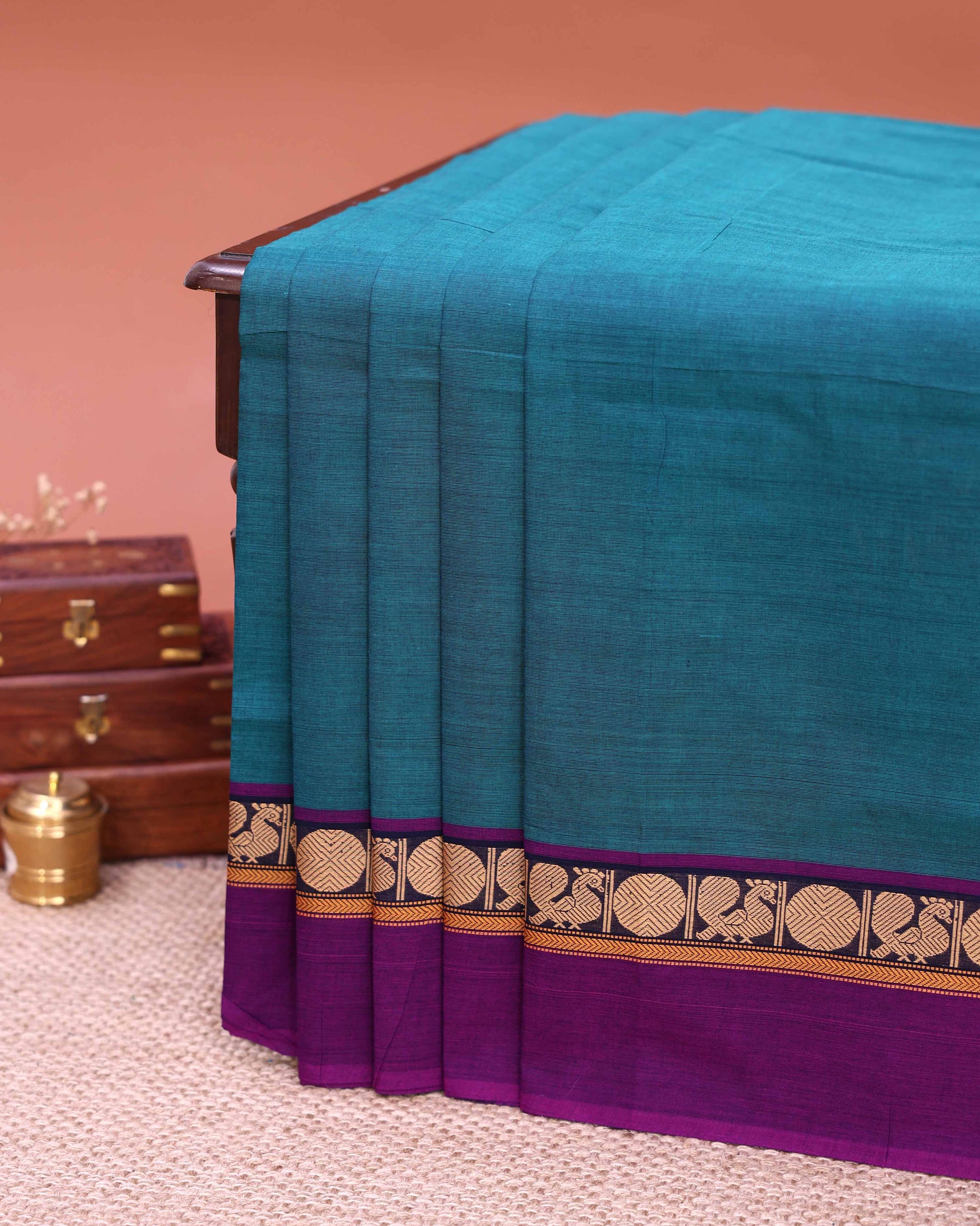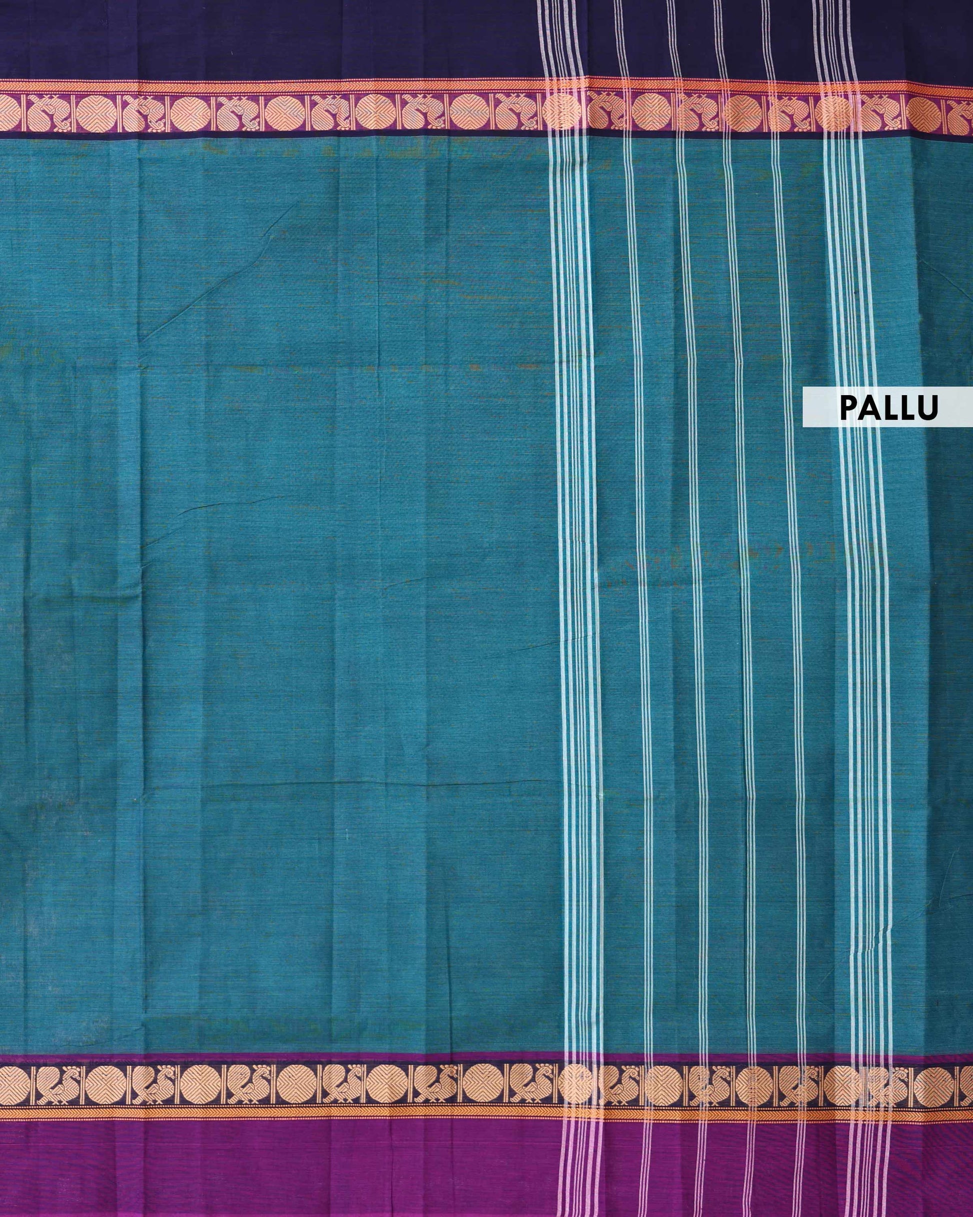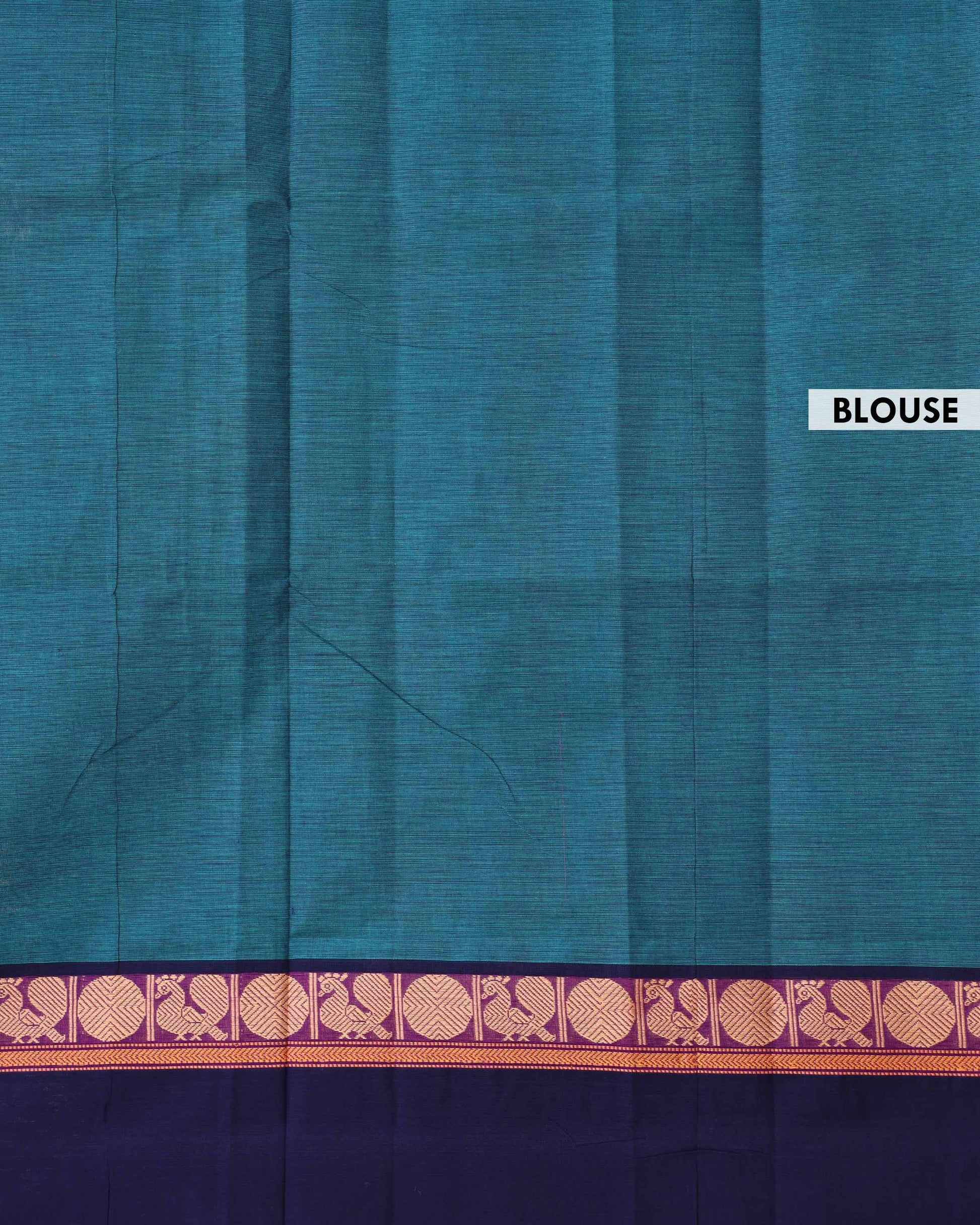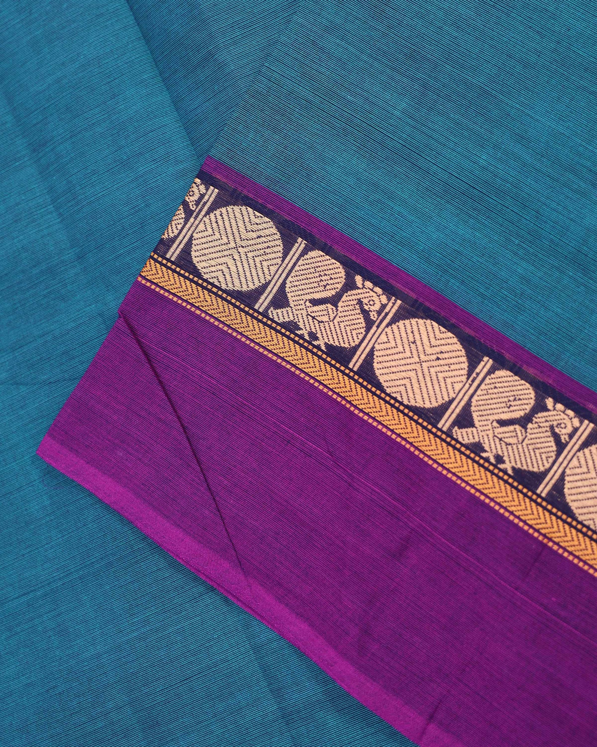 Traditional Venkatagiri Cotton Saree with Plain Body and Intricate Zari Woven Circular & Bird Motif Border - Teal