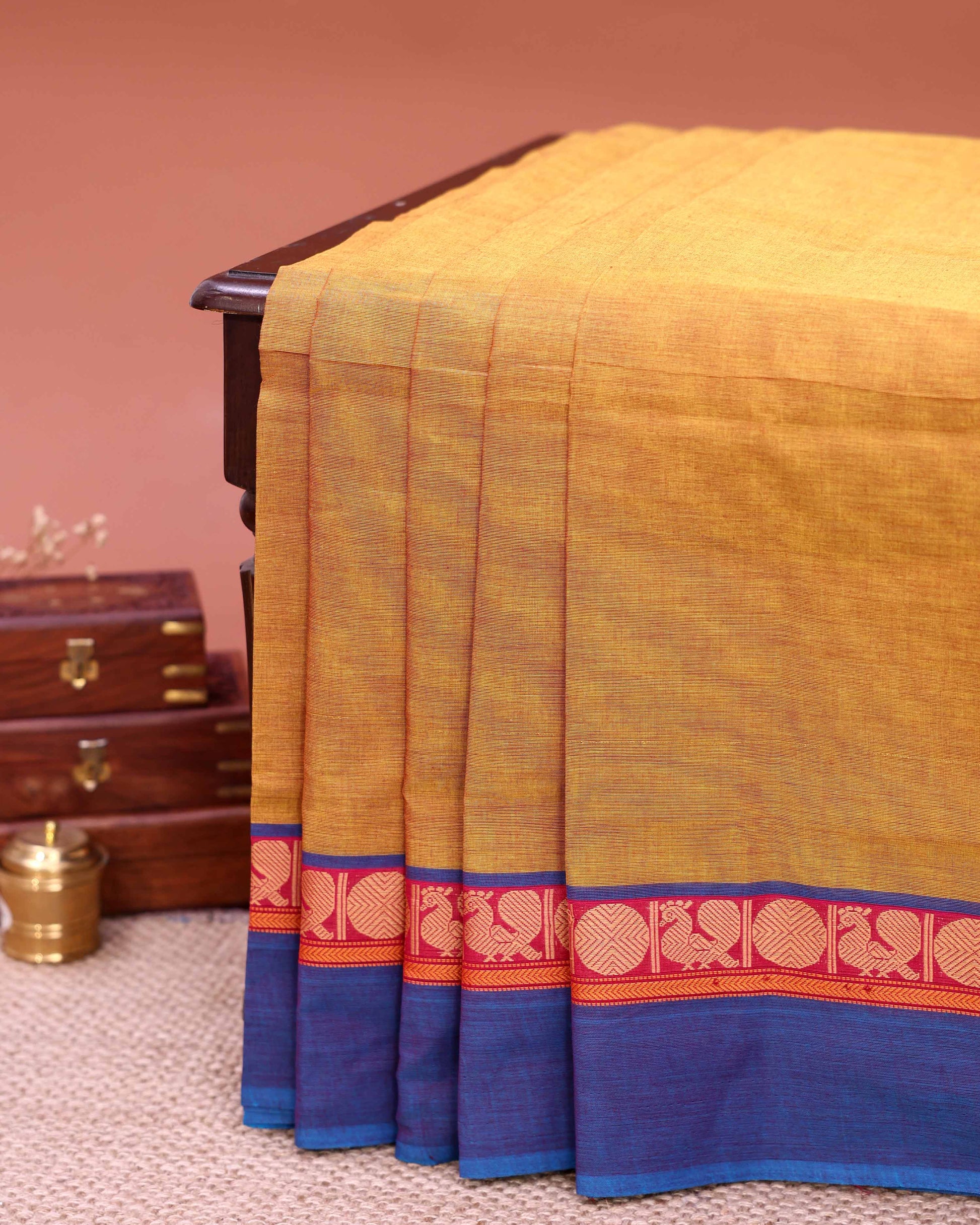 - The rich yellow is perfectly complemented by a traditional navy blue and pink border intricate peacock and geometric motifs blending comfort
