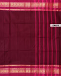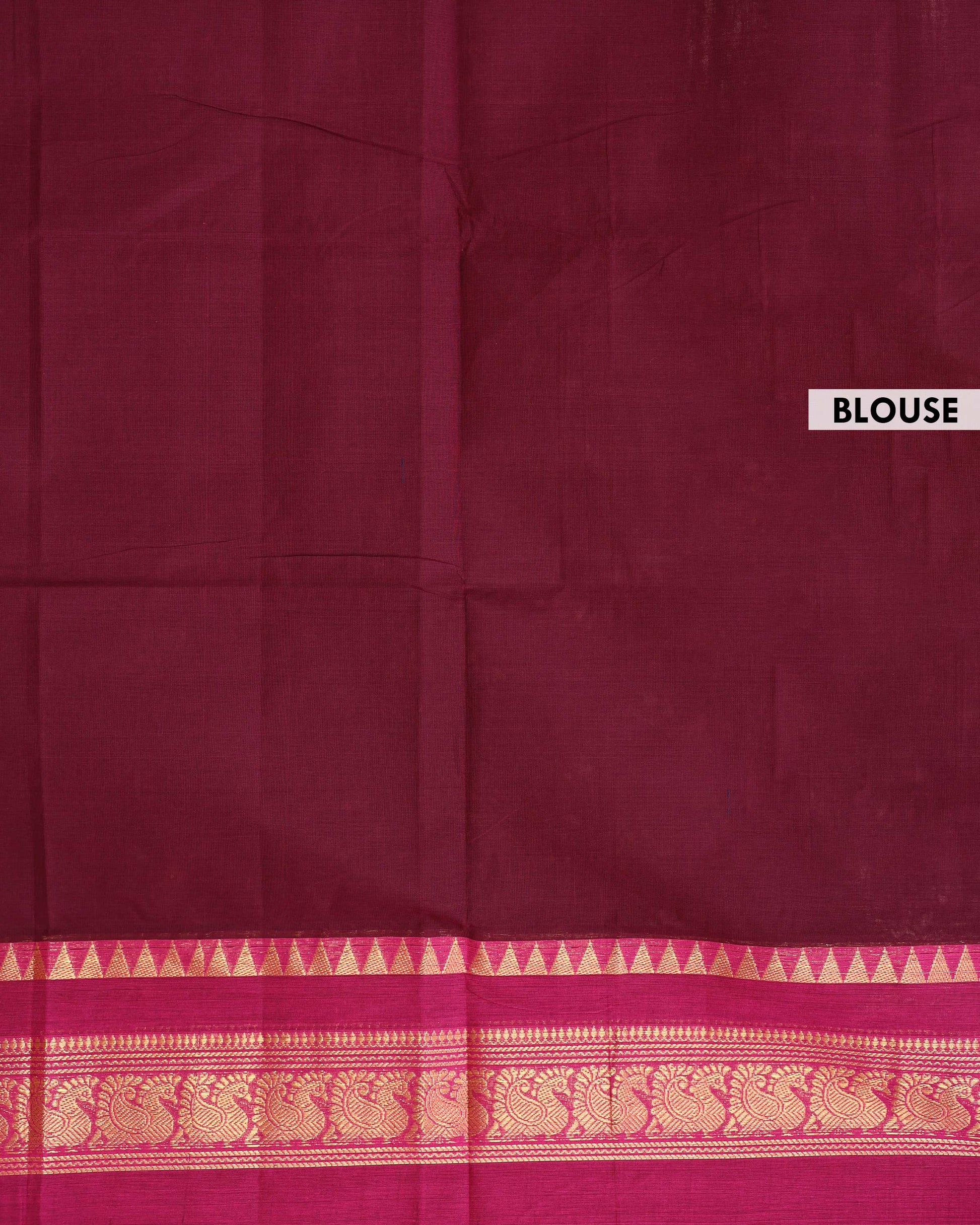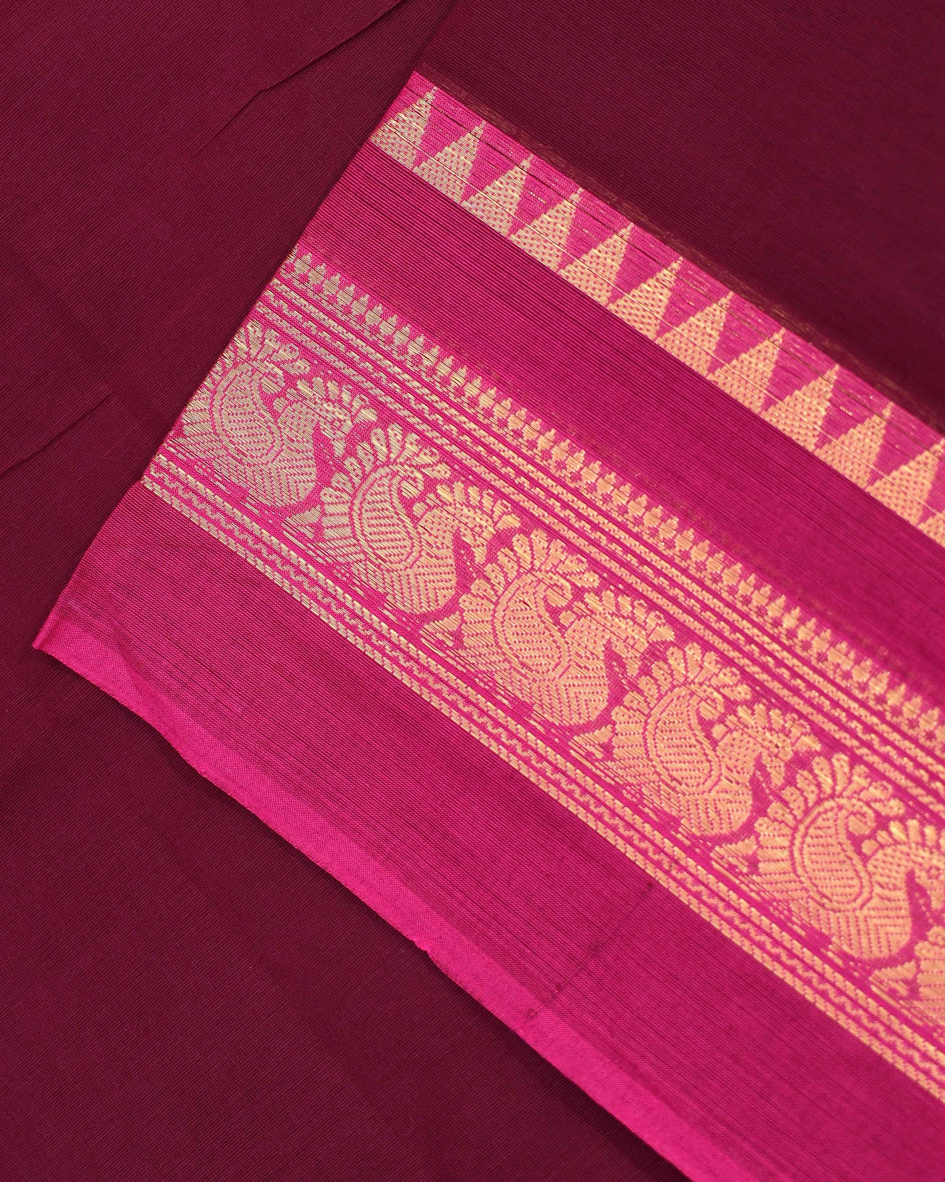 - This beautiful maroon Venkatagiri cotton saree features an elegant, contrasting pink border with intricate gold zari work.