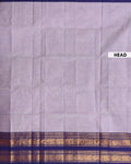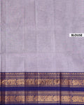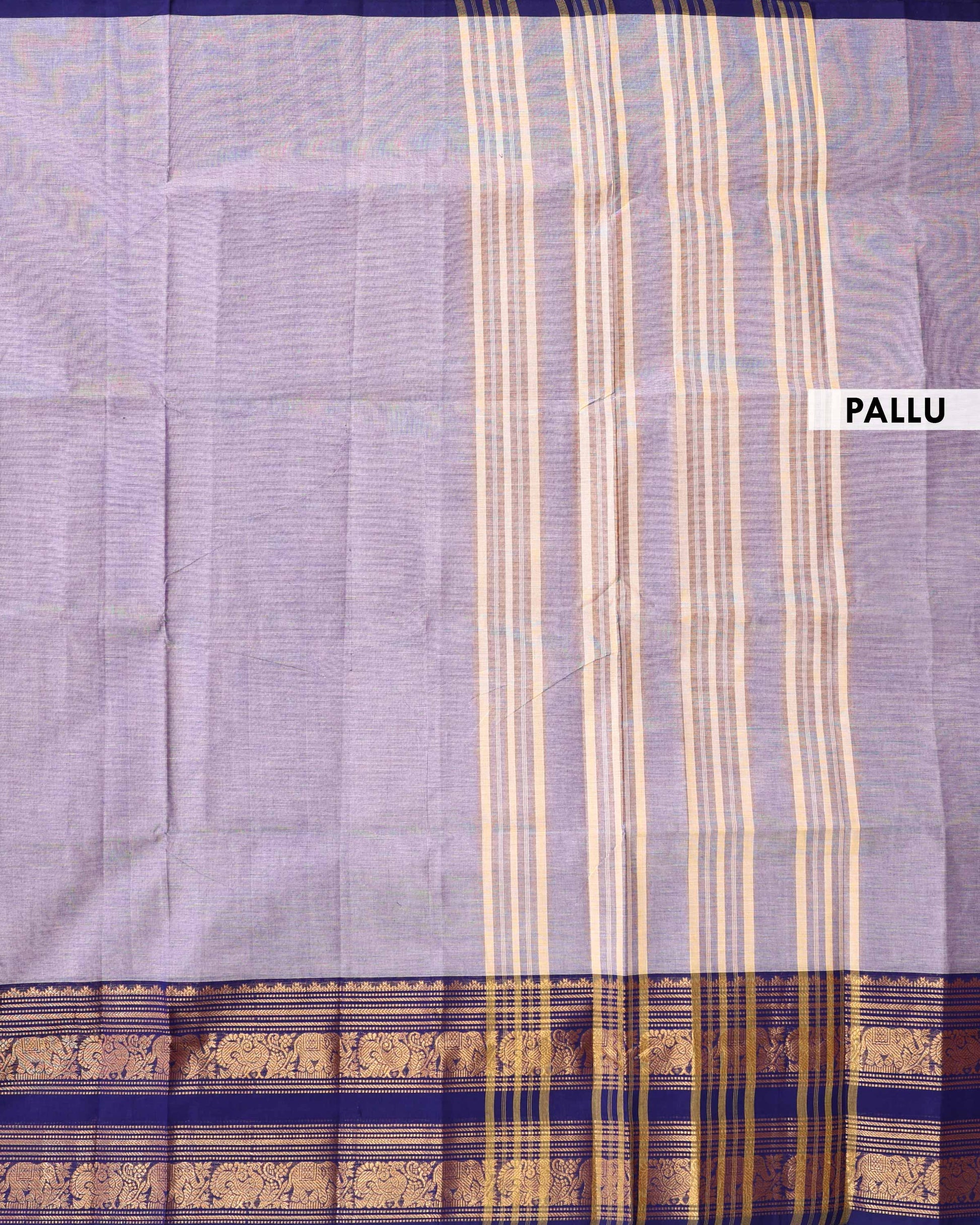 - This traditional handloom venkatagiri cotton saree in a classic grey and navy blue combination, features an elegant zari woven border with elephant motifs.