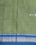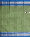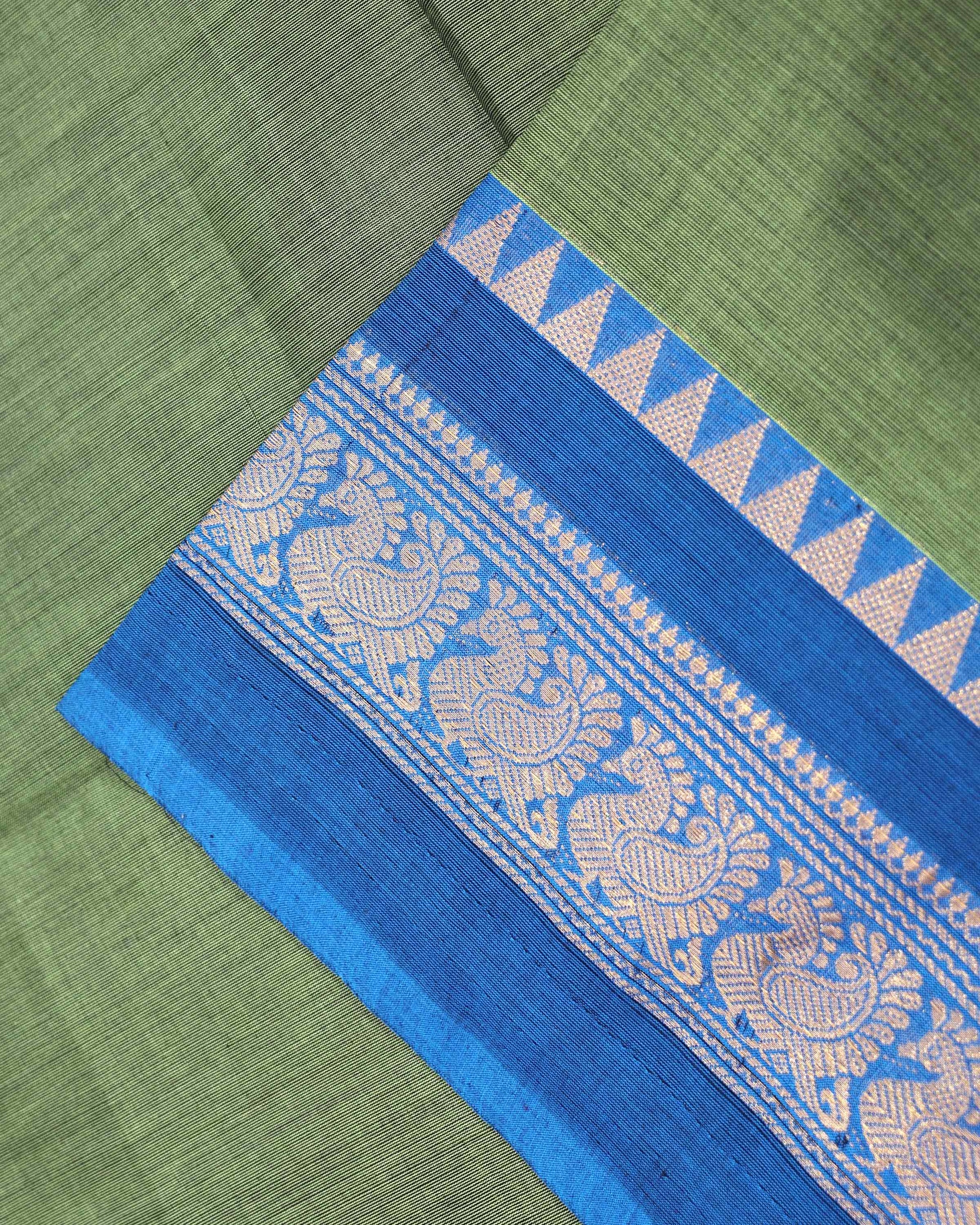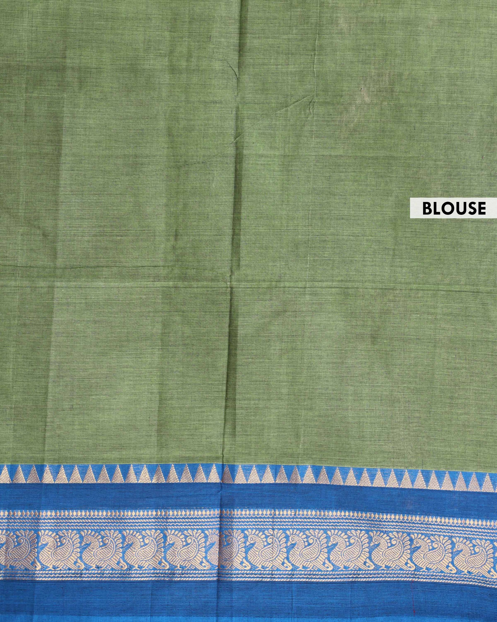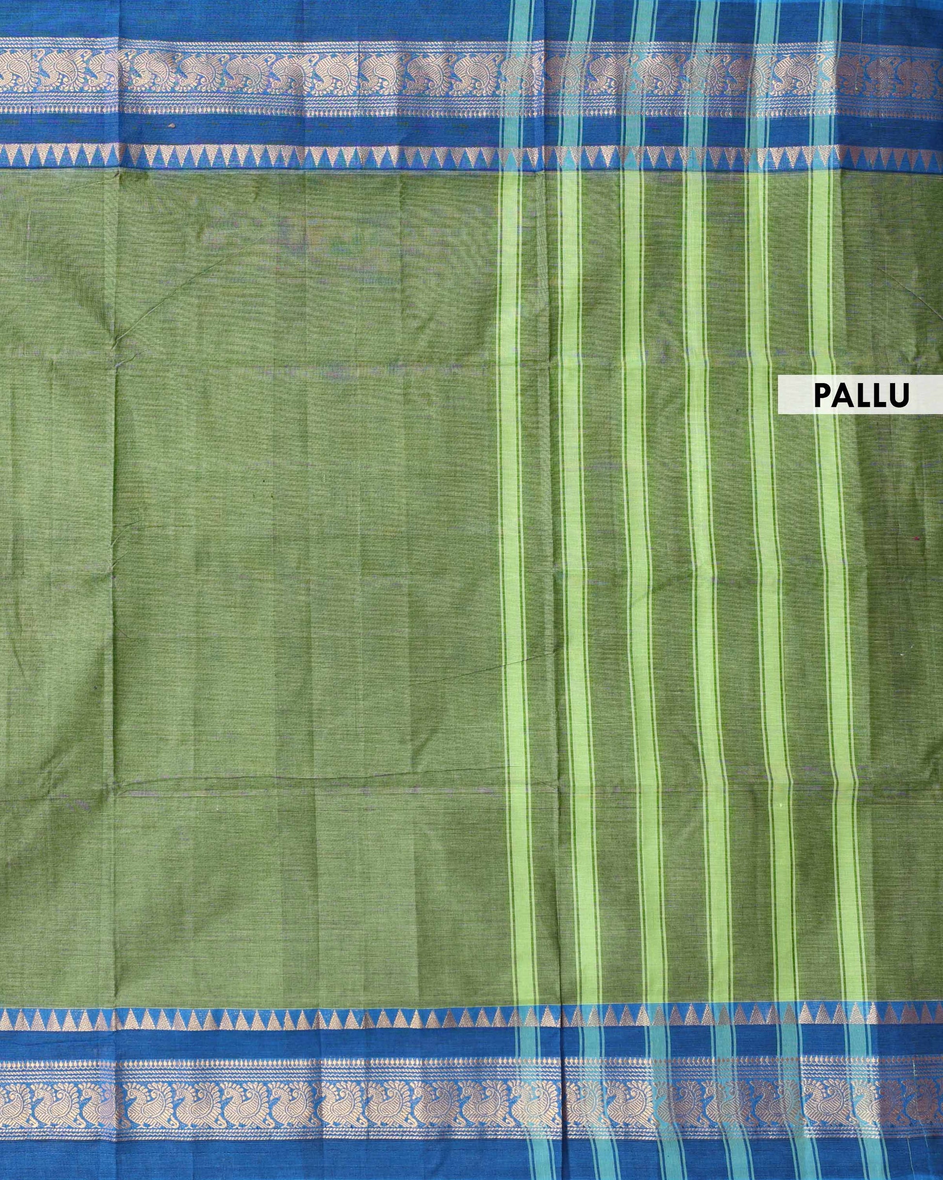 - Elegant Venkatagiri cotton saree in a vibrant green a rich blue border adorned with traditional peacock motifs.