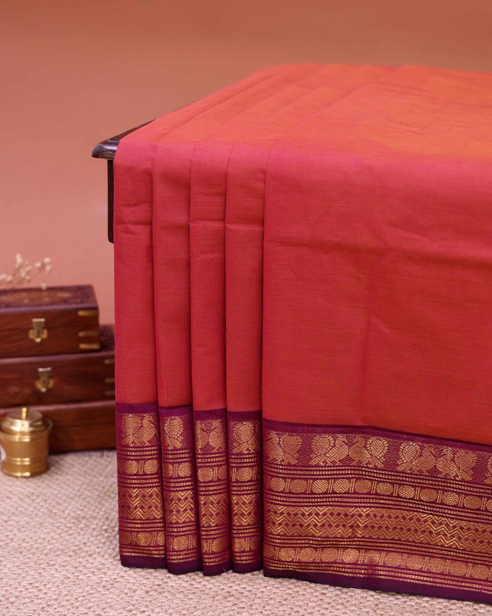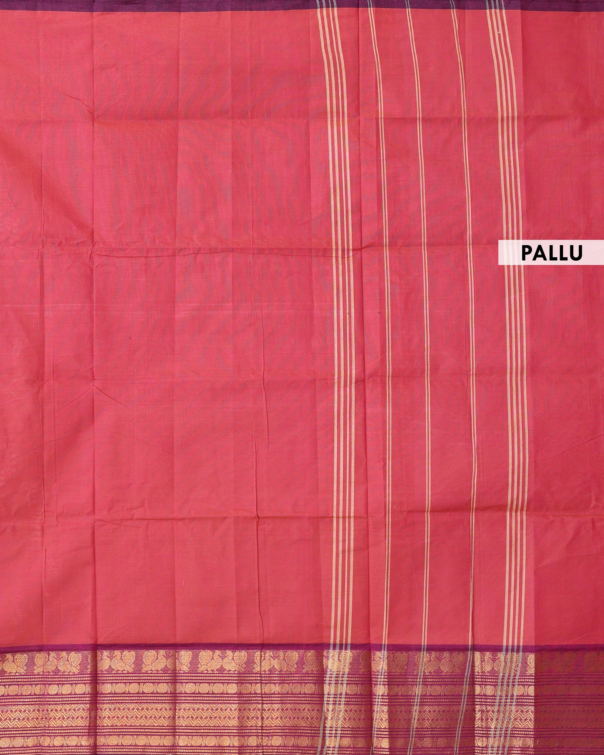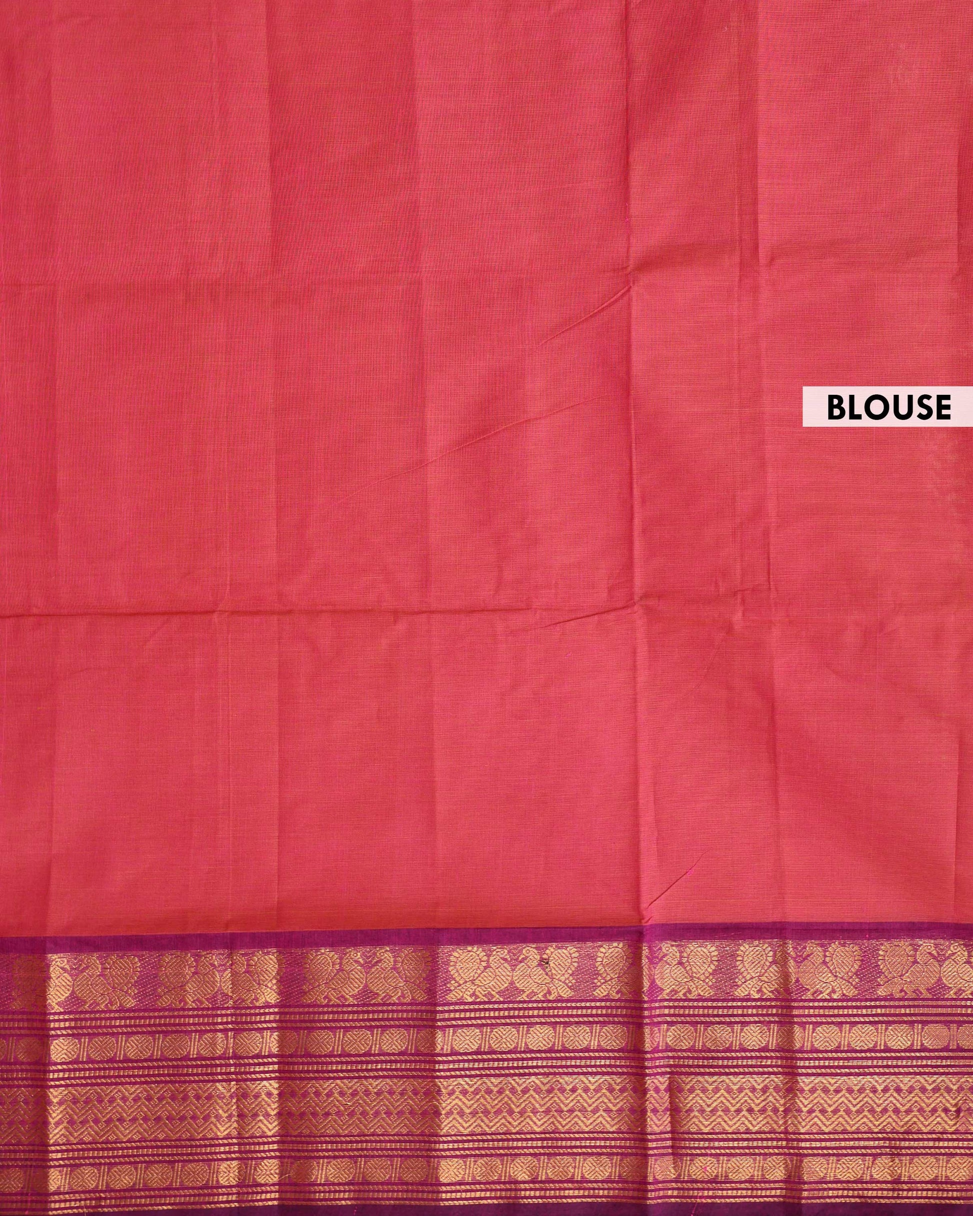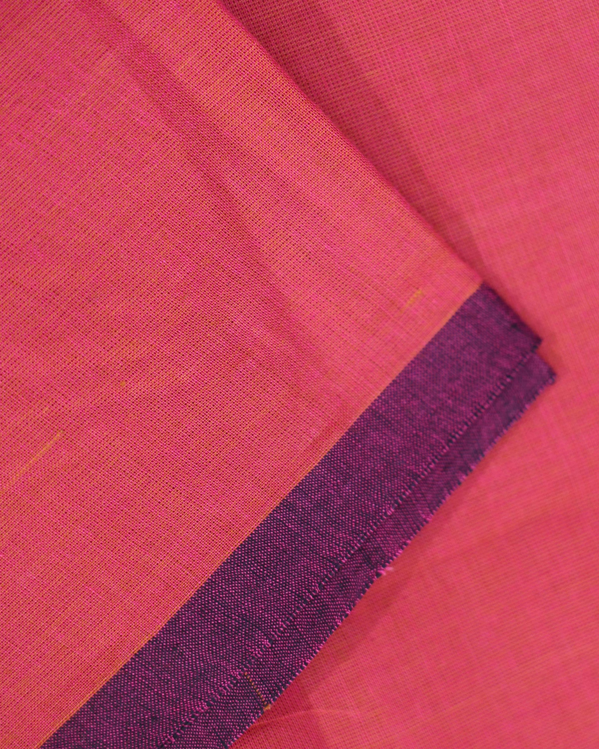 - Elevate your style with this stunning handwoven Venkatagiri cotton saree a vibrant rust pink body and a rich, contrasting purple zari border.