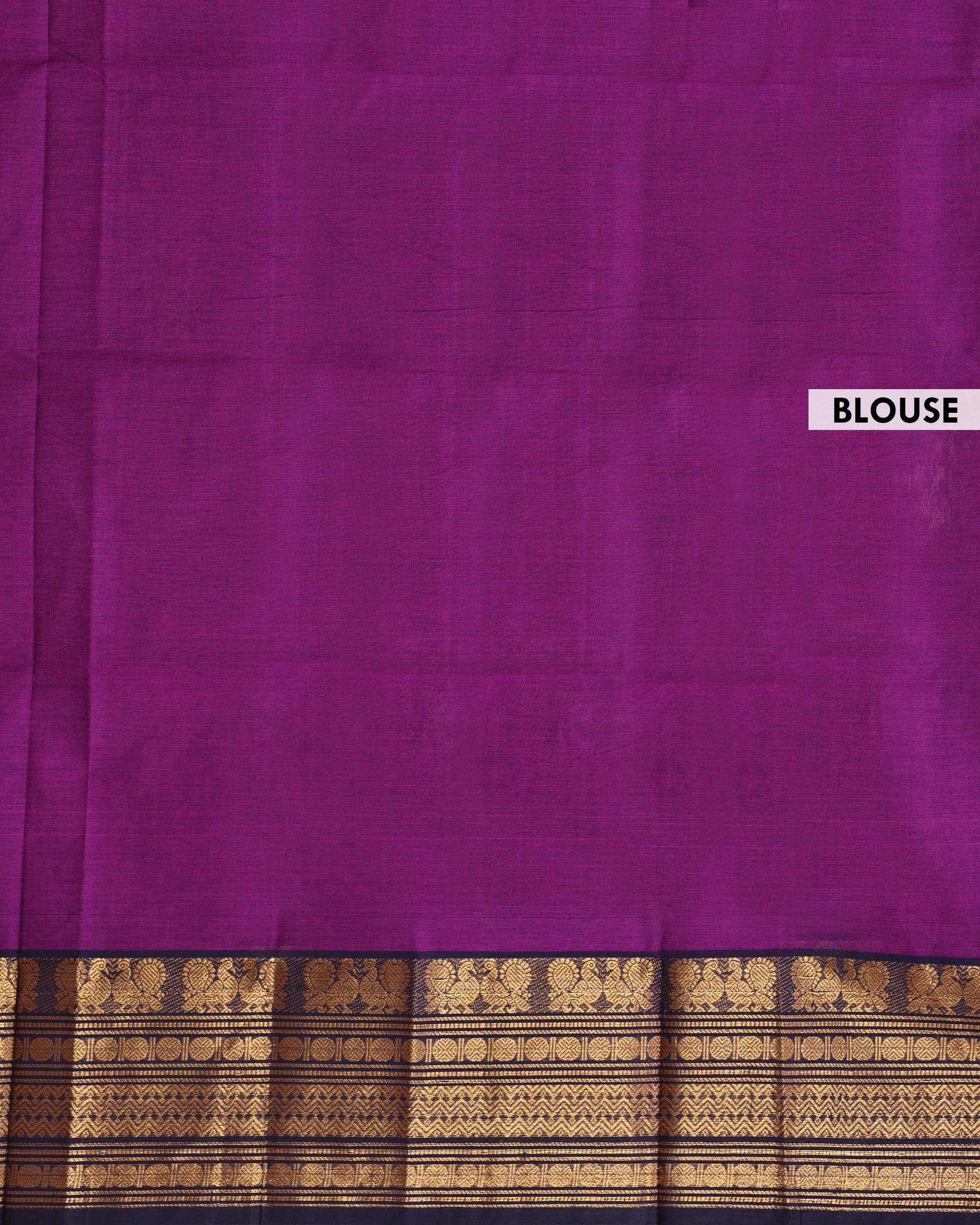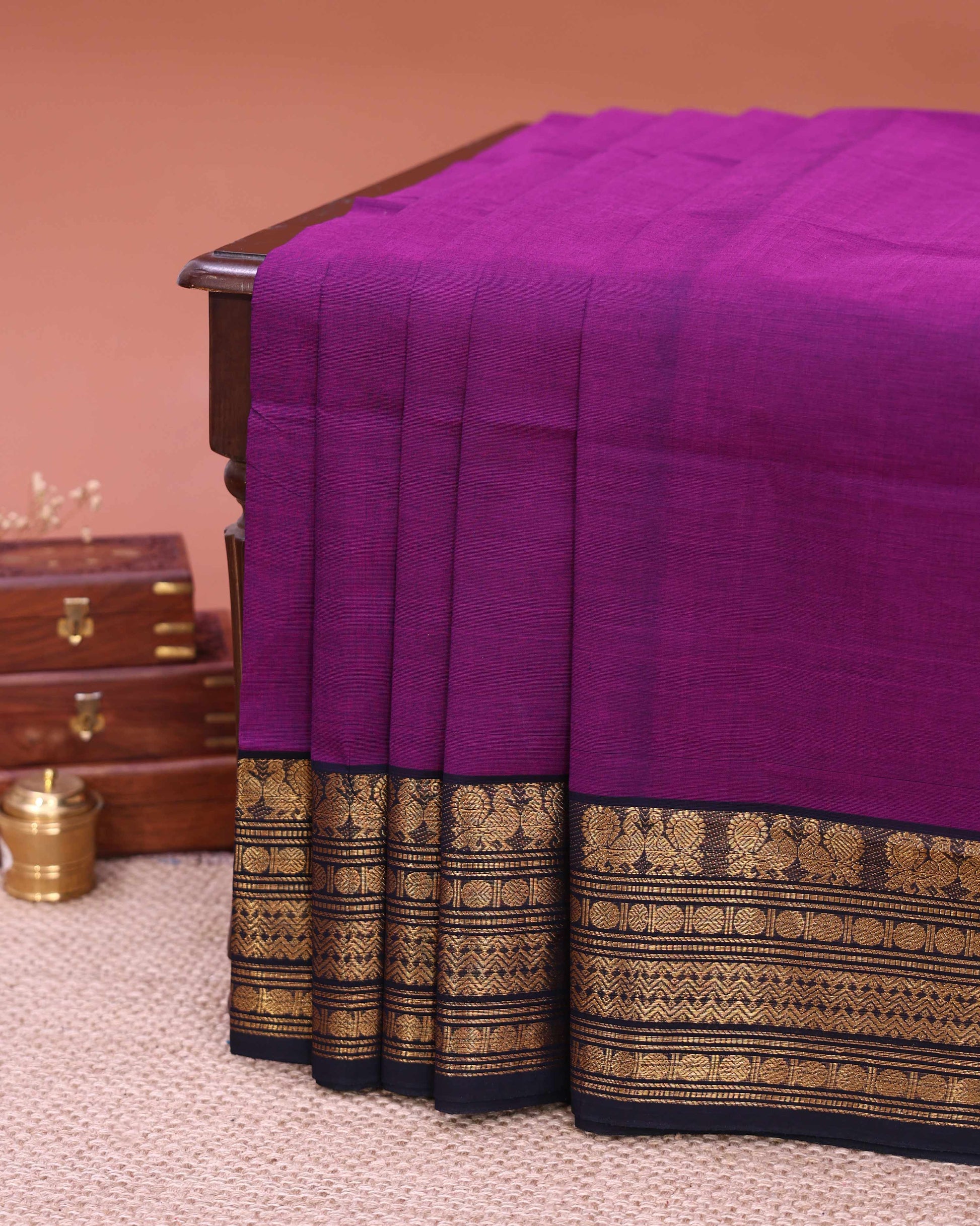 - This stunning Royal Purple Venkatagiri Cotton Saree a rich wide contrast border with traditional peacock motifs in antique gold zari