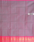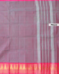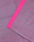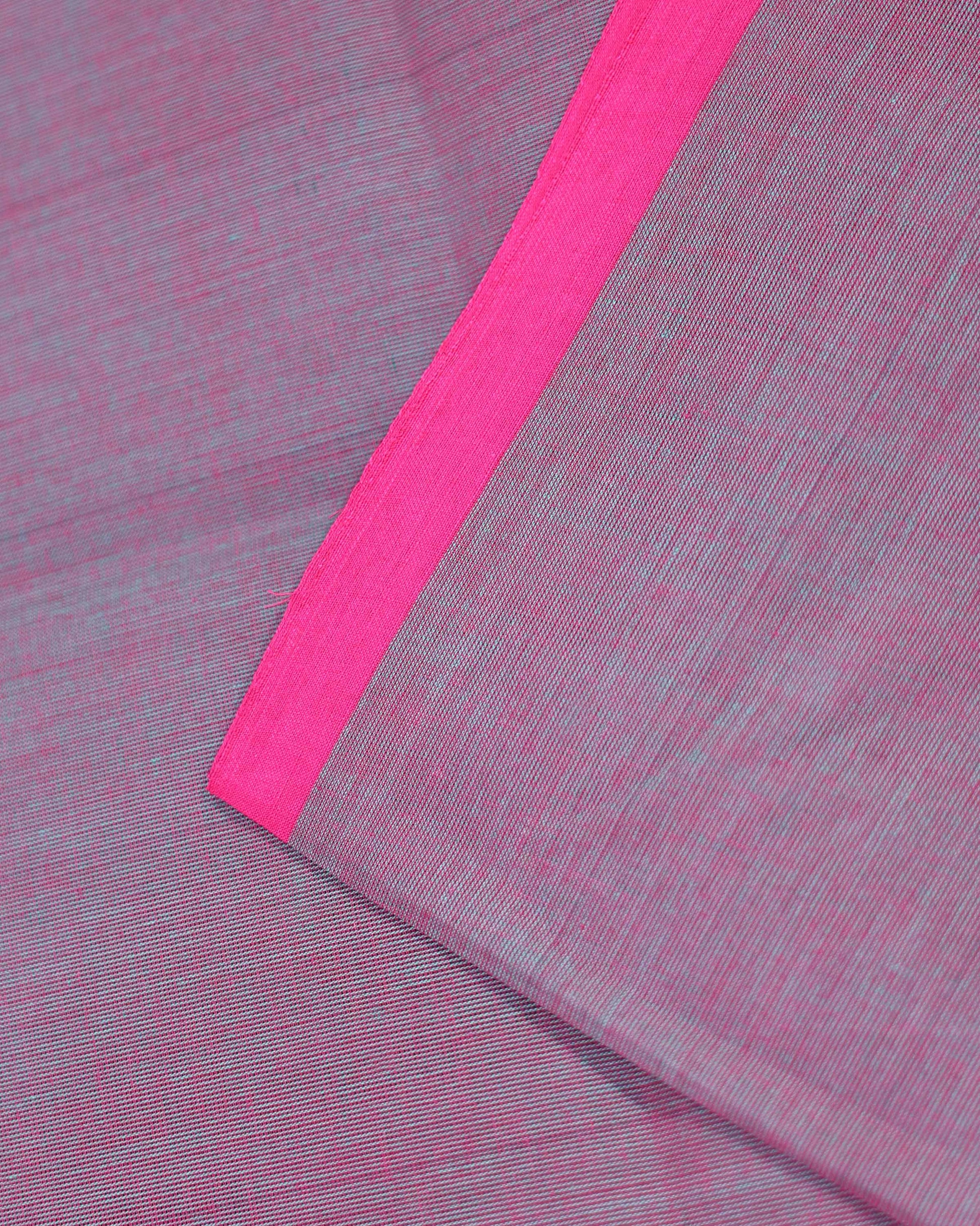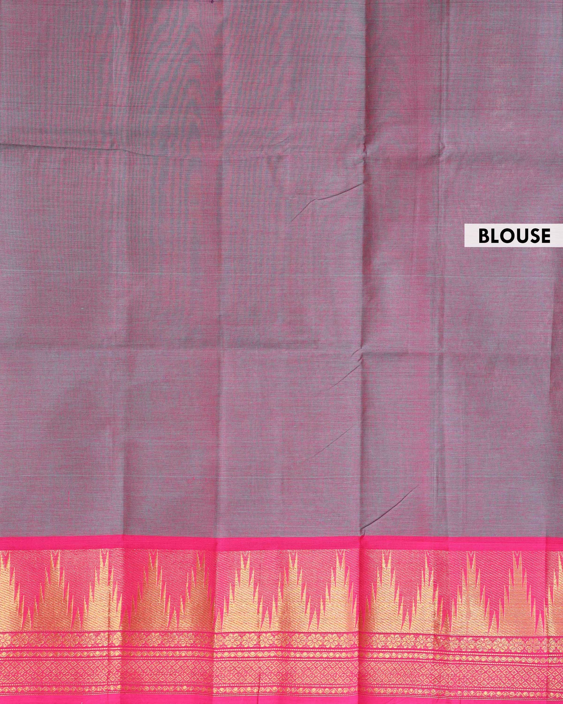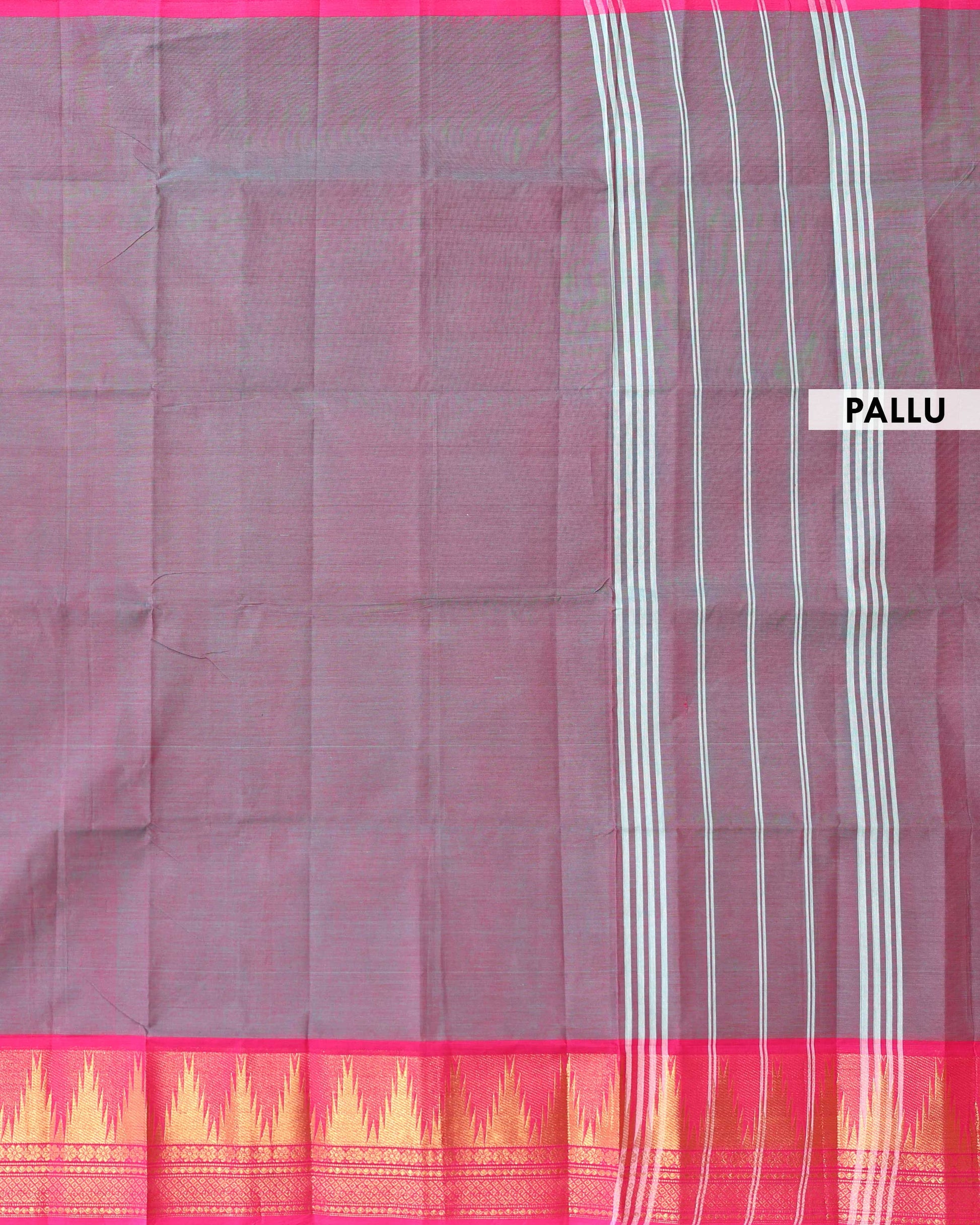 - This handwoven dual tone grey and purple venkatagiri cotton saree a striking contrast with a vibrant pink border adorned with traditional gold zari motifs.