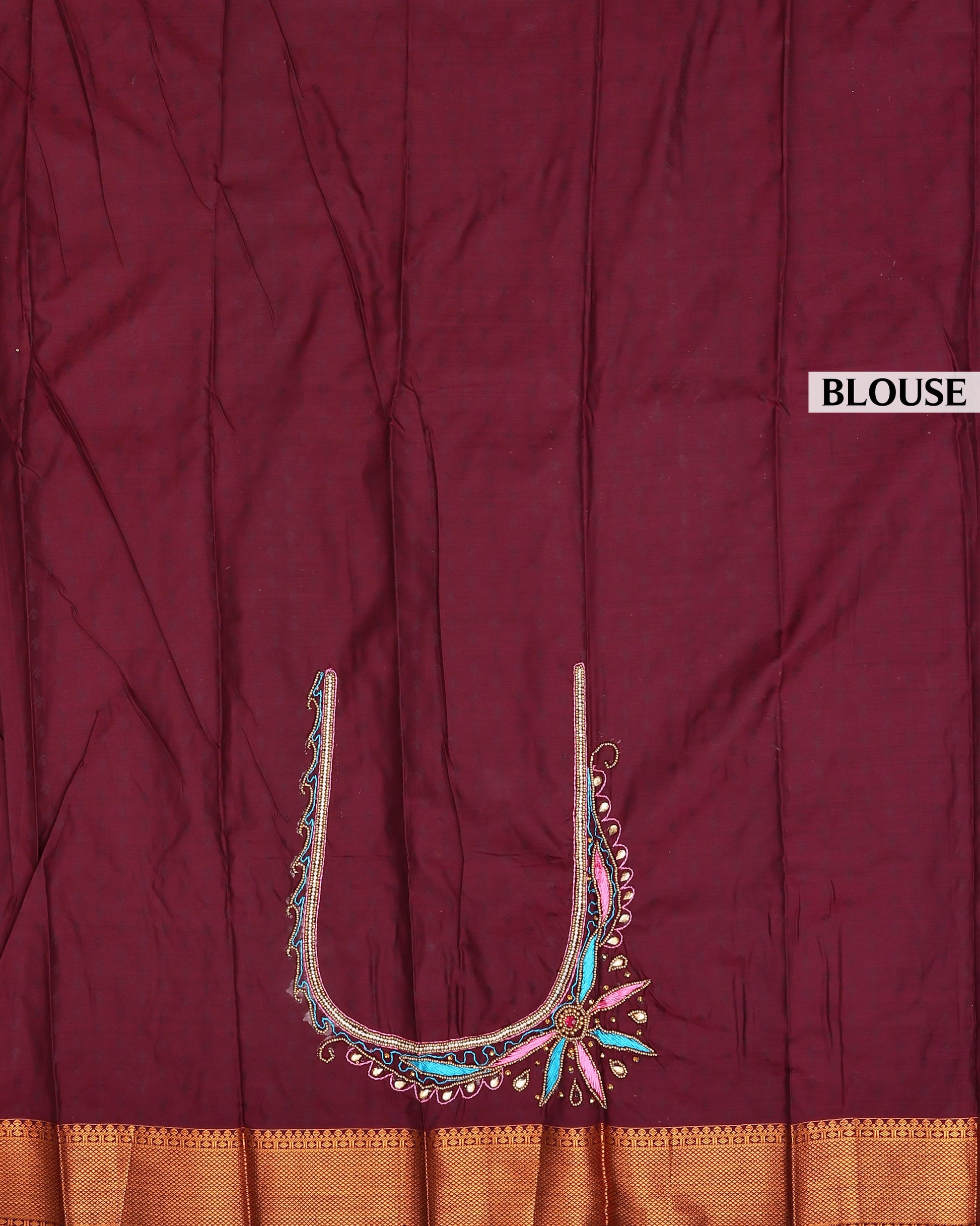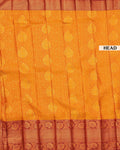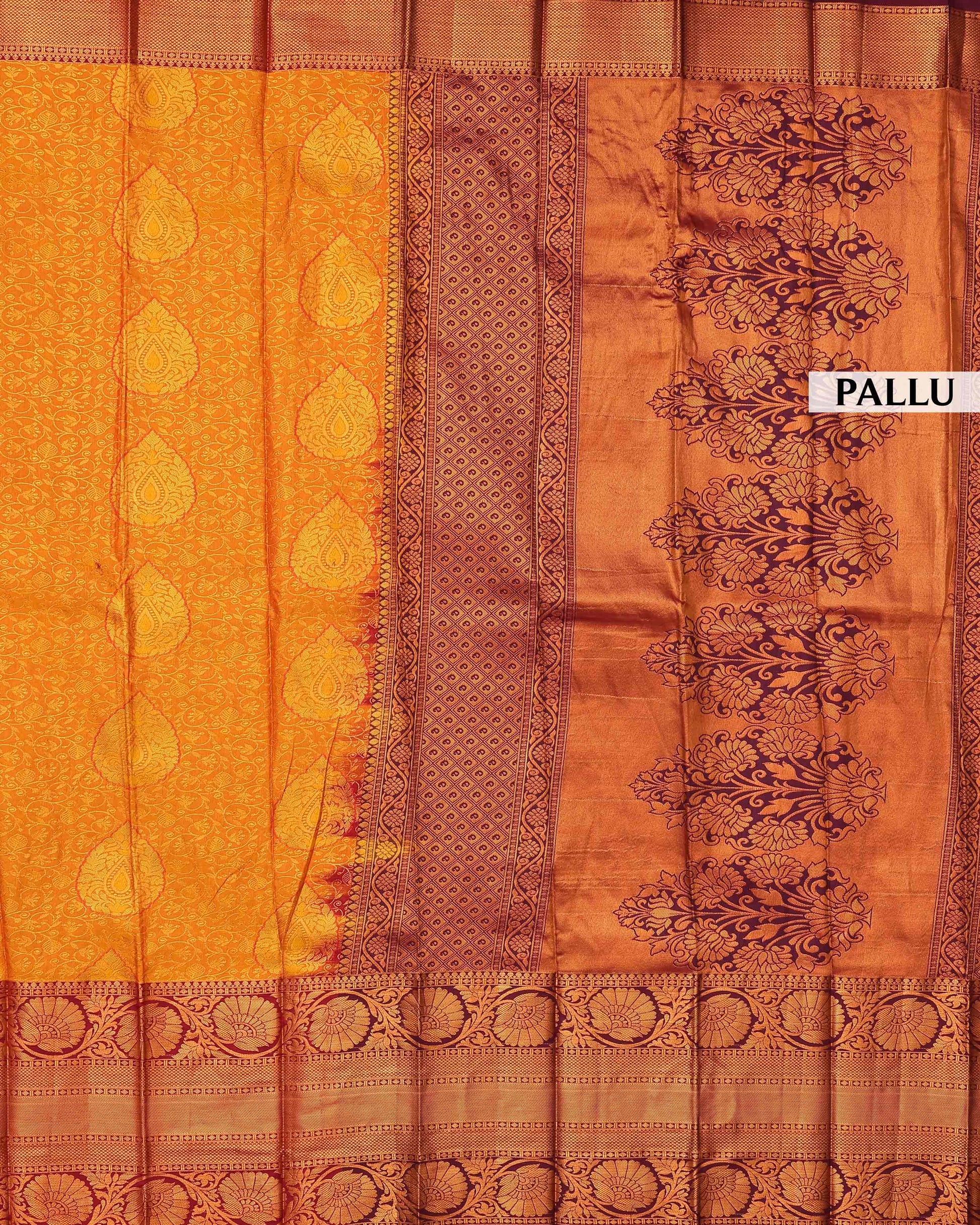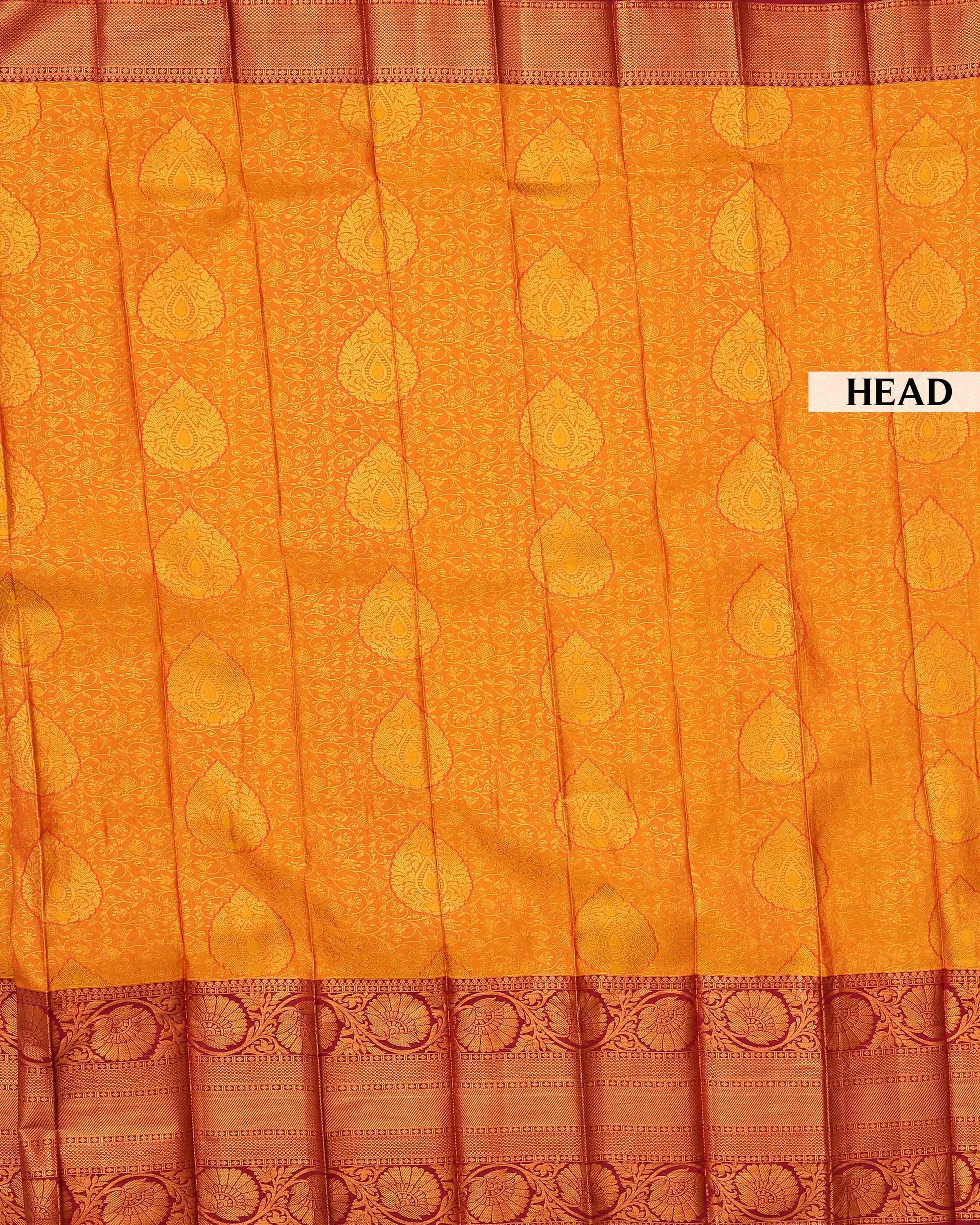 - This premium Kanchipuram silk saree a vibrant mustard yellow body with a traditional maroon and gold zari border.