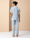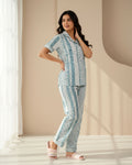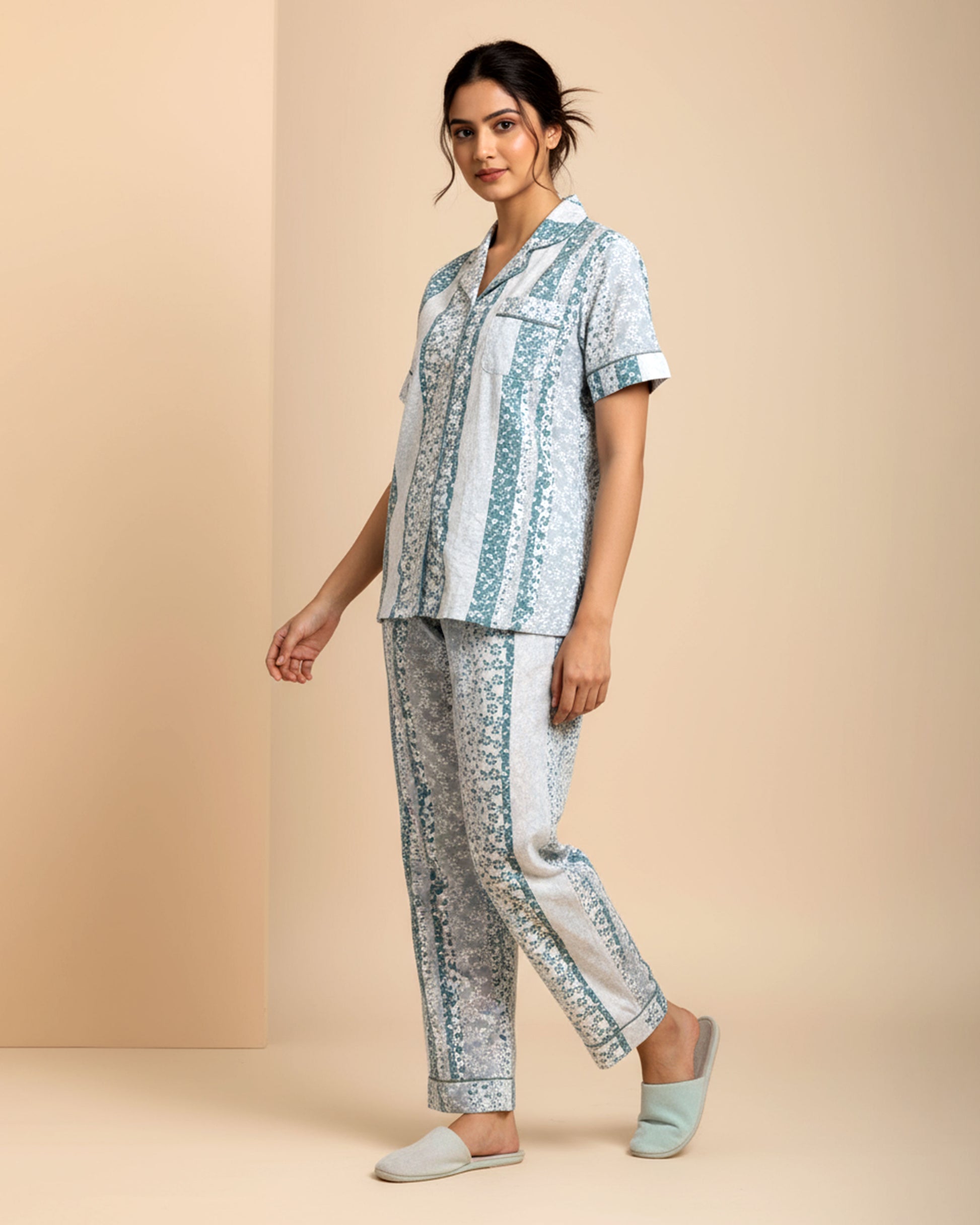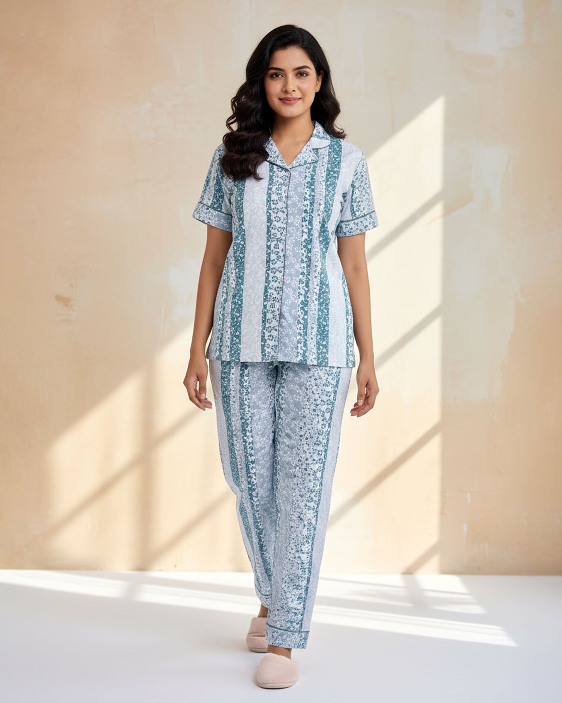 Indulge in comfort with this women's cotton night suit set a delightful floral and stripe print pattern