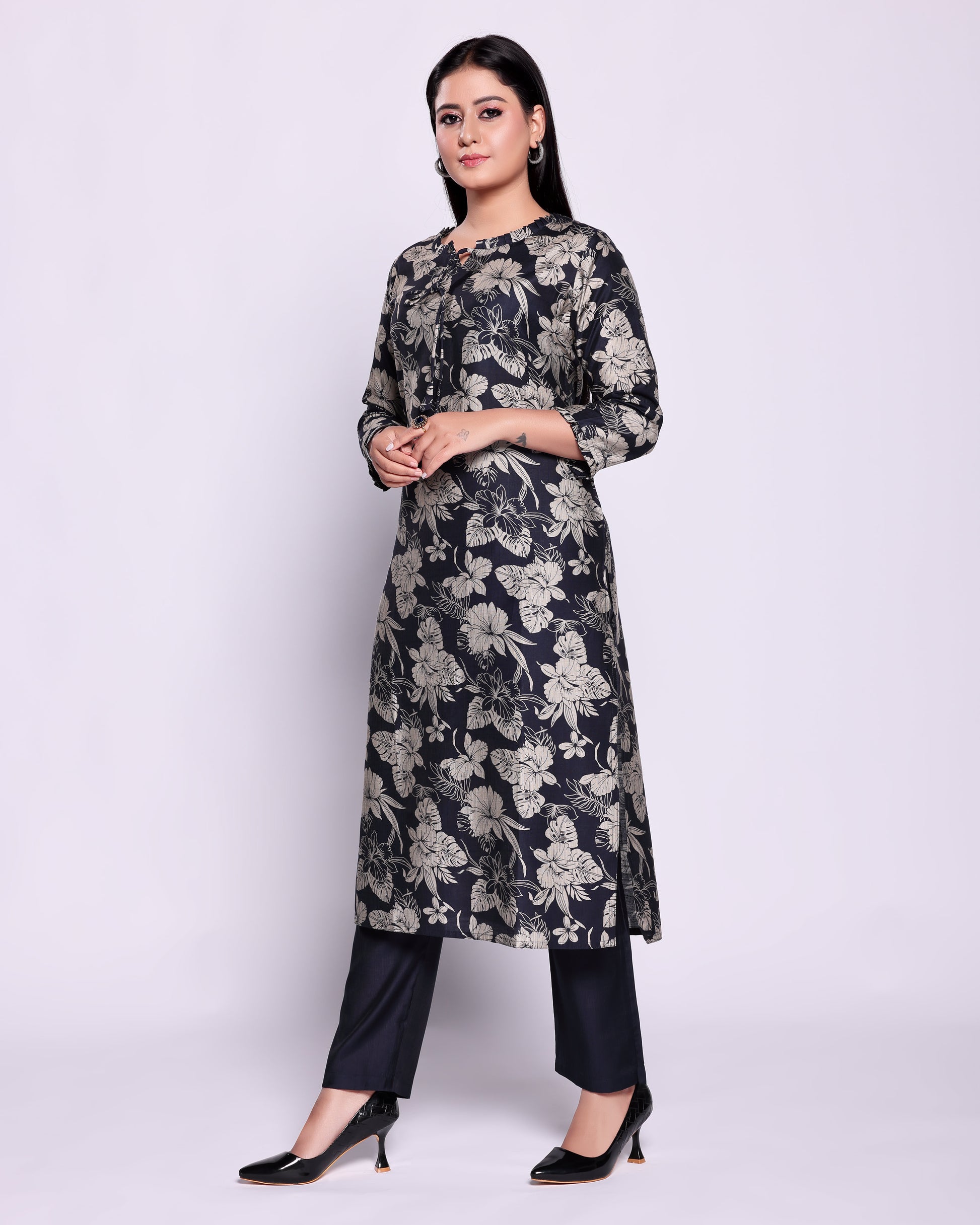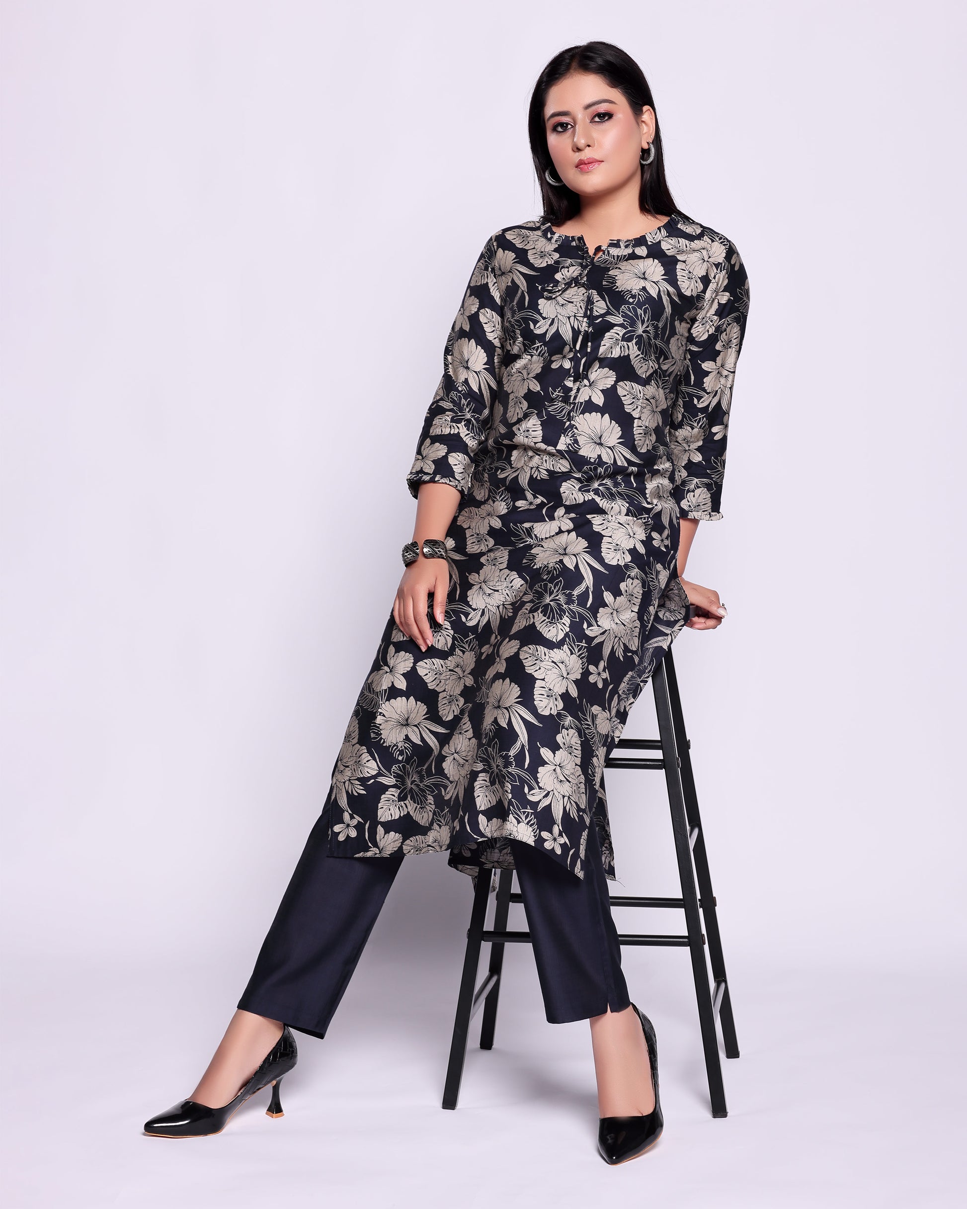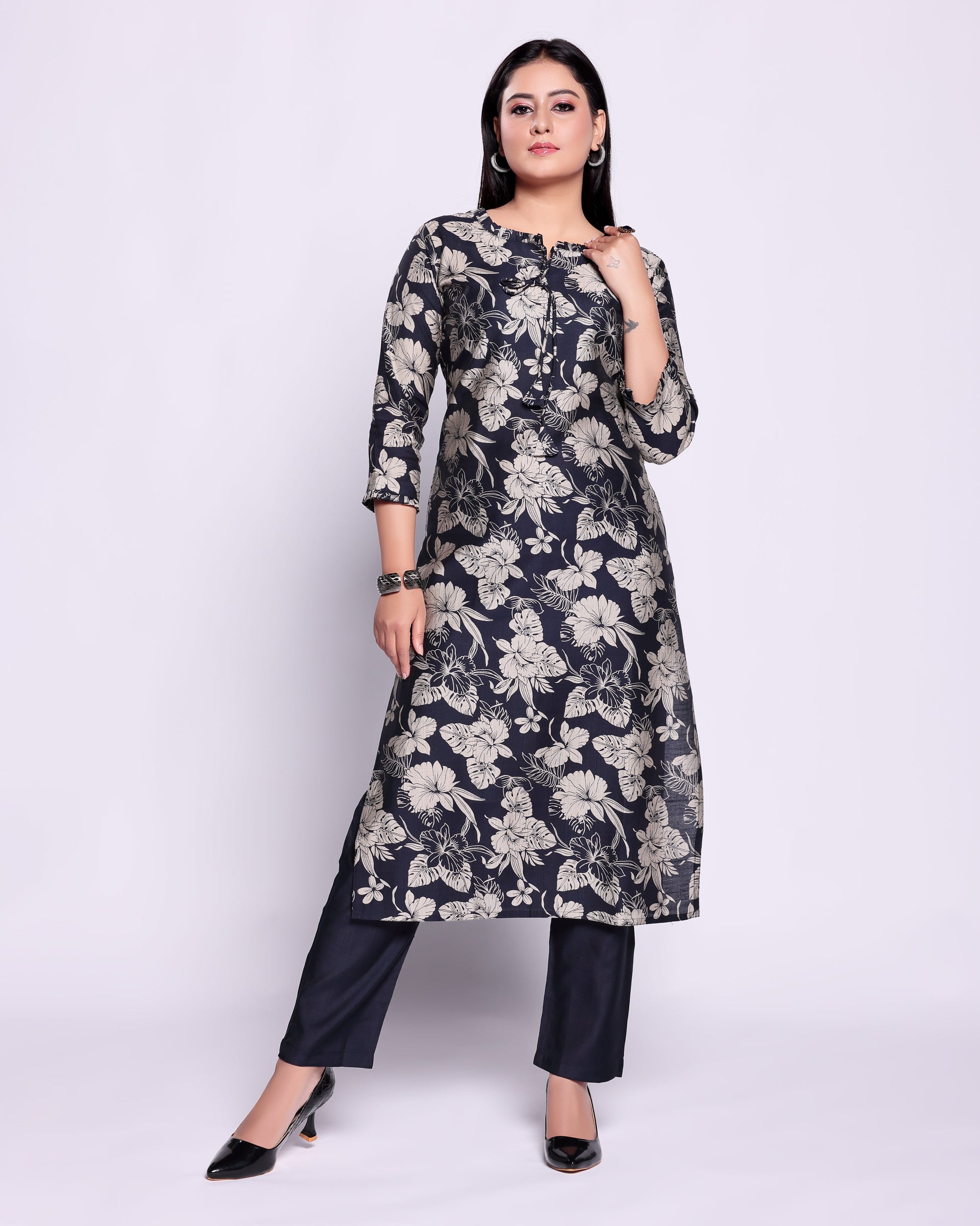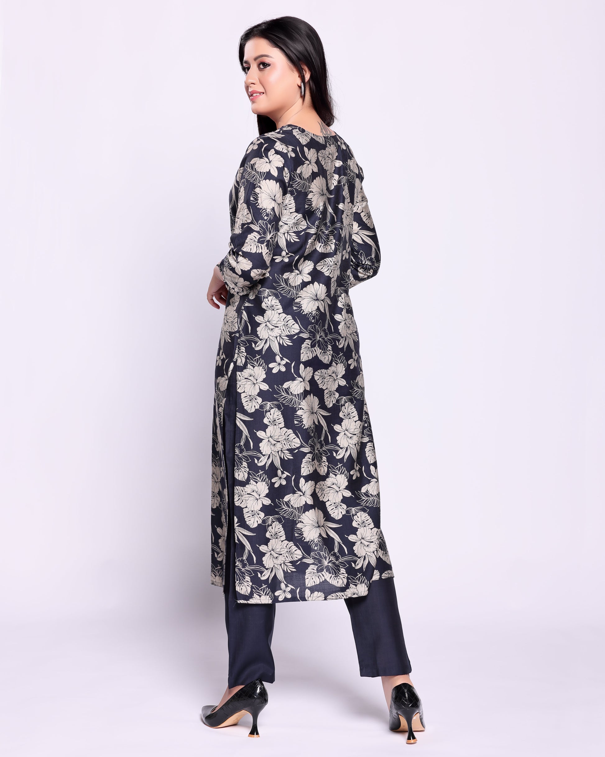- This elegant navy blue kurta and palazzo pant set a sophisticated all over floral print perfect for both casual and festive occasions.