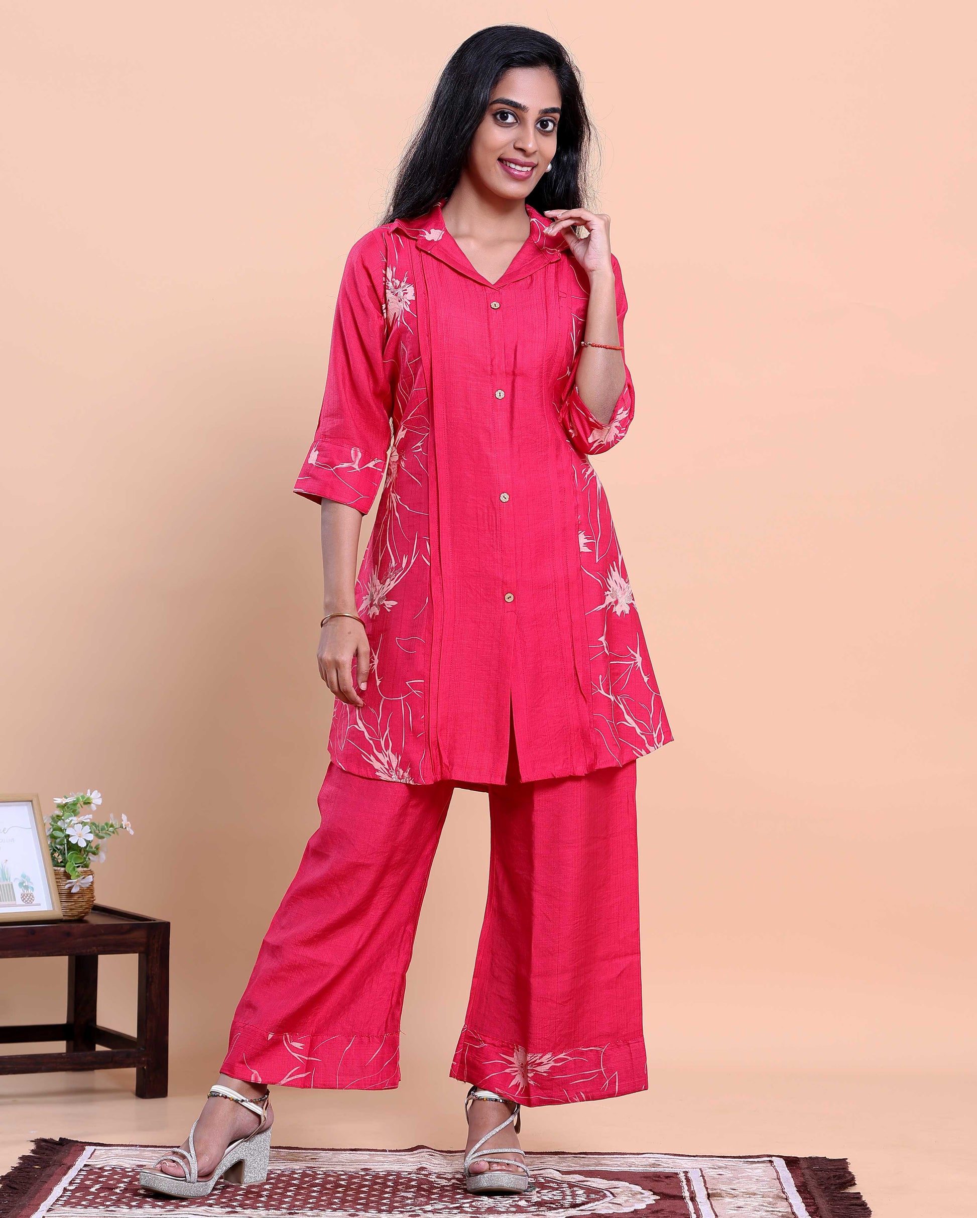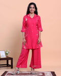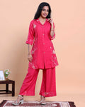 Women’s Embroidered Shirt-Collar Kurta with Wide-Leg Pants - Dark Pink