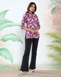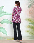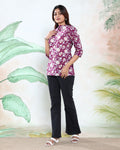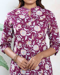 Women’s Floral Printed Straight Cut Kurti with Mandarin Collar Front Button Placket & 3/4th Sleeves - Purple