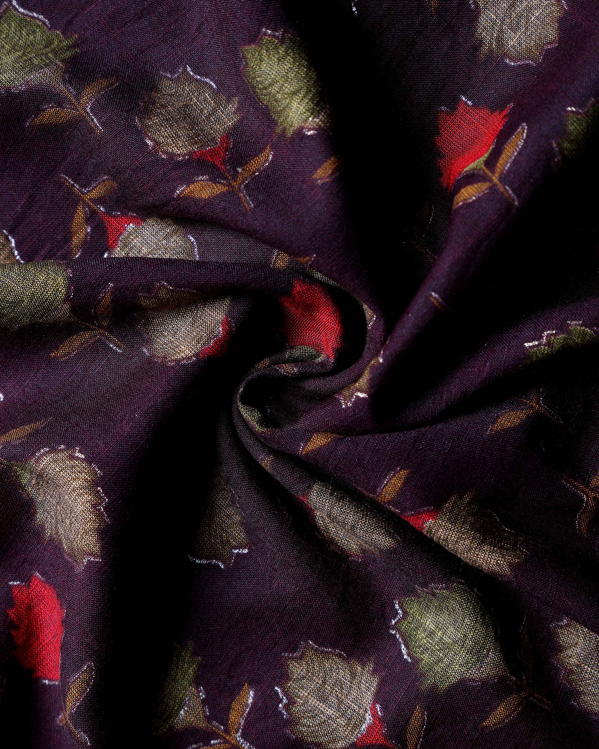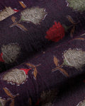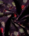 - This rich, dark purple blouse material features intricate floral embroidery in green and red, offering a luxurious feel for elegant ethnic wear designs.