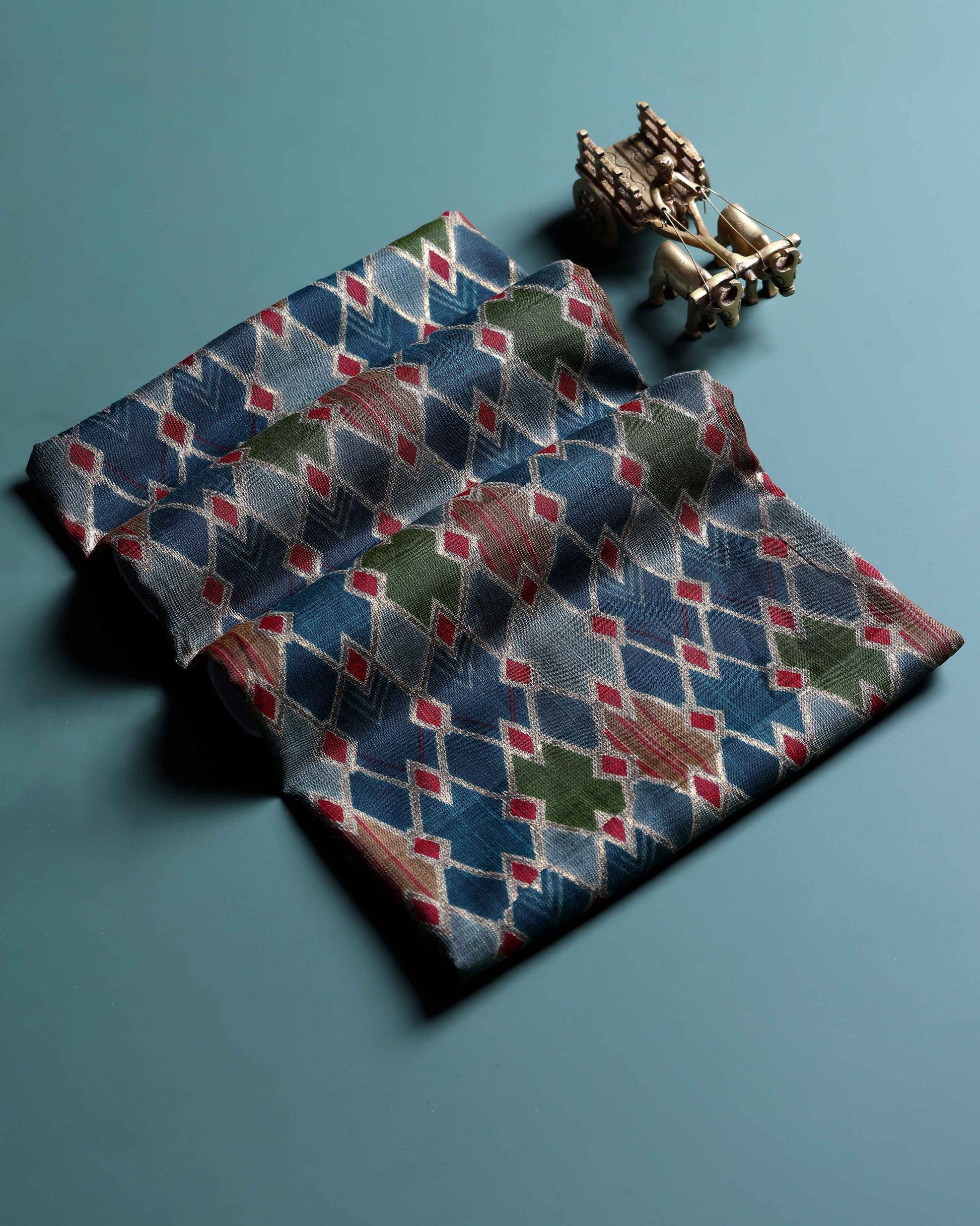 - Elevate your ethnic wardrobe with this rich textured fabric featuring a vibrant mix of blue, green and red hues.